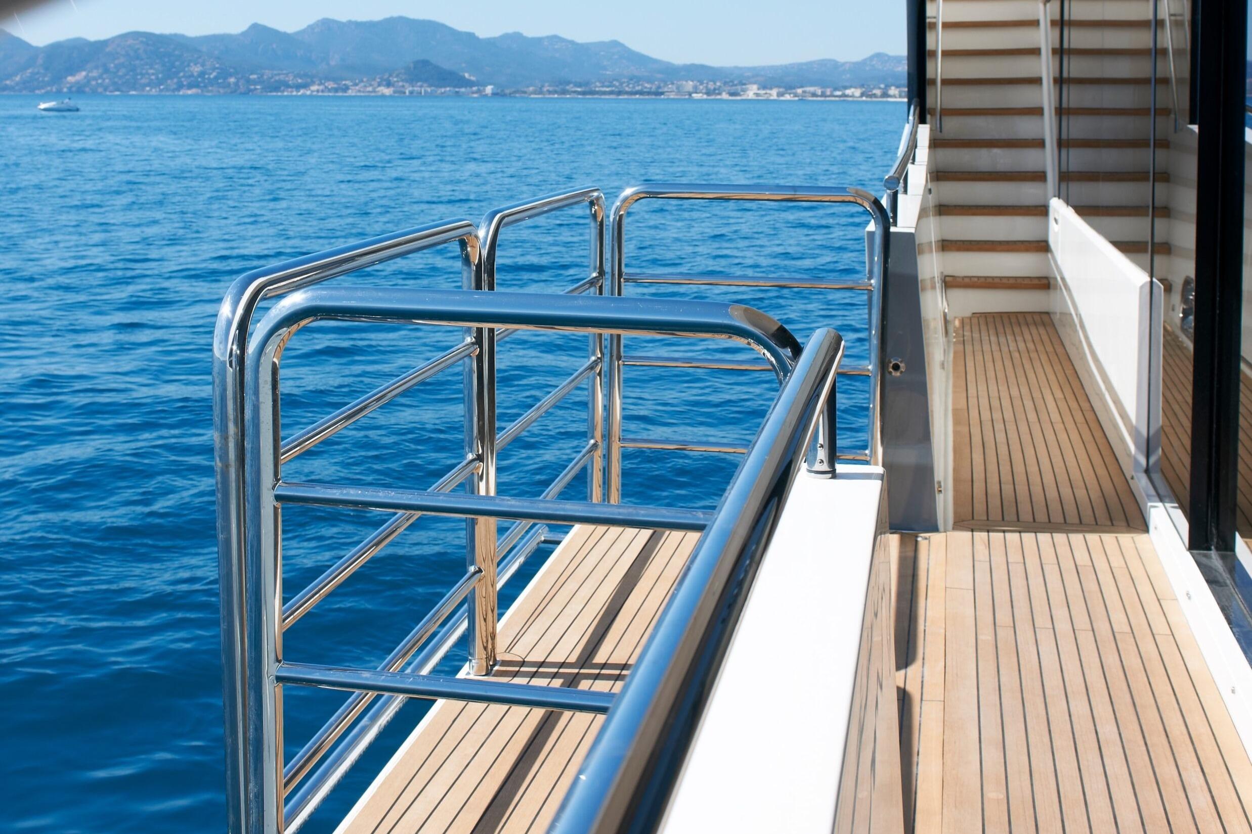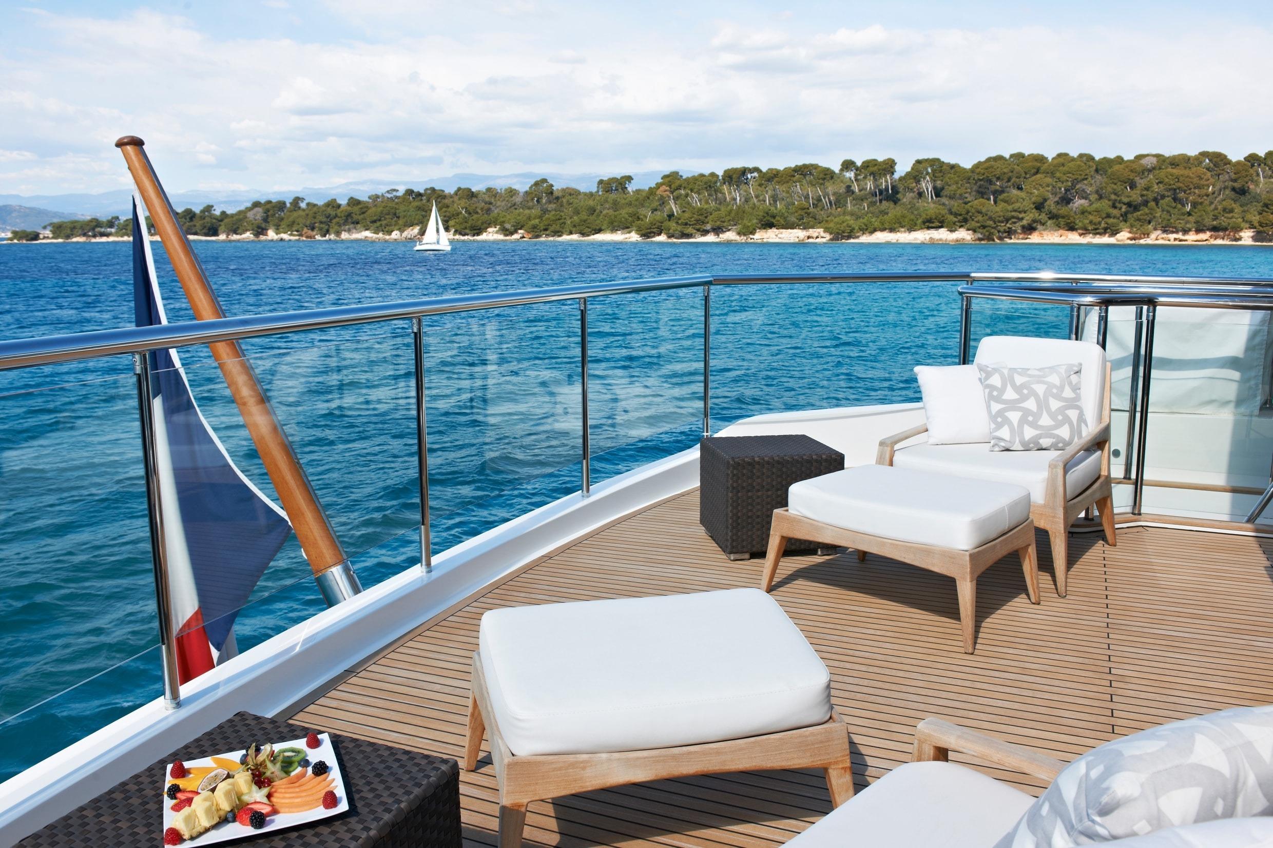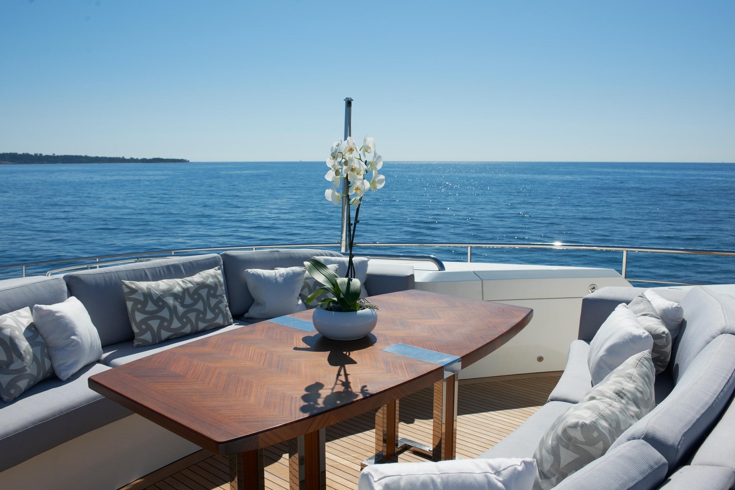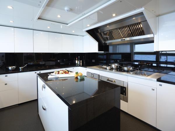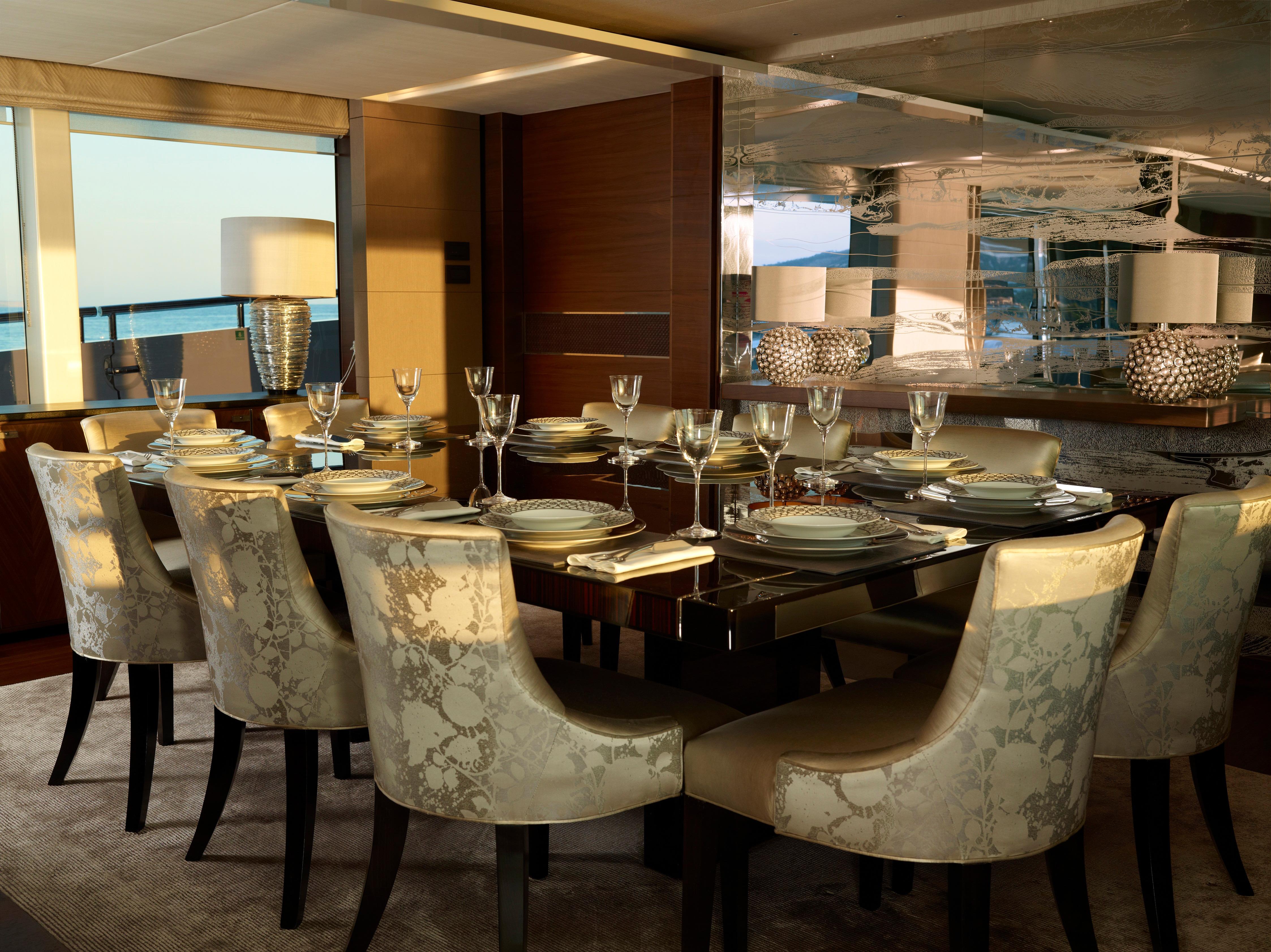 Sleek looks disguise the tri-deck yacht’s enormous interior which offers considerably more volume than many rivals of the same length, whilst great attention has been paid to achieving the highest recognised standards for quietness and comfort. Drop down balconies transform the main saloon into a spectacular area for entertaining and relaxing with a formal dining area enjoying extensive views through panoramic windows.