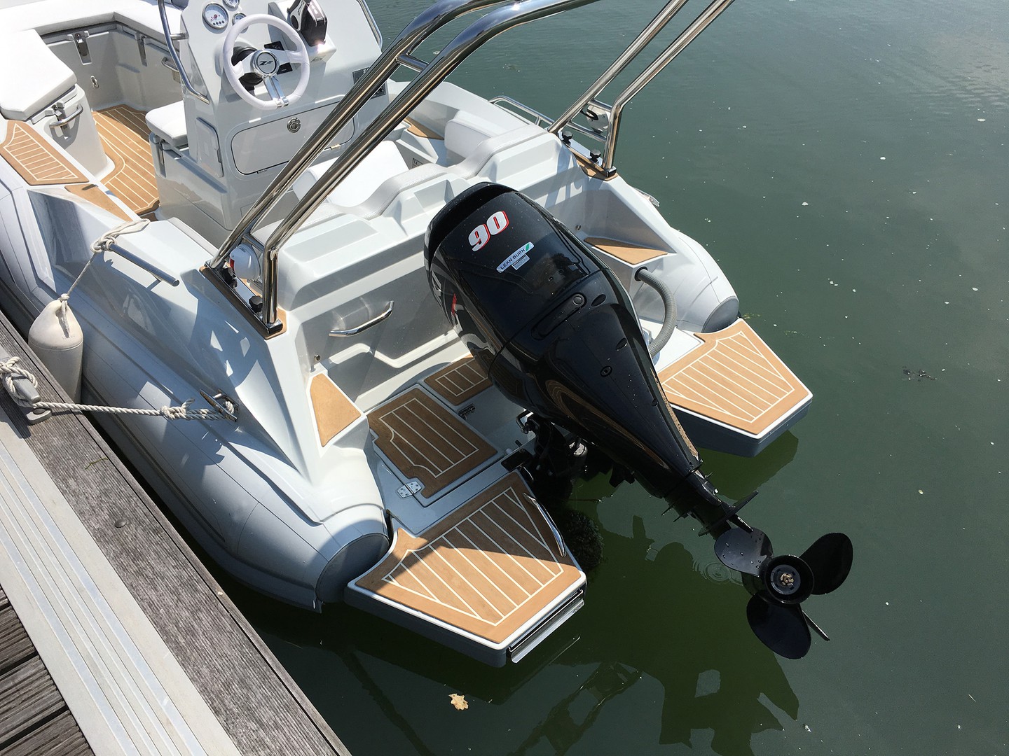 Anchor locker, 4 front wide storage compartments, side console seat with storage compartment, wide rear storage compartment, 2 confortable storage compartment on the rear engine cockpit, 2 seater drive console with internal storage compartment, tilting mechanical steering system and sport drive wheel, driver’s seat permitting driving seated or in a semi-seated position, double heavy rubber bumper, 6 stainless steel handles for passenger safety, 4 stainless steel cleats, 3 stainless steel eyebolts for hangers, left stern, deck tainless steel folding ladder, right stern deck, repair kit, inflating pump and a pair of paddle.