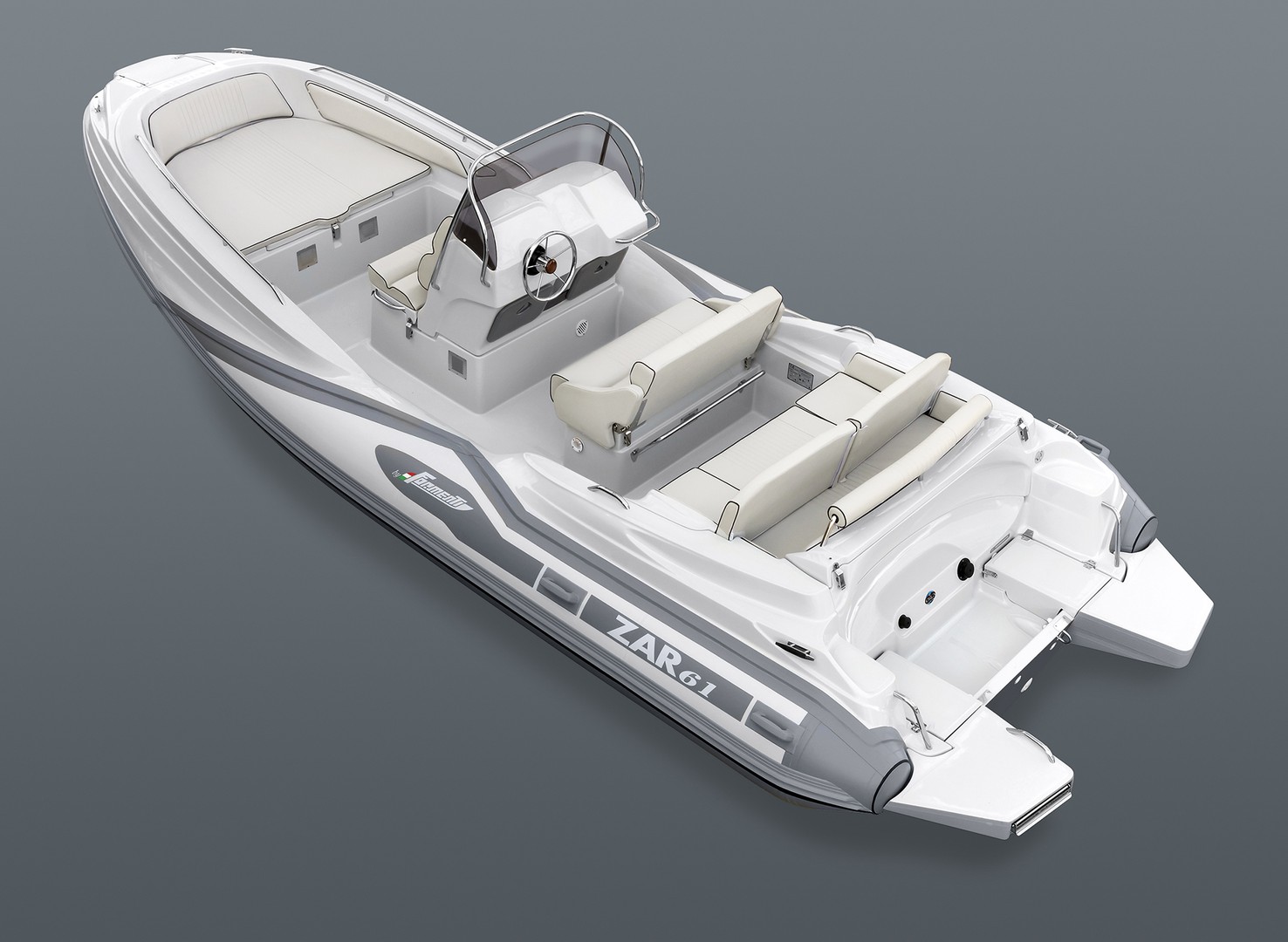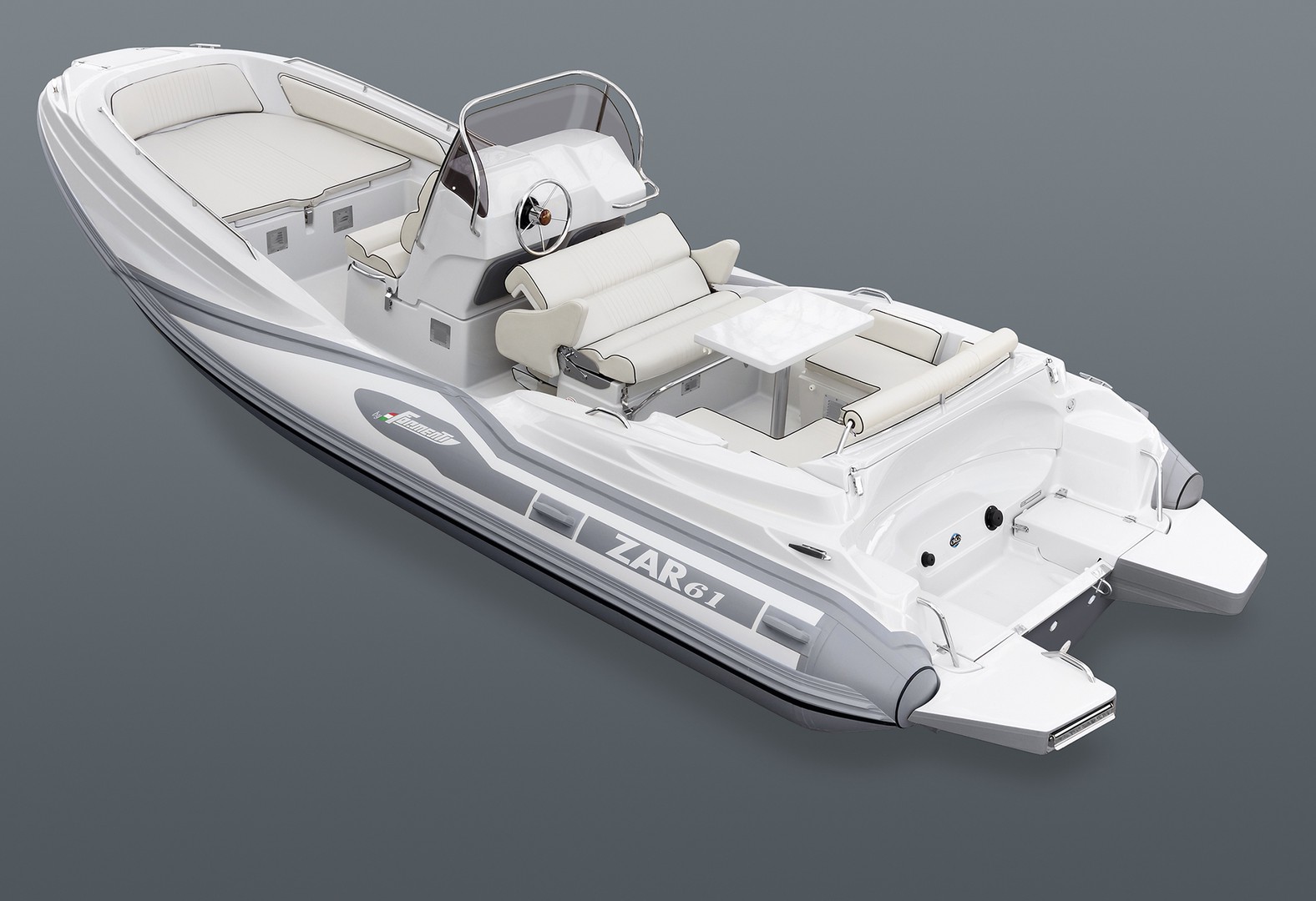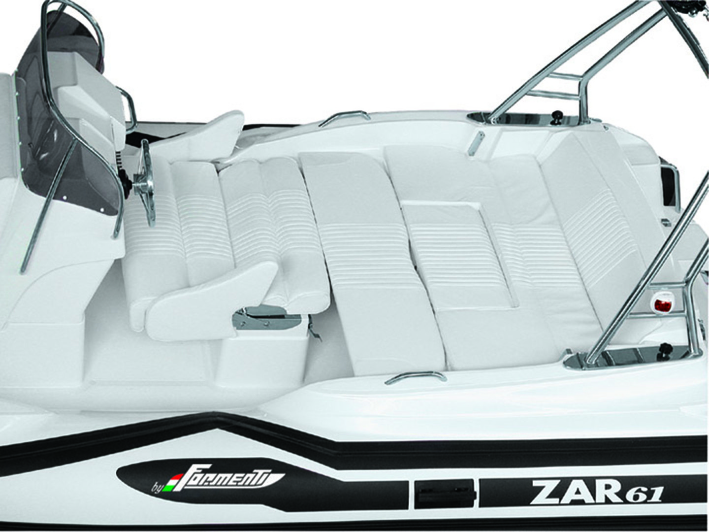 The same equipment as the ZAR 61 but equipped with dinette back with U-shaped sofa. The perfect balance between all the components is the value of this fantastic semi-rigid. Easy to tow and store, the ZAR 61 with a length of six meters offers its occupants all the space and comfort for a life on board first class. It has 10 chests where you can keep everything you can imagine, 8/9 seats facing the bow built with an anatomical profile, two huge solariums larger than two double beds, a control console with double seat as functional as in a luxury car, The driver’s seat is carefully designed for a perfect navigational position (both standing, semi-seated or seated). The design of the ZAR 61 is the most modern and practical that exists today. And above all, its fairing, worthy of a 7 meters, long and deep for a very soft and dry impact on the waves, fast and safe even in the worst sailing conditions, agile and manageable in port maneuvers.