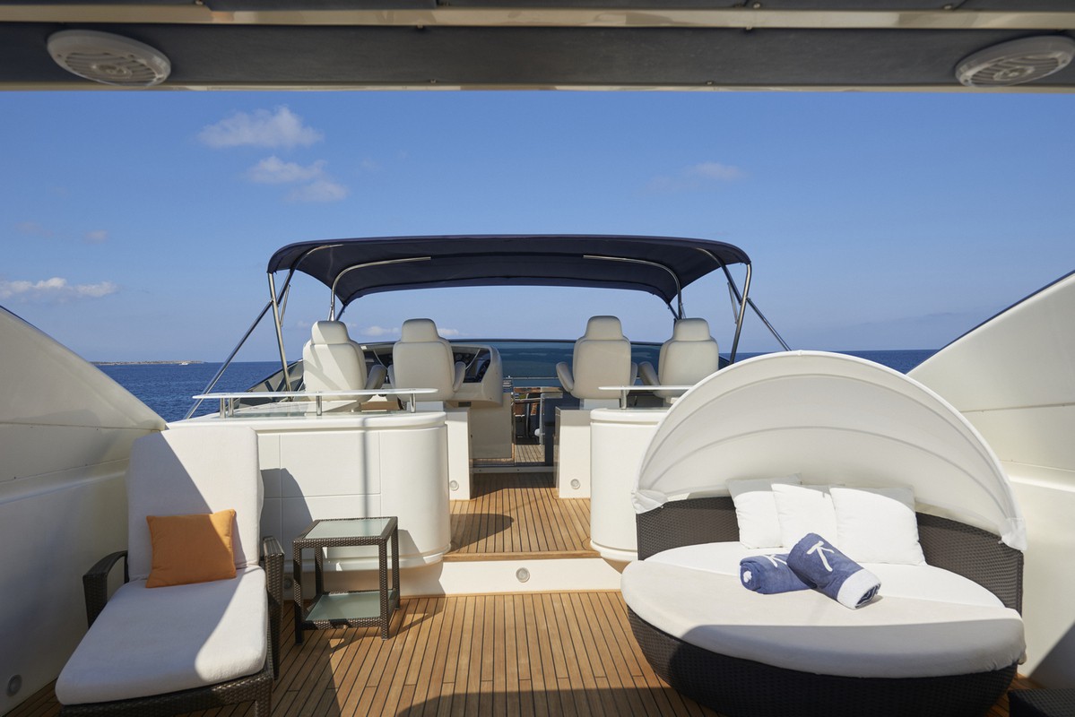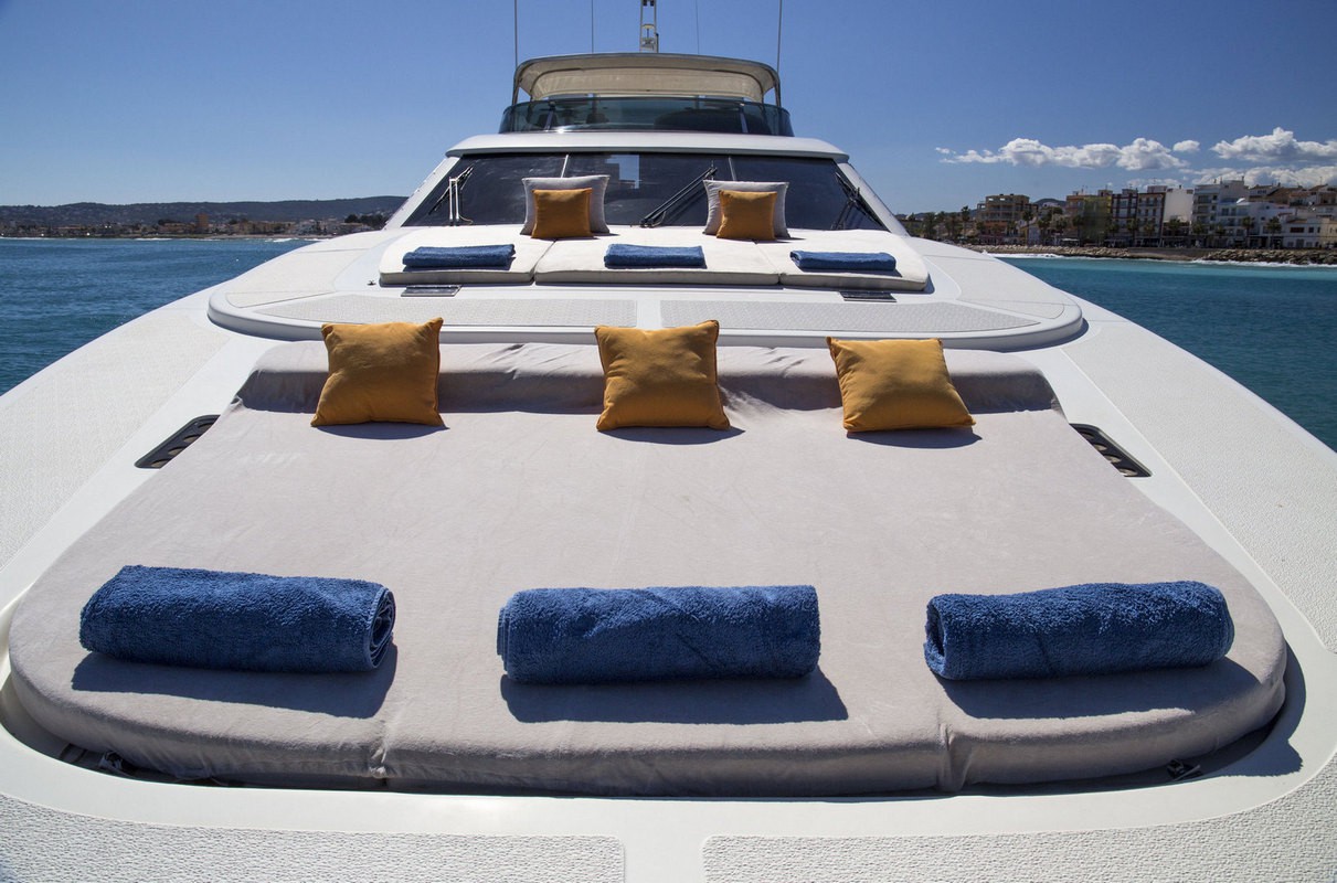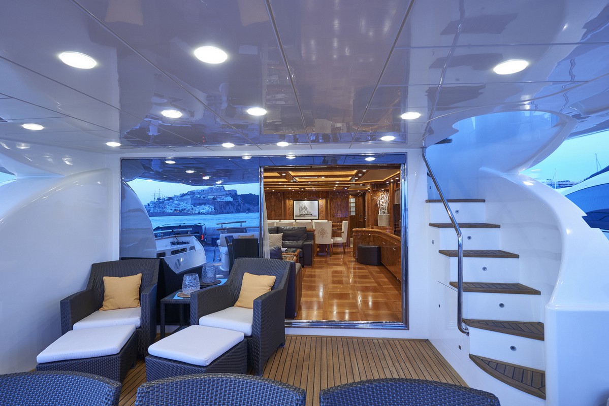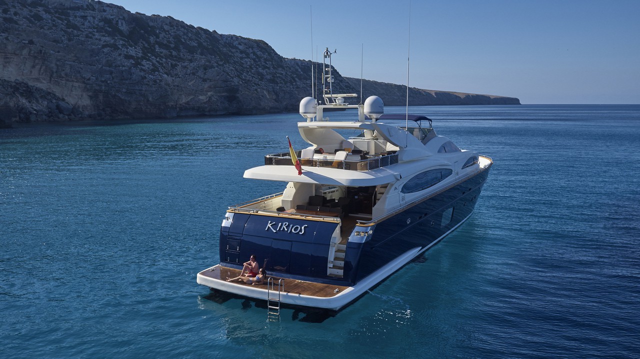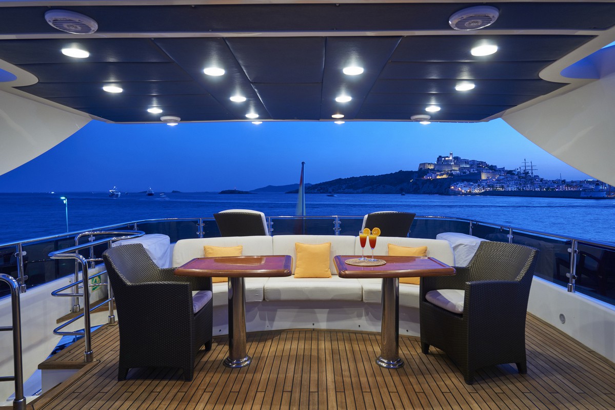 Timeless elegance, interiors in noble woods, marble and leather. Exterior with large lounge areas, solariums and bar. Night capacity for 10 + 1 + crew in its five double cabins and single. Crew formed by five professionals at your service. Live Ibiza on board our Astondoa 102 as you would have never