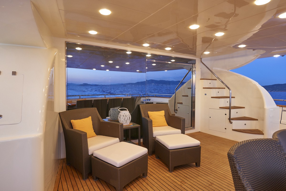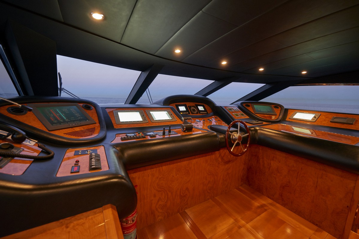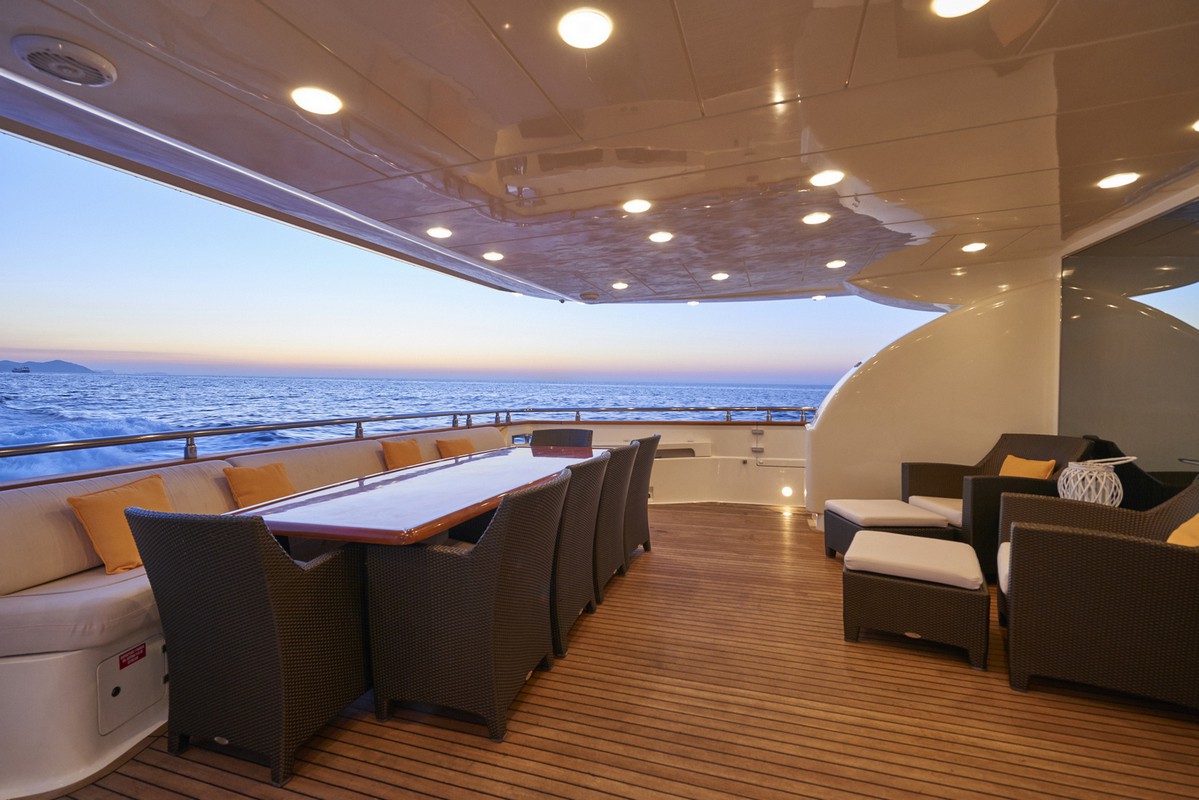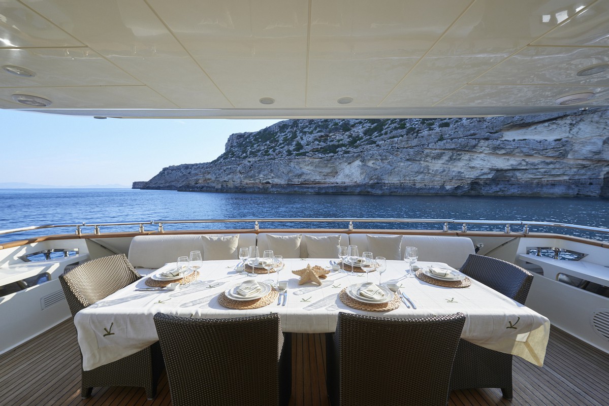 Timeless elegance, interiors in noble woods, marble and leather. Exterior with large lounge areas, solariums and bar. Night capacity for 10 + 1 + crew in its five double cabins and single. Crew formed by five professionals at your service. Live Ibiza on board our Astondoa 102 as you would have never