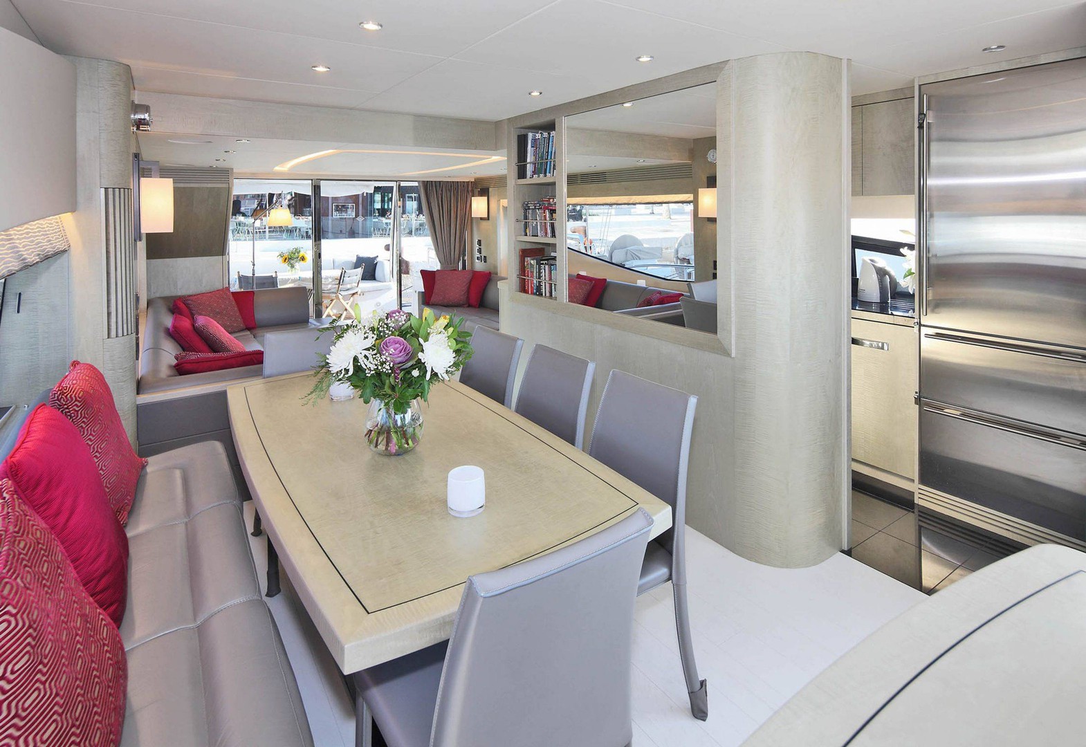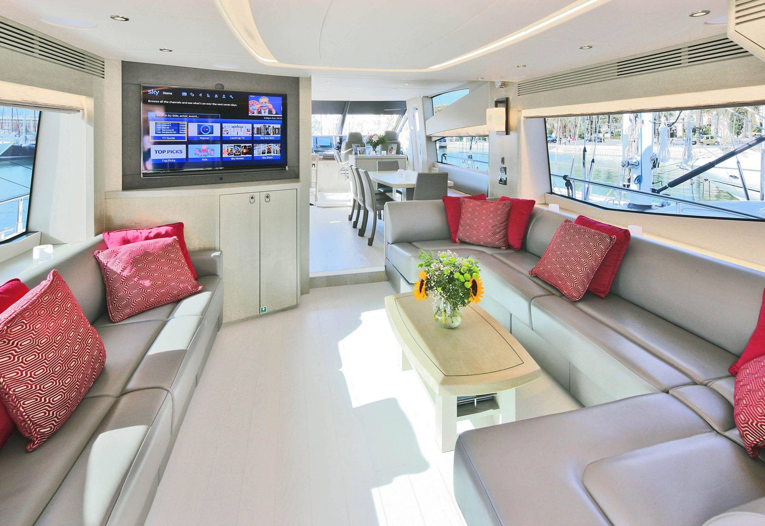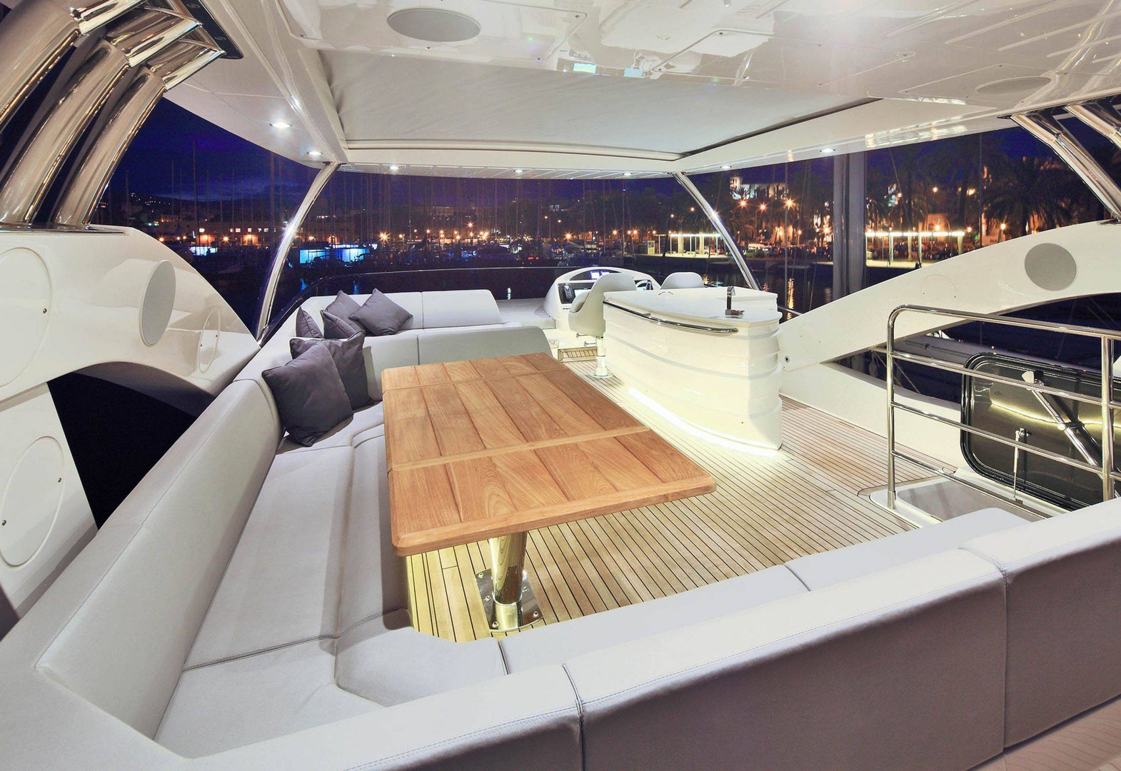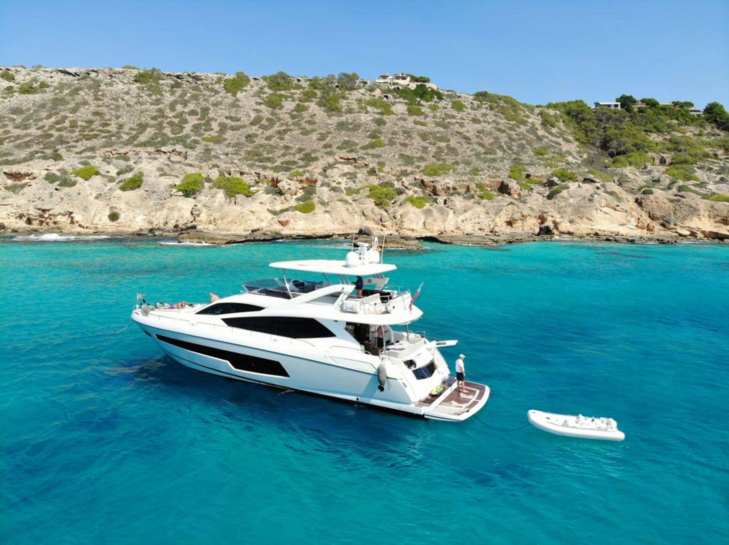 Equipped with air conditioning, stabilizers and WIFI. Three spacious decks to enjoy comfortably. Dinning and seating sparated areas in main deck plenty of natural ilumination thanks to Z shaped windows. In low deck 2 double suites and 2 twin bed cabins. Outdoor playground with wet bar, sun pads and dinning area. Water toys: Williams 385 Jet Tender on hydraulic swin platform, wakeboard, water skis, Stand Up Paddle and towable tubes,