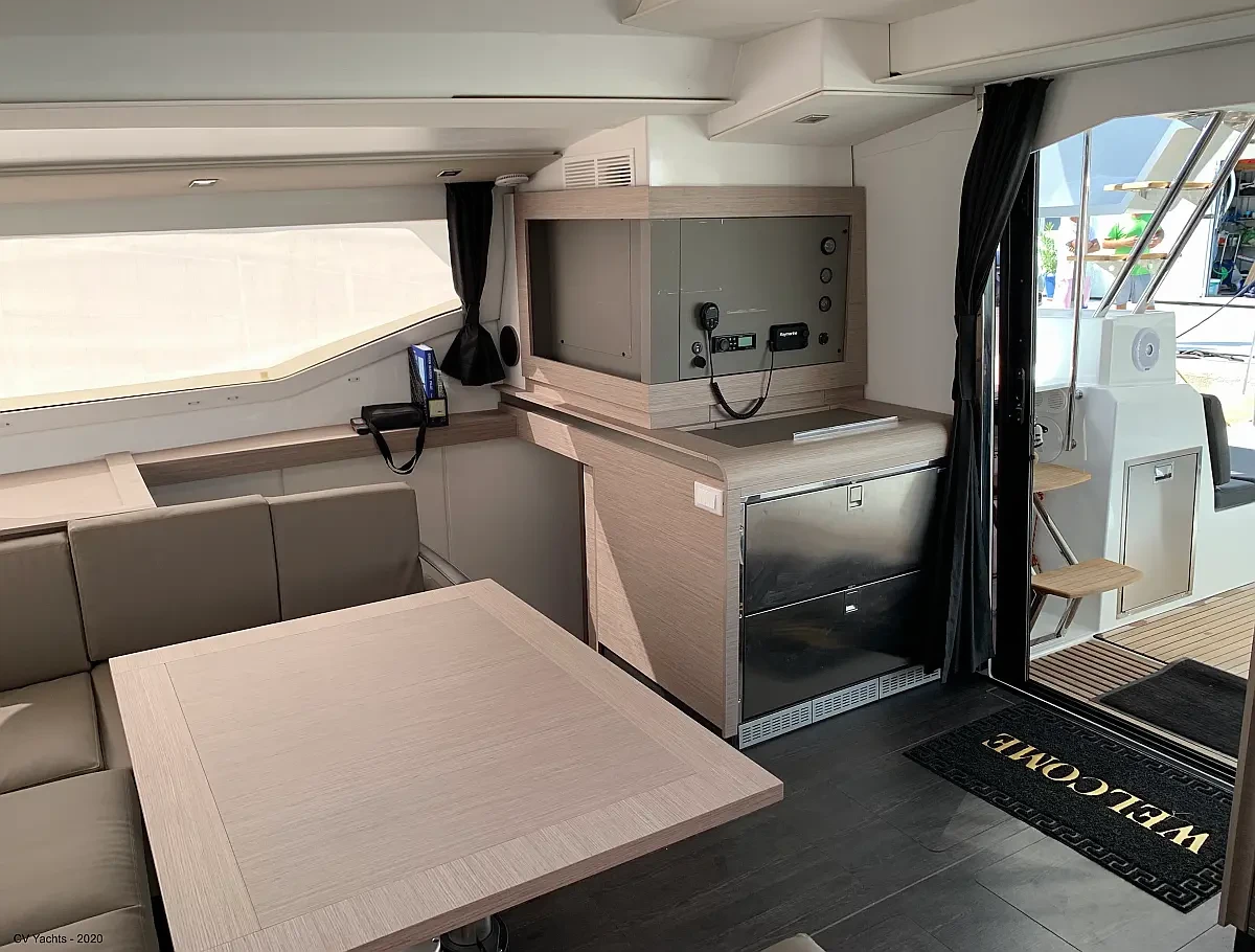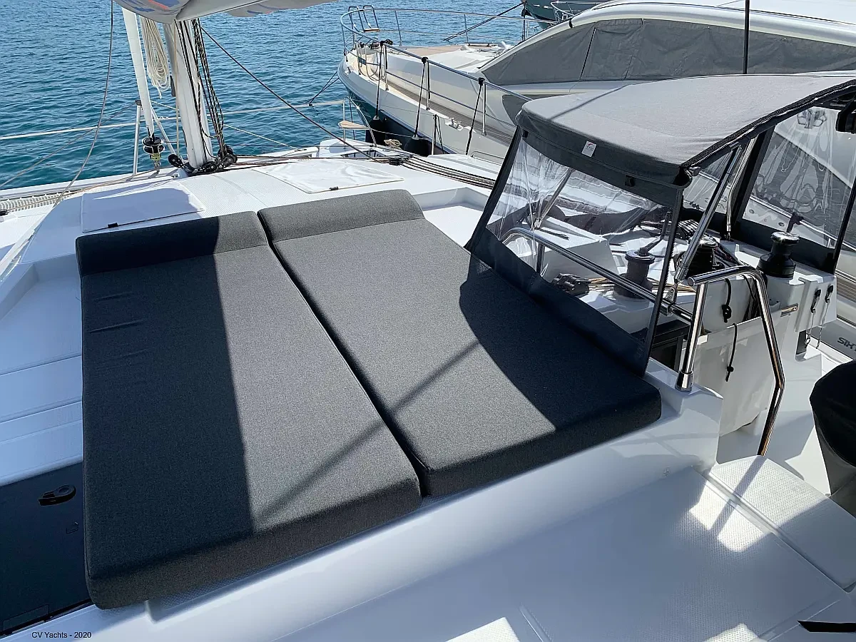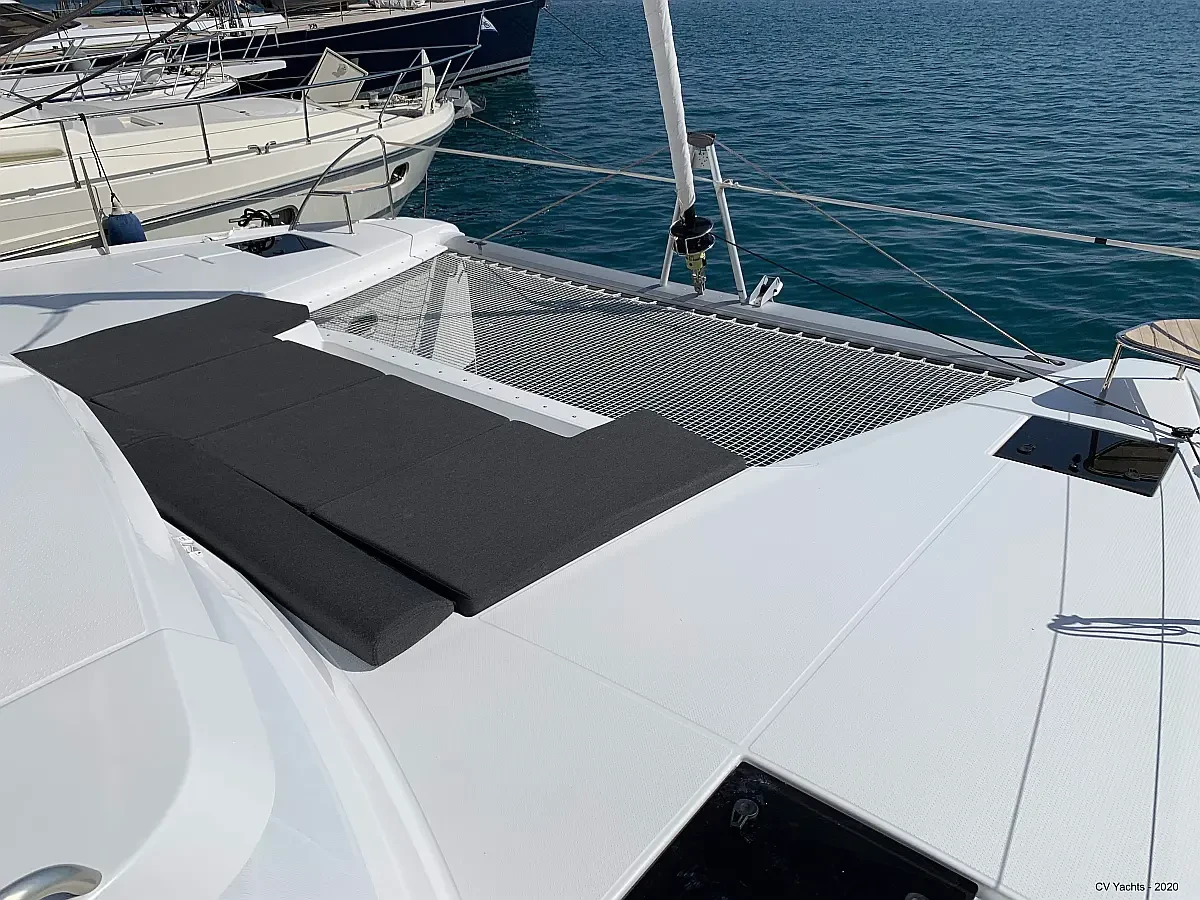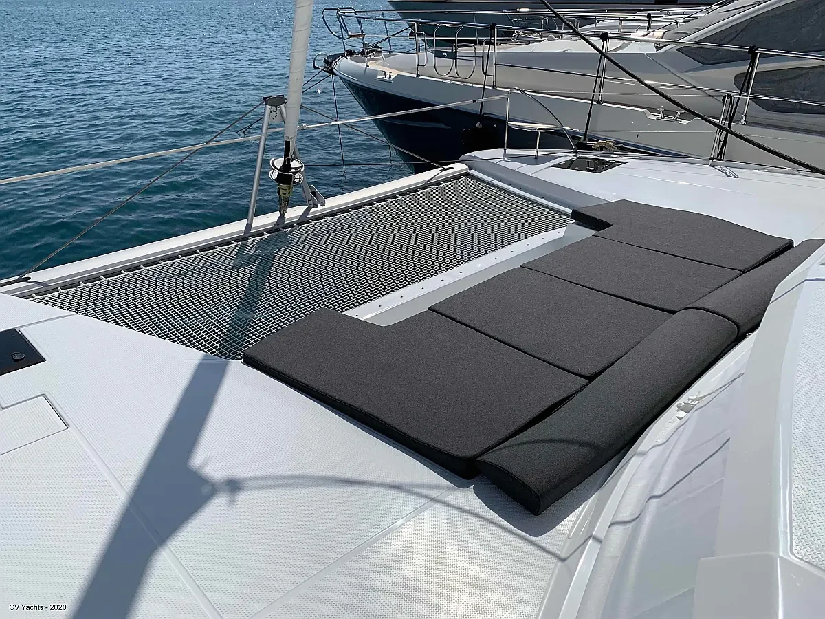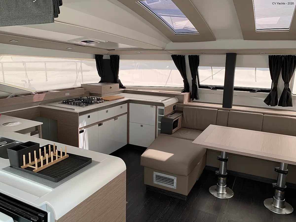 Elba 45 is designed to delight the eye and surprise you. The energising line of its inverted bows and the harmonious layout of its living spaces will captivate any sailing enthusiast. Dynamic and elegant, the helm of our new catamaran offers easy manoeuvrability and will delight you with its performance. A true cruising catamaran, bathed in magnificent light, aboard the Elba 45 you will feel as comfortable as at home, with 3 refrigerators, a generator and solar panels so you don't have to worry about staying anchored longer, and air conditioning in all cabins and the saloon.