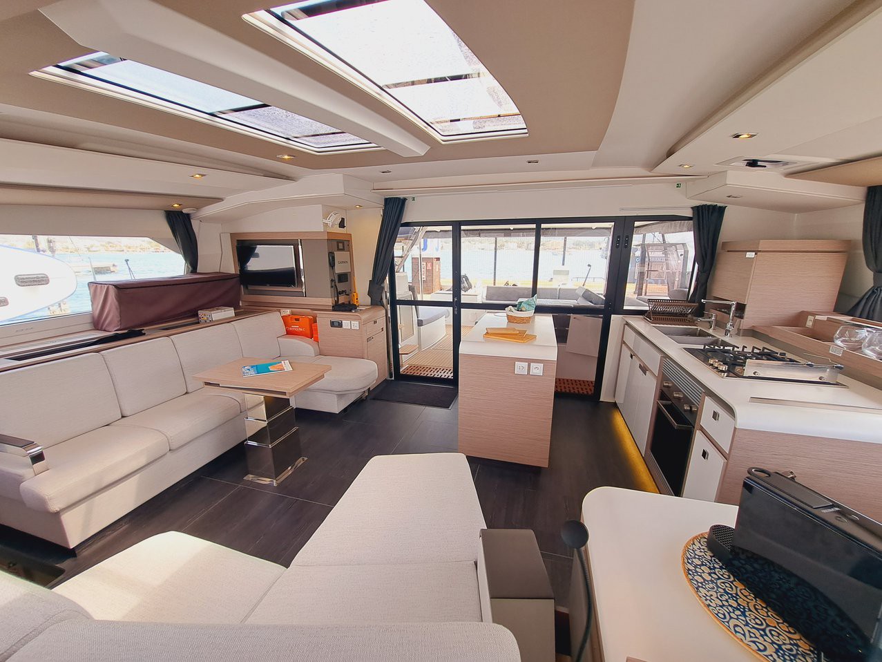 Air conditioning, Galley, Hot water, Microwave, Music system, Oven, Fridge, Cutlery, Radio with cd player, Washing machine, Water desalinator, Converter to 220v, Fresh water, Coffee machine, Bed-linen, Final cleaning included, Gas bottle, Gas stove, Socket 220v.