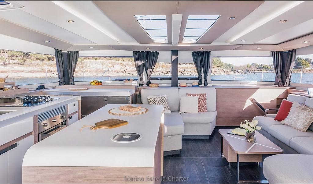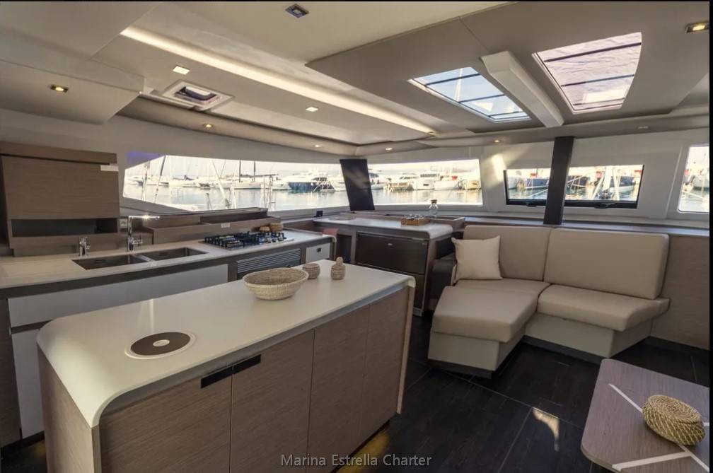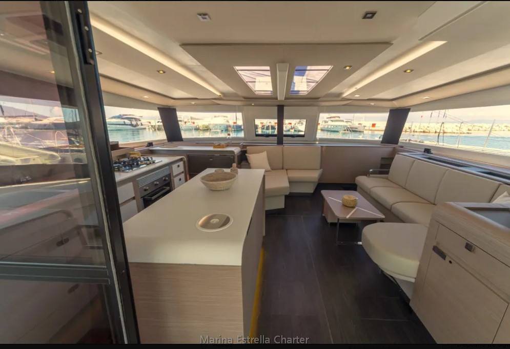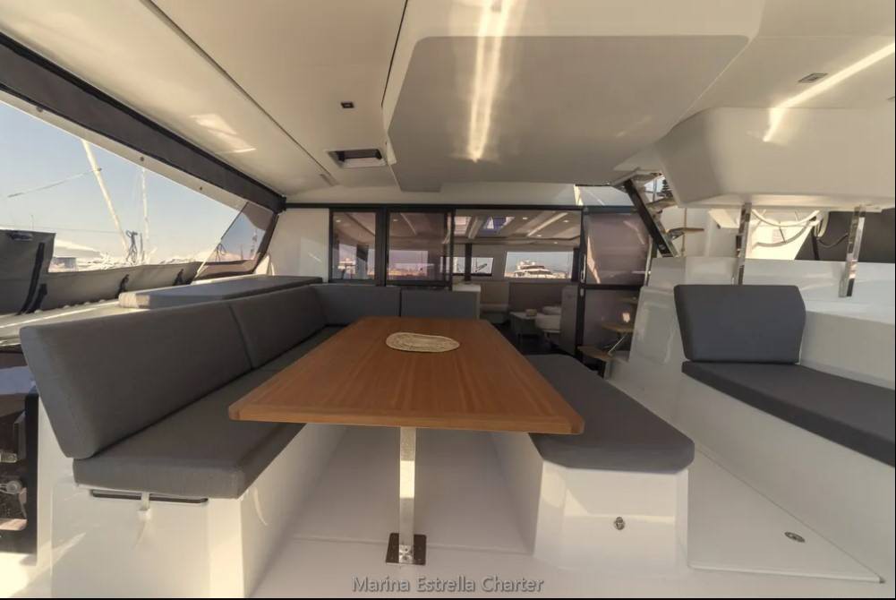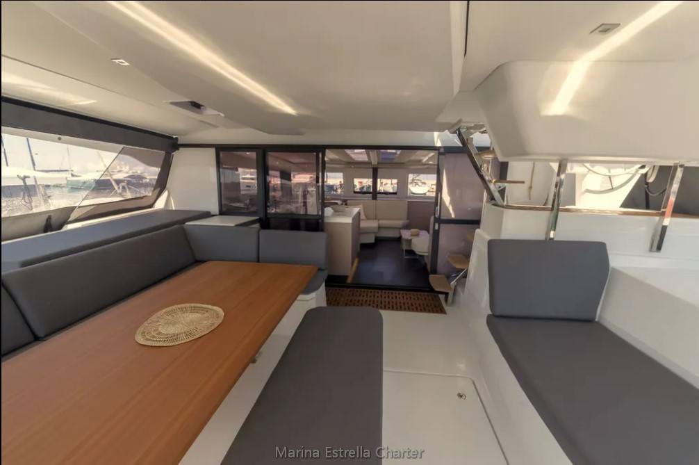 At the heart of the yacht lies a spacious panoramic saloon, seamlessly connected to the aft cockpit, forming a large open-plan social area ideal for dining, lounging, or enjoying drinks with a sea view. Outdoors, you'll find a cockpit dining area, sunpads, deck shower, and a flybridge with unobstructed views, perfect for relaxing while under sail or at anchor.