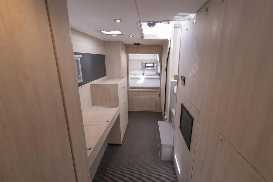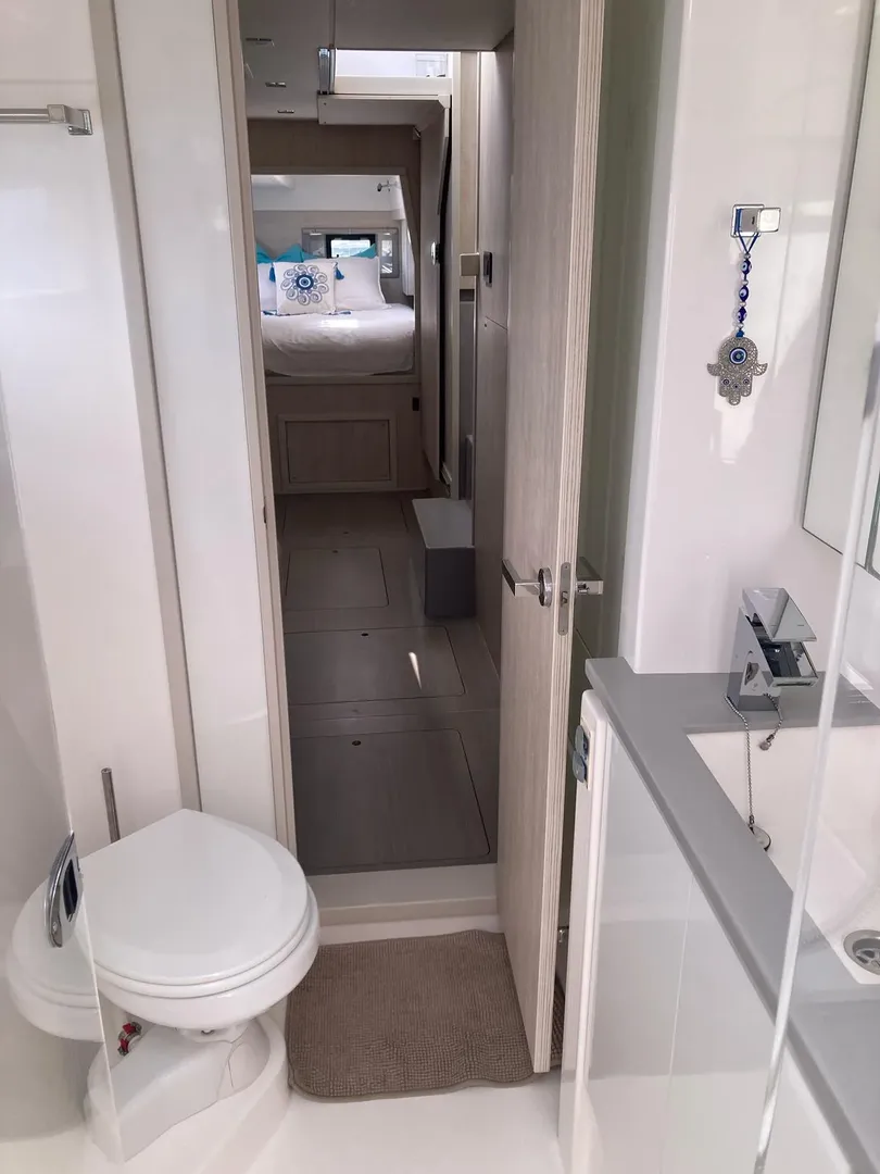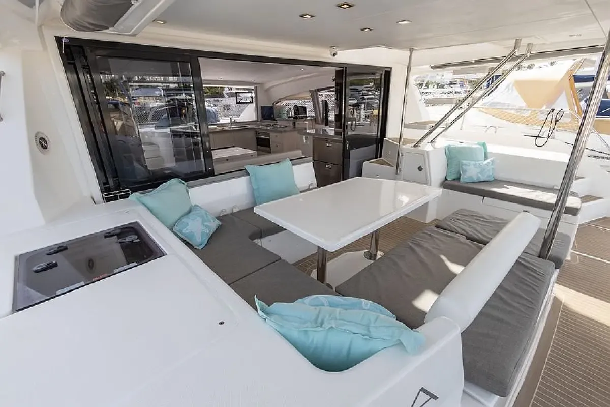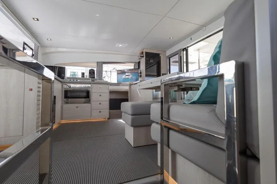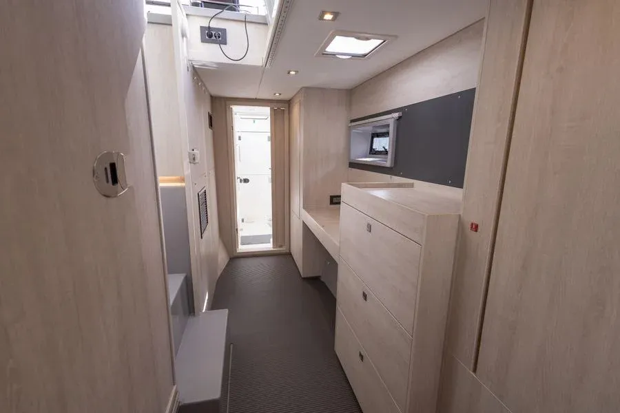 Inside, you will find three cabins, one of which is a suite, as well as a fully equipped kitchen, a bright saloon and practical bathrooms. Thanks to its double-hull design, it offers stable and smooth sailing even on long voyages.