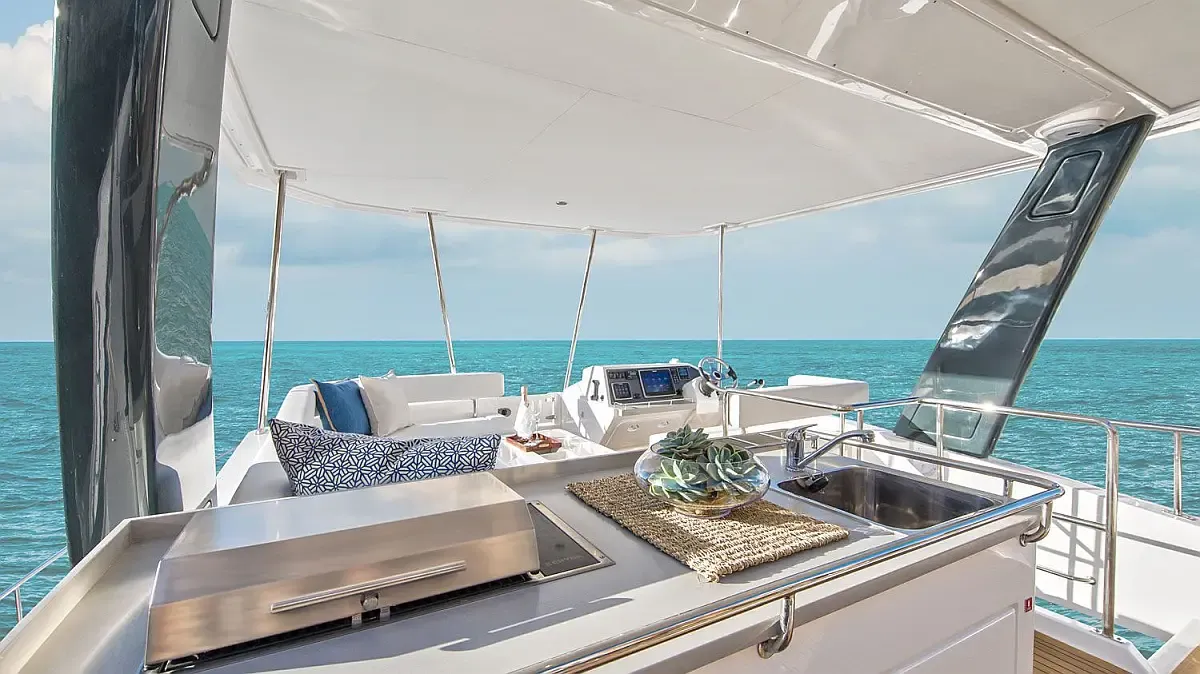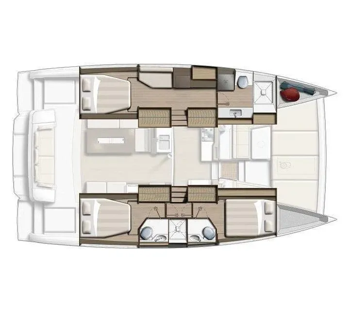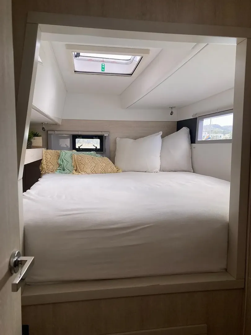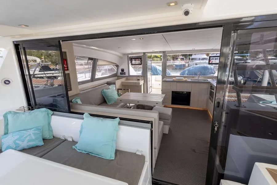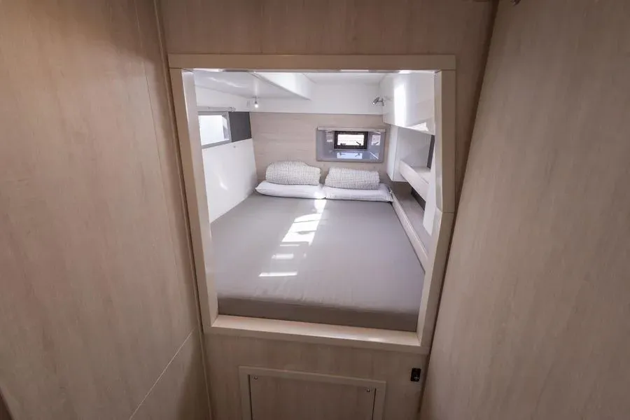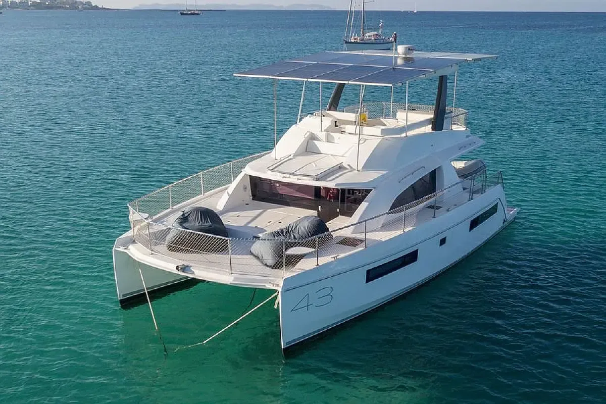 Inside, you will find three cabins, one of which is a suite, as well as a fully equipped kitchen, a bright saloon and practical bathrooms. Thanks to its double-hull design, it offers stable and smooth sailing even on long voyages.