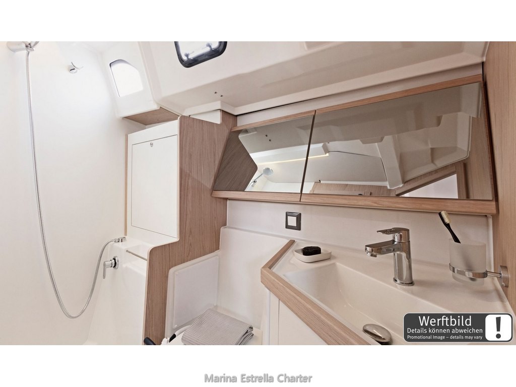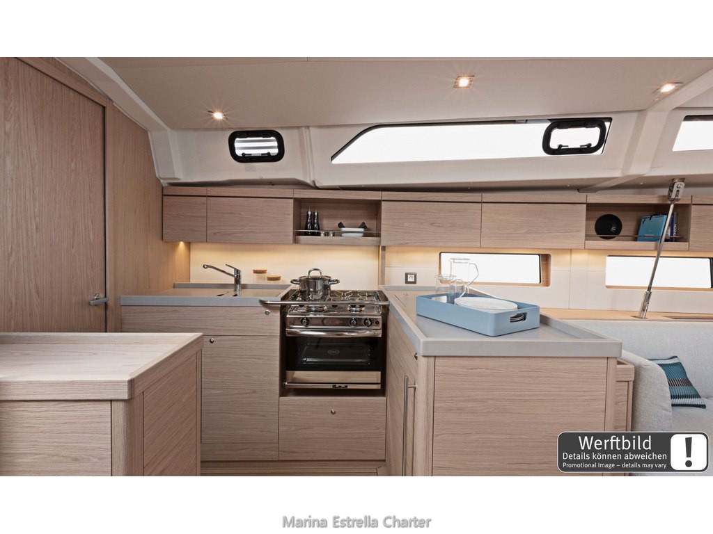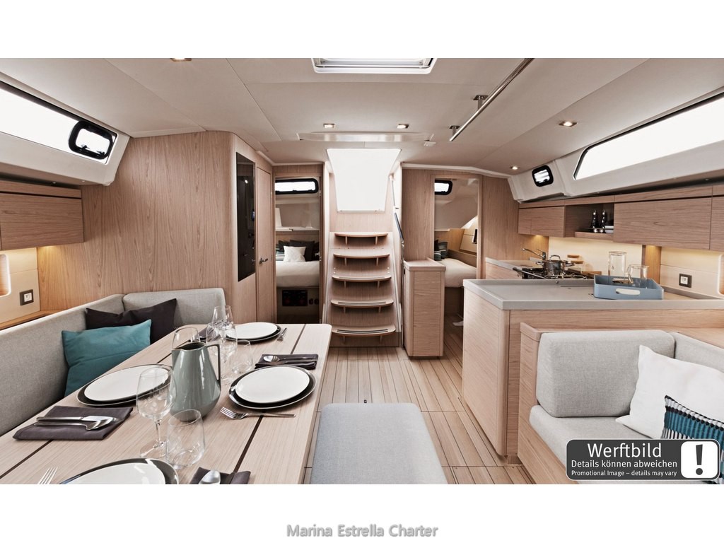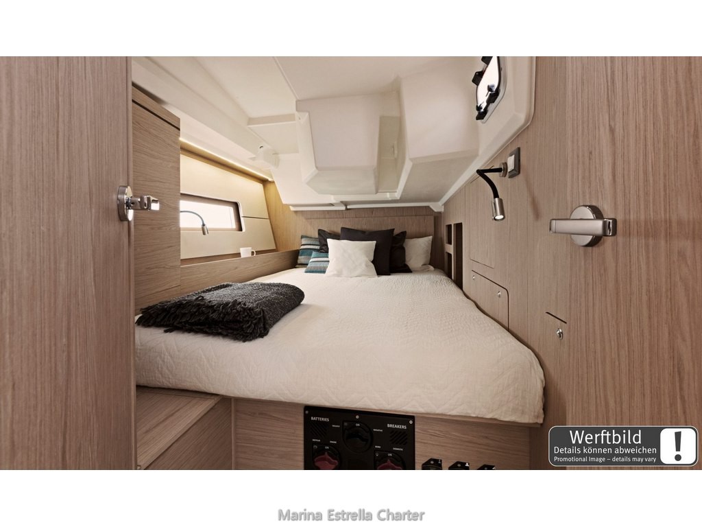 Inside, you'll find a well-planned layout with 5 cabins (4 doubles + 1 bunk cabin) and 3 electric bathrooms, perfect for up to 10 guests plus 2 additional berths in the saloon. The bright main saloon includes a convertible table, great ventilation, and a fully equipped galley with an oven, gas stove, sink, 130 L front-opening fridge (12 V), hot water, and all kitchen essentials. You'll also find USB ports in all cabins and the saloon, LED indirect lighting, and curtains throughout, creating a warm and relaxing environment at any time of day.