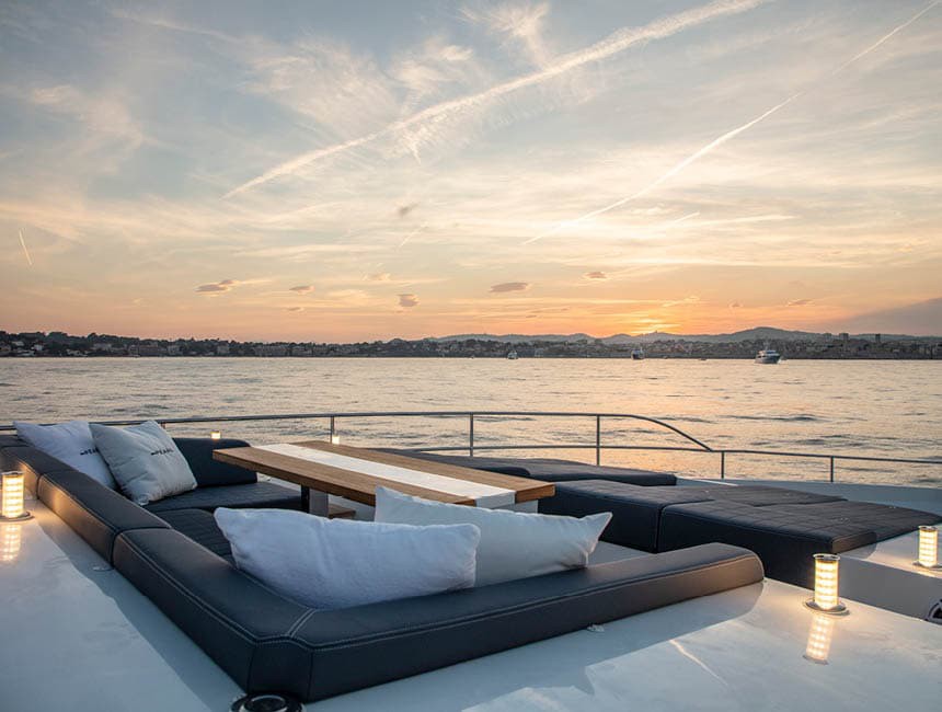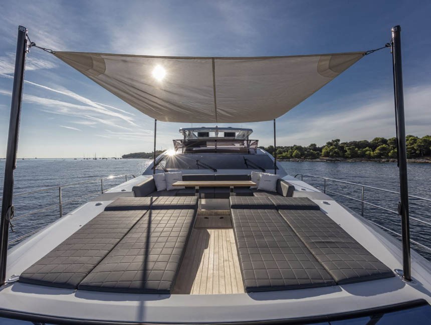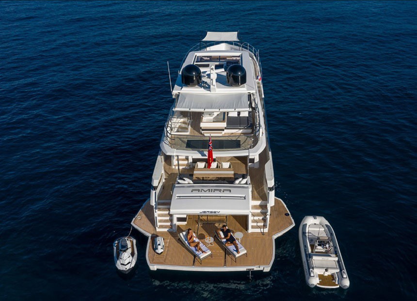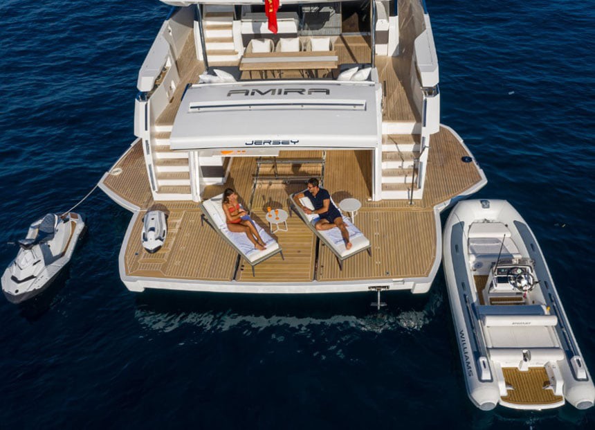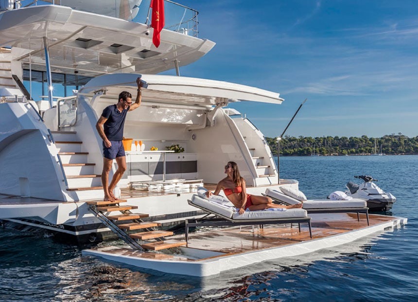 The swim platform provides easy access to the sea, while the generous lounging areas allow guests to fully enjoy the Mediterranean environment, whether at anchor or underway.
