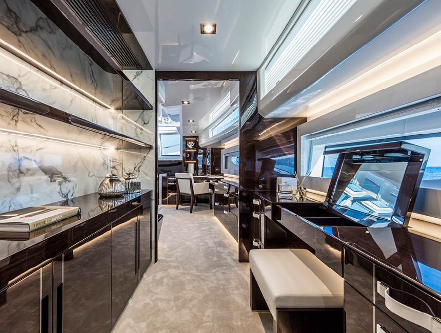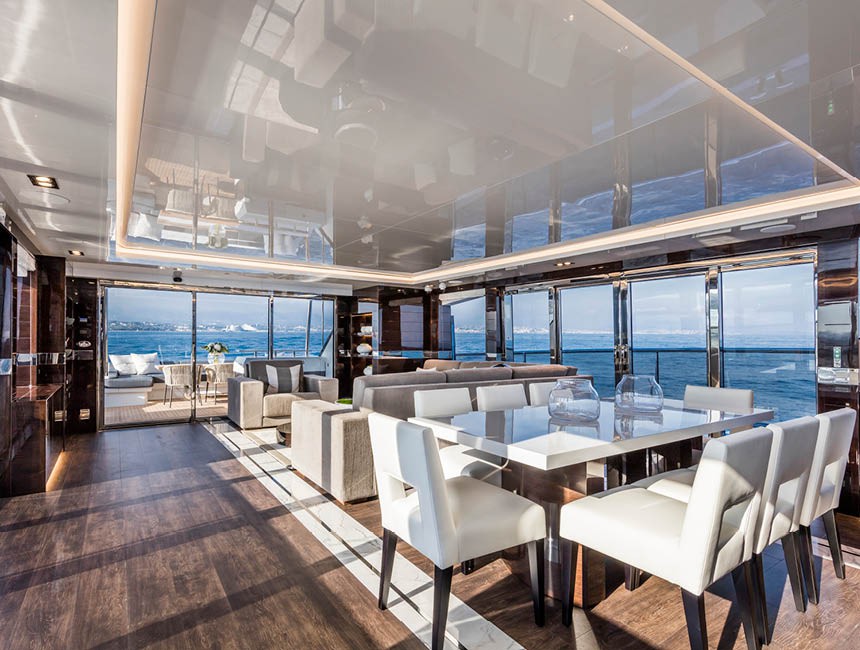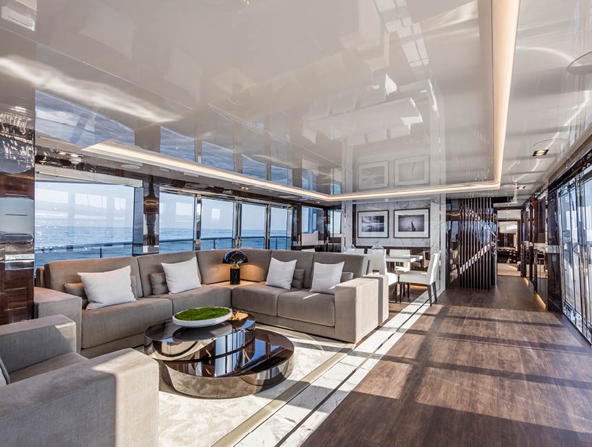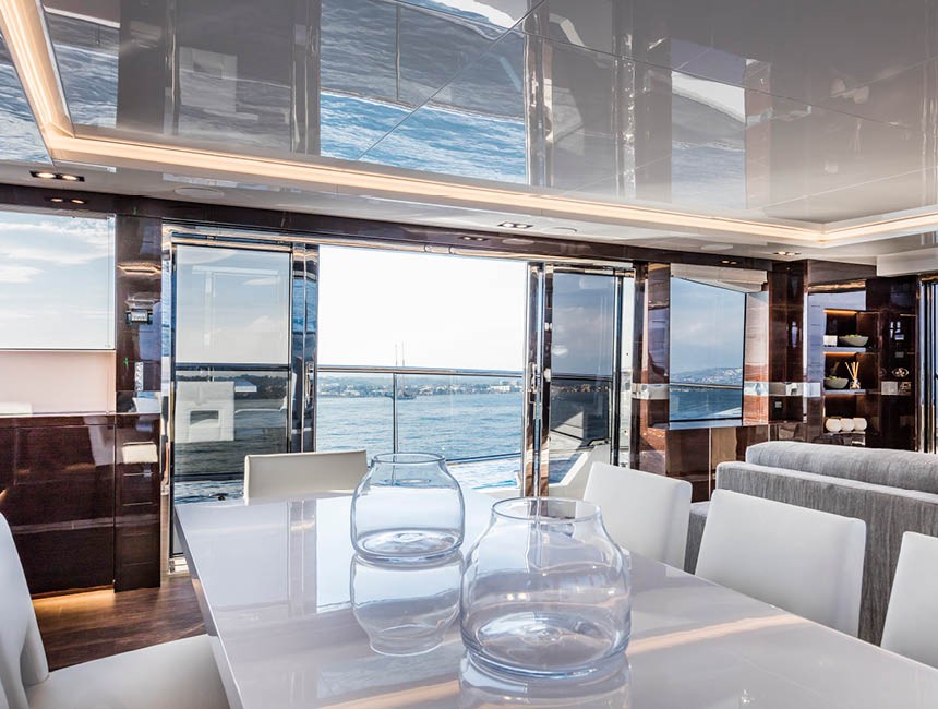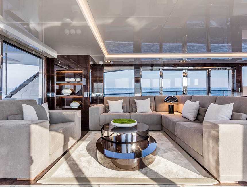 The main deck salon features large panoramic windows that flood the interior with natural light and maintain a constant visual connection with the sea, creating an elegant and relaxed atmosphere.
