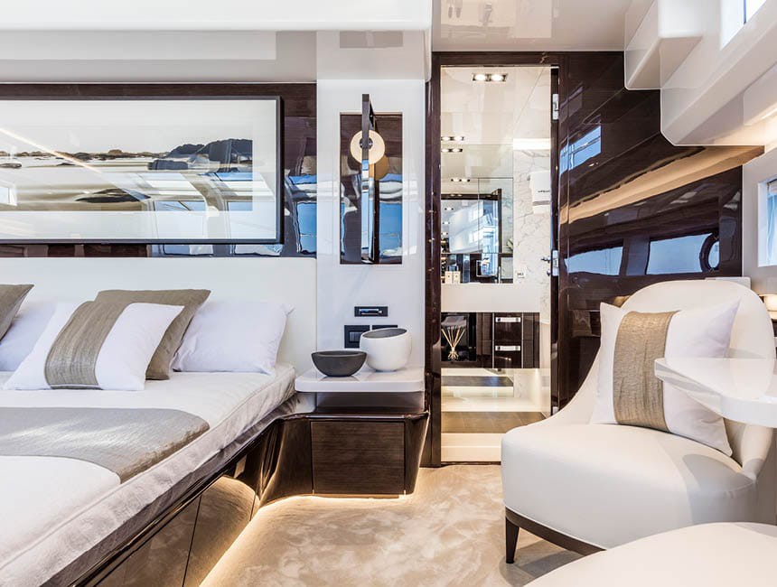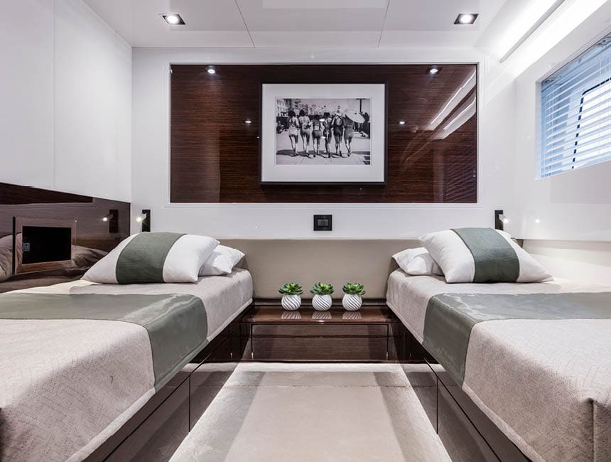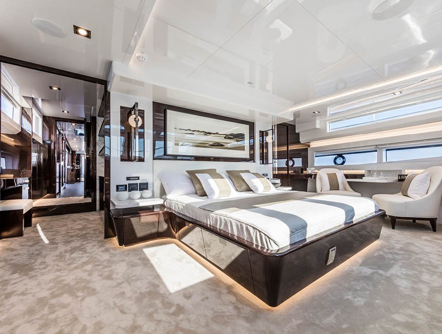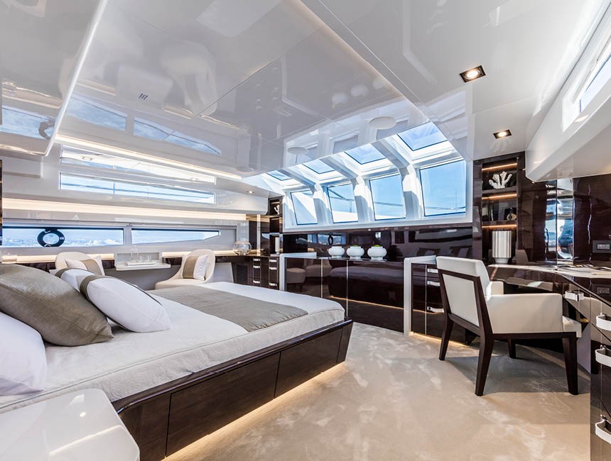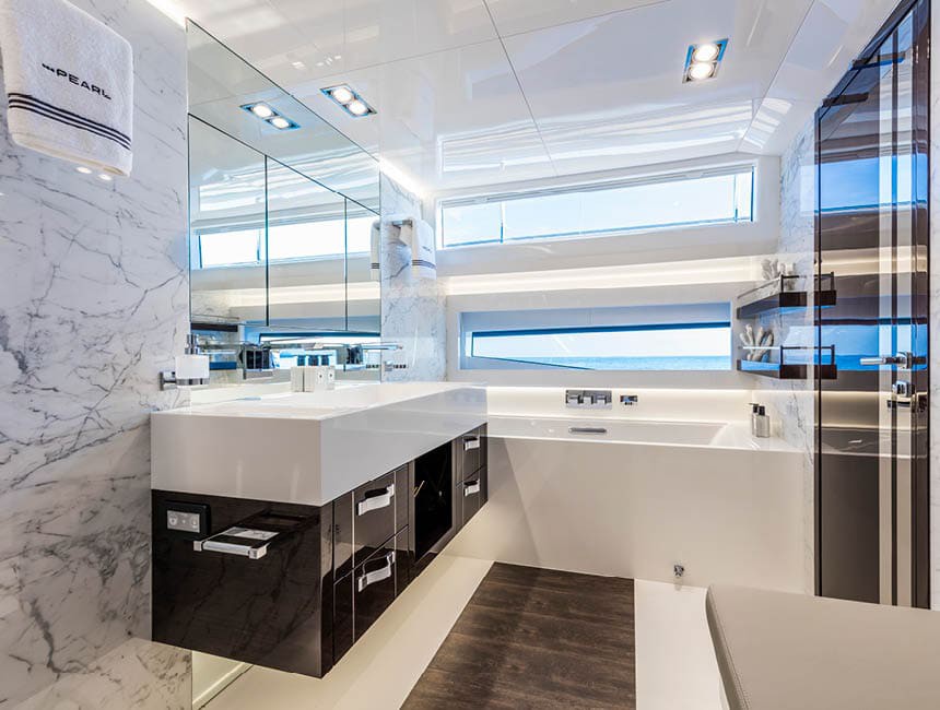 The Pearl 95 accommodates up to 10 guests overnight in 5 double cabins, all with en-suite bathrooms and refined, modern finishes.