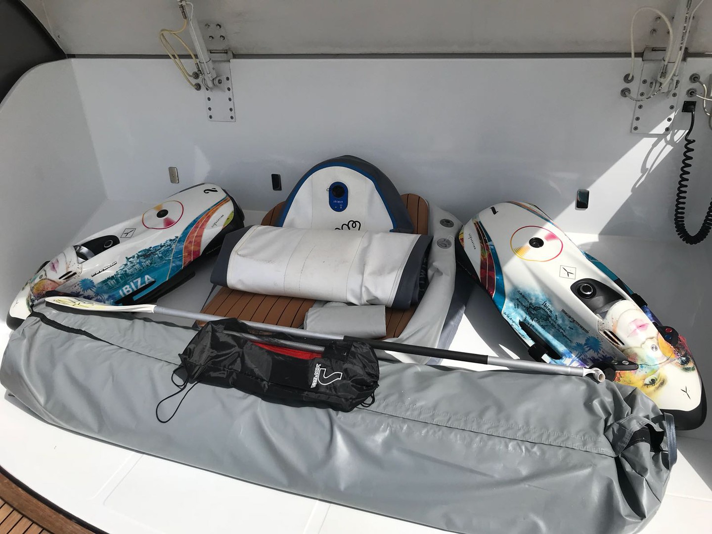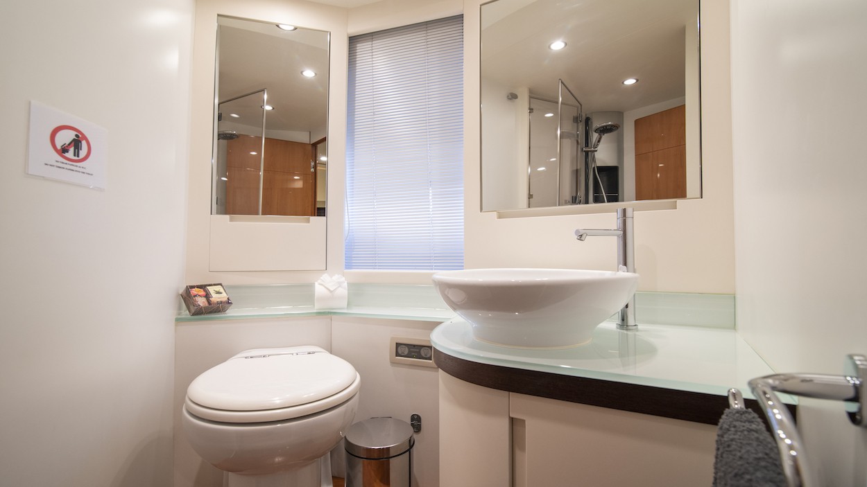 This vessel comes well equipped with water toys, including a Nautibuoy C-Dock swim platform, a Williams Jet tender, a wakeboard, a 3-seater donut, two SeaBobs, a Jobe jet ski, a SUP board and snorkelling equipment.