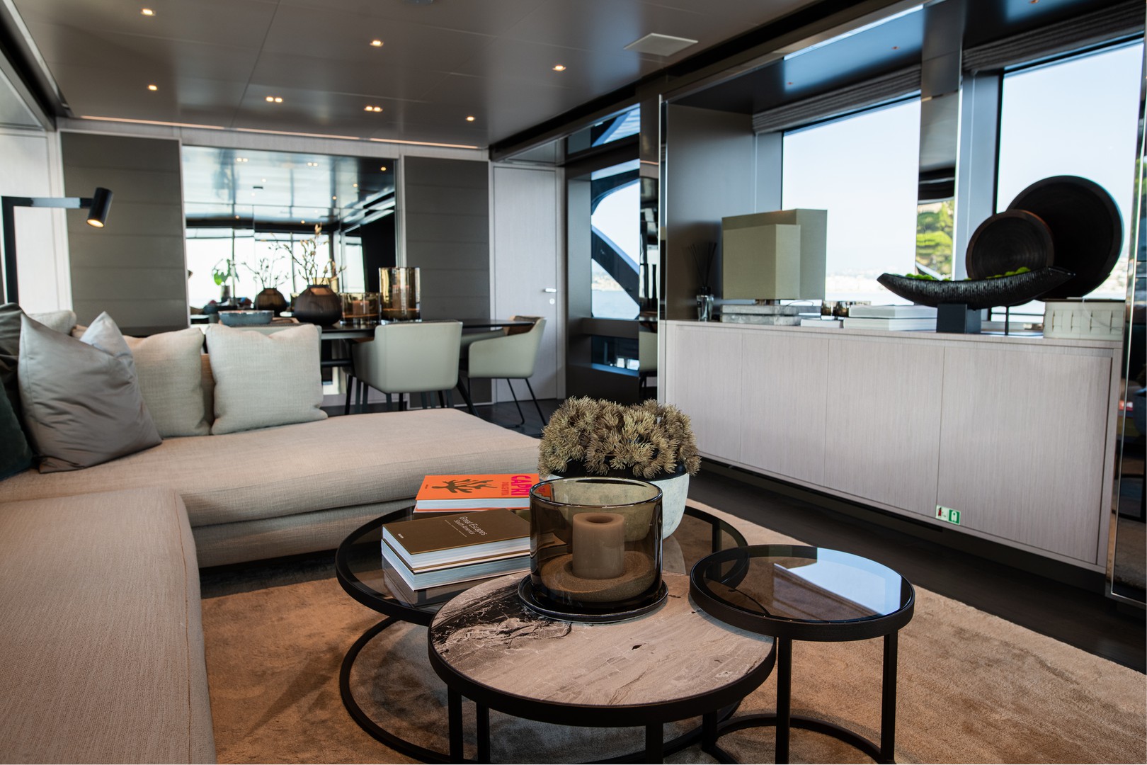 On the flybridge, a sophisticated bar, a dining table, a comfortable sofa and a partial hardtop invite you to enjoy moments of calm under the sun, intimate gatherings or evenings contemplating the endless views of the ocean.