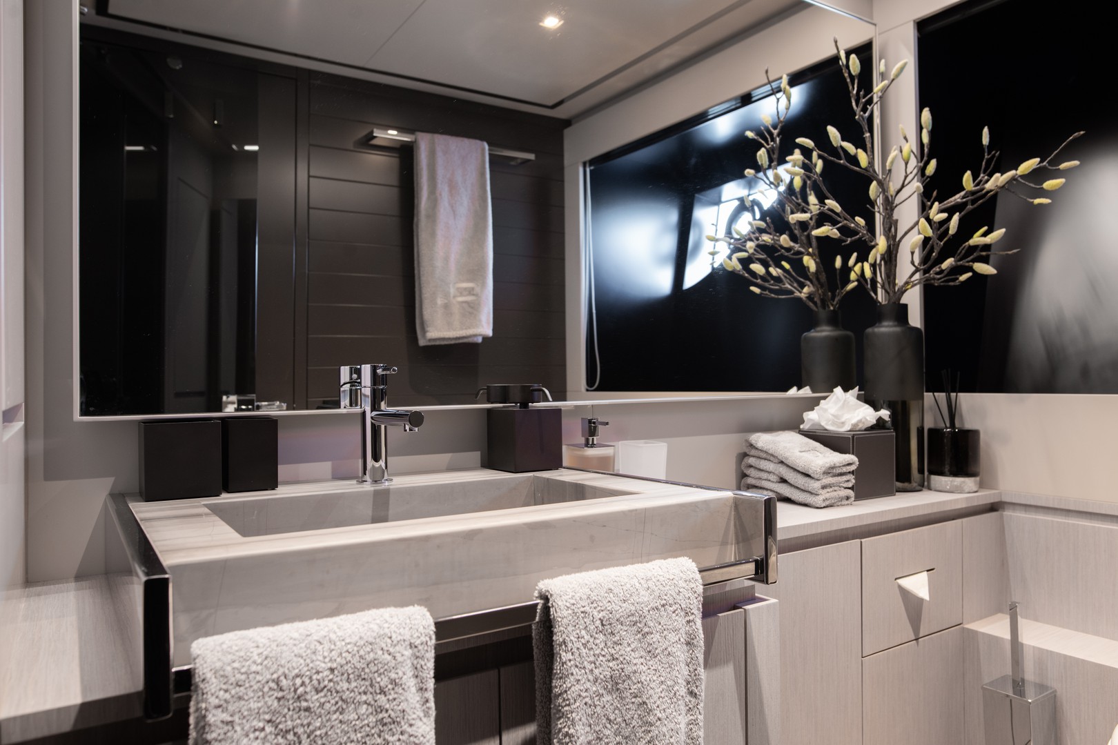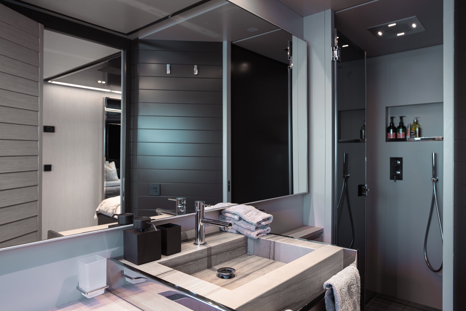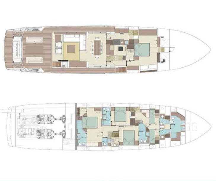 With capacity for eight guests, ELLA offers four double cabins designed for maximum comfort. On the main deck, the spacious master cabin provides an exclusive haven of elegance and serenity. On the lower deck, two VIP cabins and a twin cabin convertible into a double, all with en-suite bathrooms, guarantee privacy and well-being for every guest.