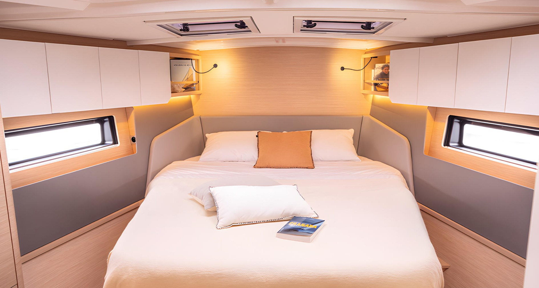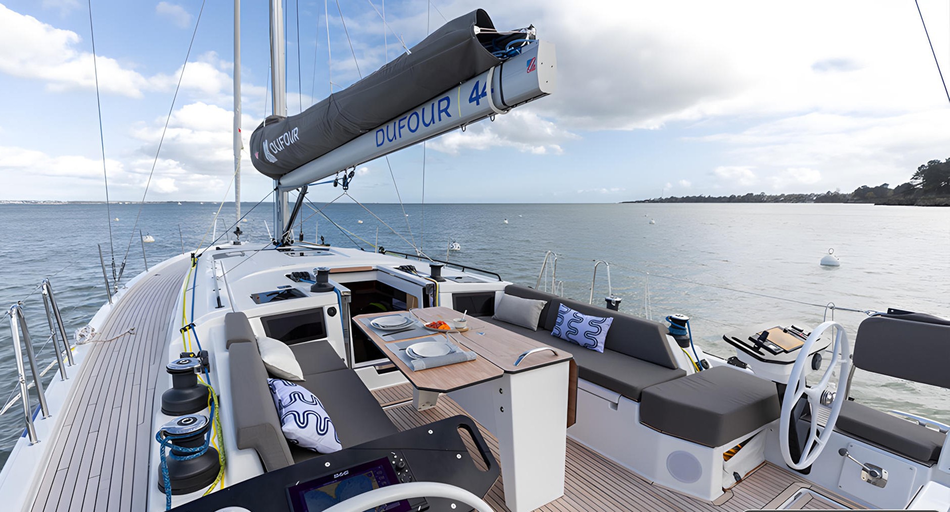 • The cockpit of the Dufour 44 is one of the largest in its class: spacious benches, a stable table with integrated fridge and plenty of freedom of movement invite you to enjoy life on board in the open air. Thanks to the Easy and Ocean versions, you benefit from a clear line system and additional manoeuvrability directly at the helm.