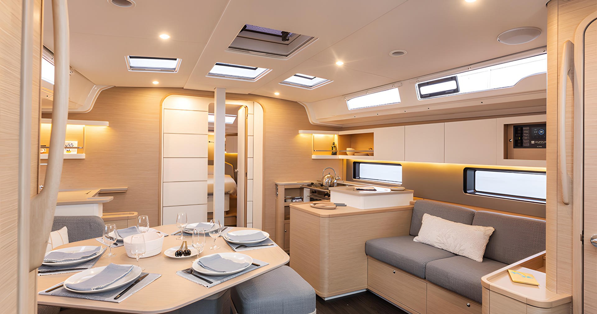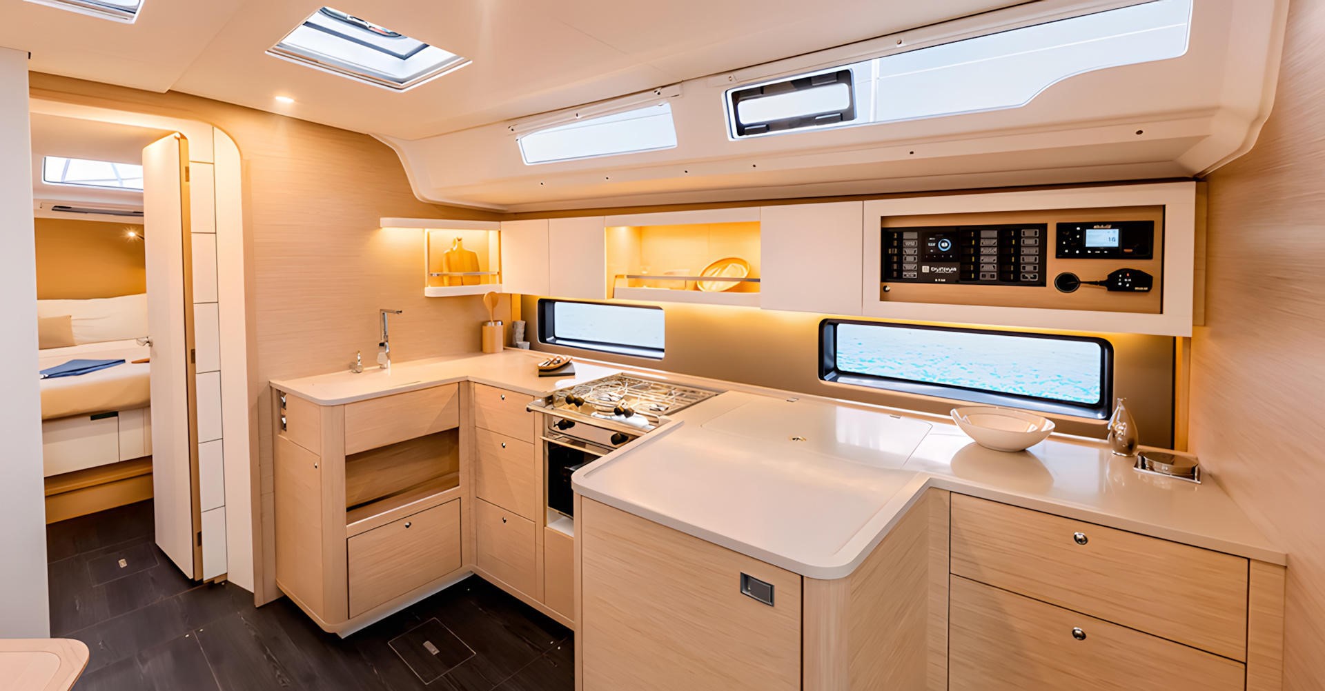Agile and powerful sailing: stability, speed and great control High-quality extras such as bow thruster, teak in the cockpit, electric toilets, heating, audio package and the popular plancha with sink complete the equipment. Thus, the yacht is perfectly equipped for charter cruises in Mallorca, Menorca and Ibiza.