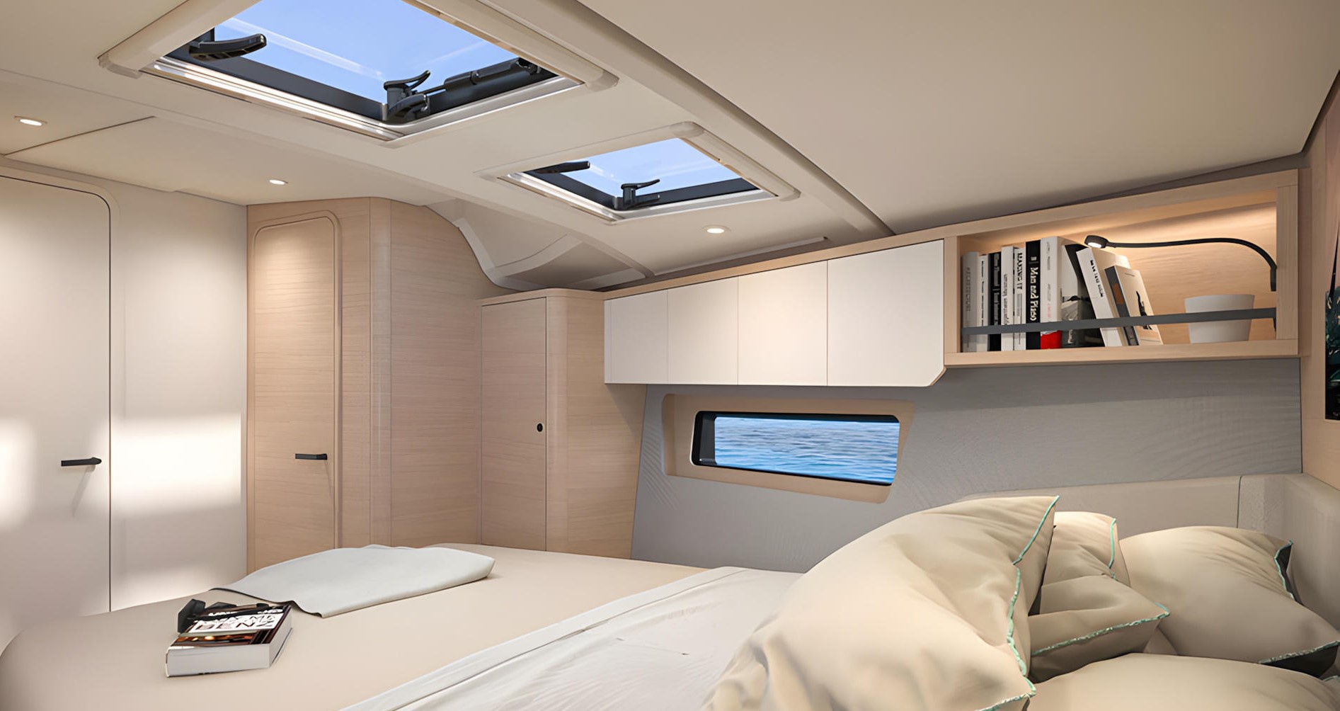 • Upwind she reaches more than 6.5 knots in a stable position, and downwind she convinces with her speed and great control. The modern hull and deck construction using the vacuum infusion process guarantees robustness and lightness, ideal for long Mediterranean cruises.