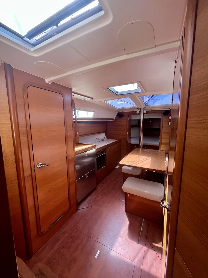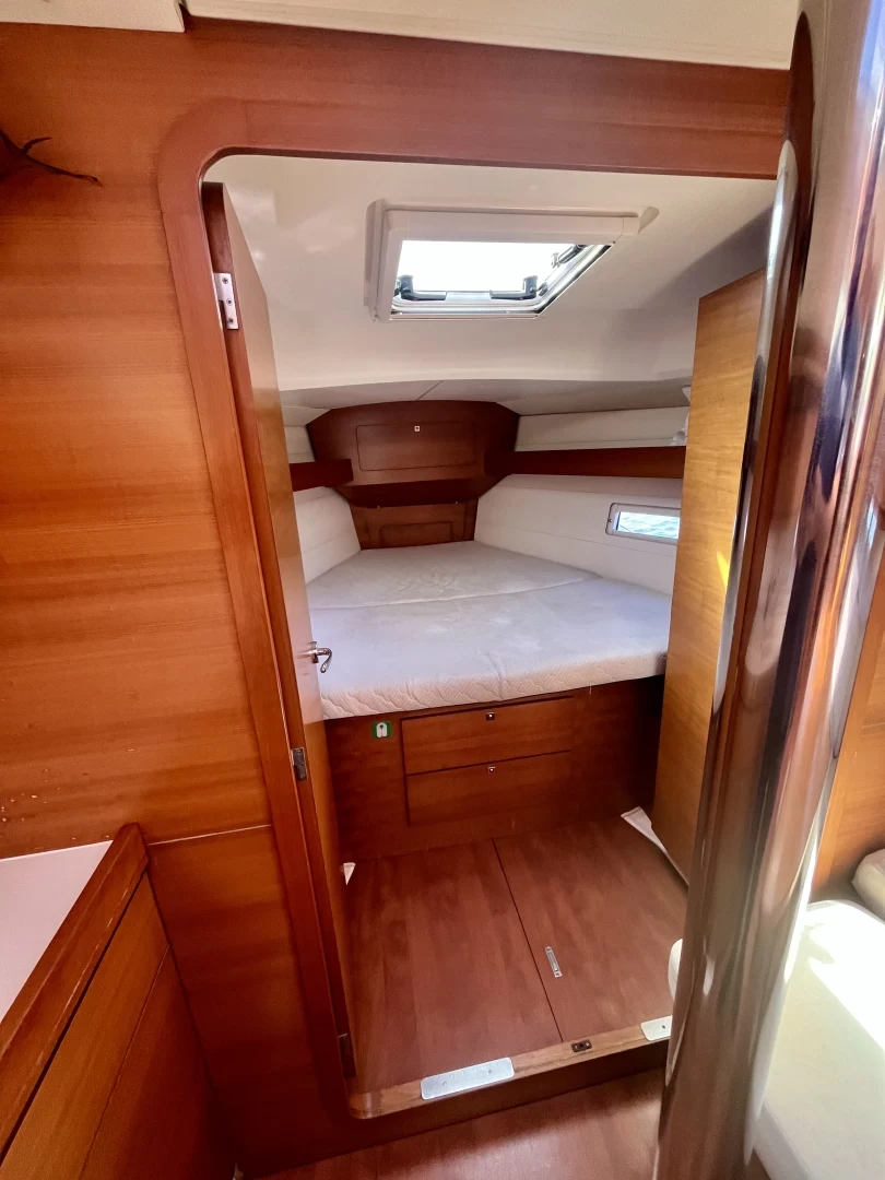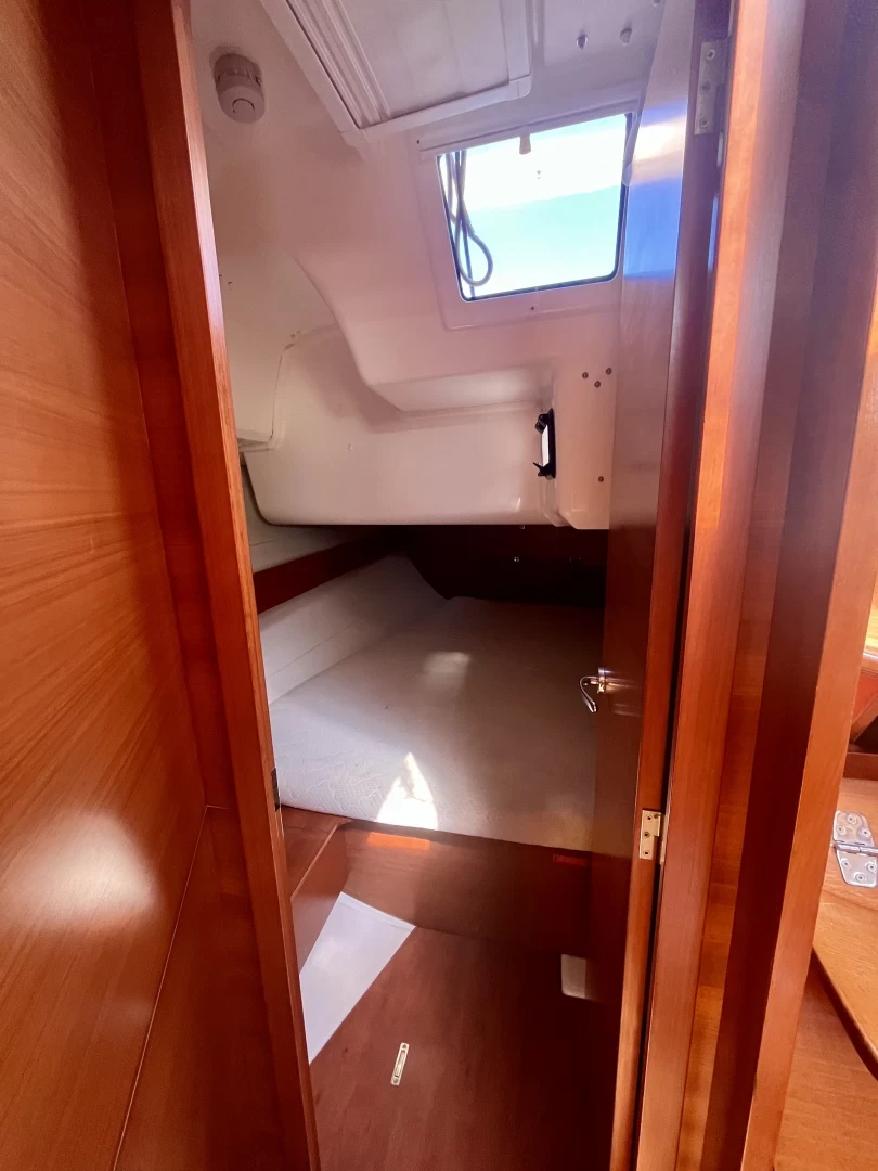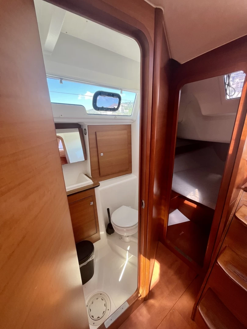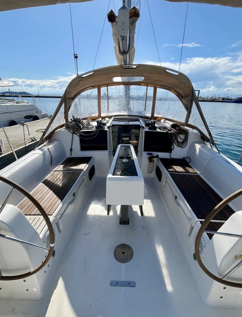 Bimini, Cockpit speakers, Dinghy, Battened mainsail, Outside shower, Furling genoa, Sprayhood, Cockpit cushions, Bilge pump, Bathing platform, Gangway, Loudspeaker (outside), Shower on deck.