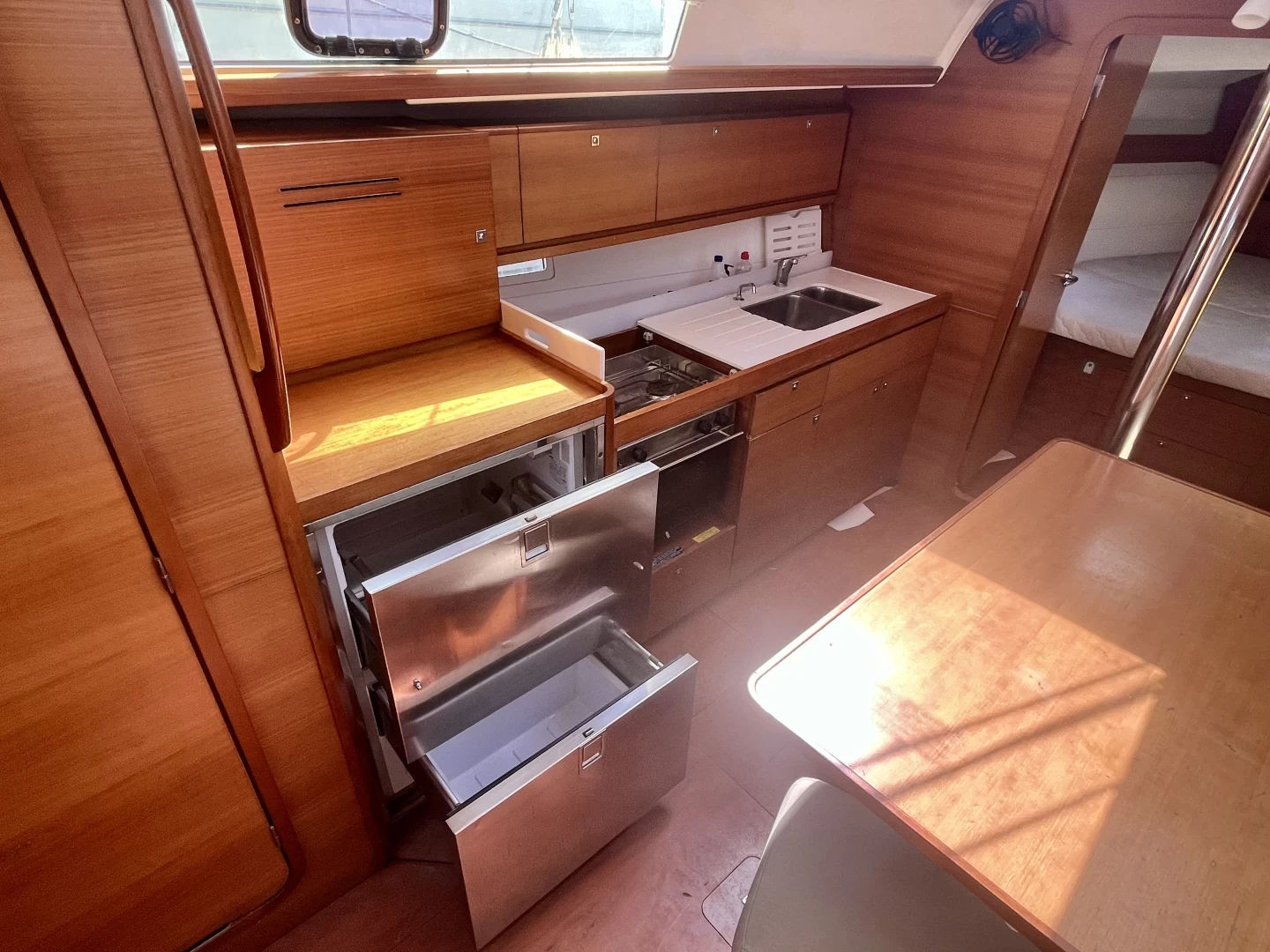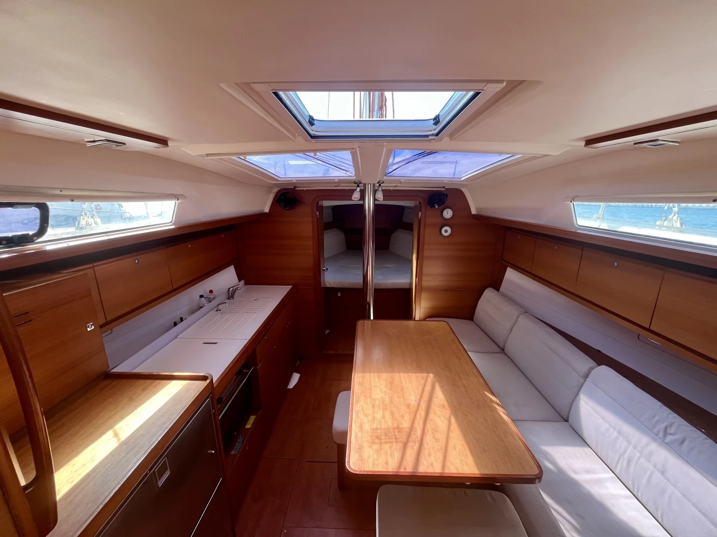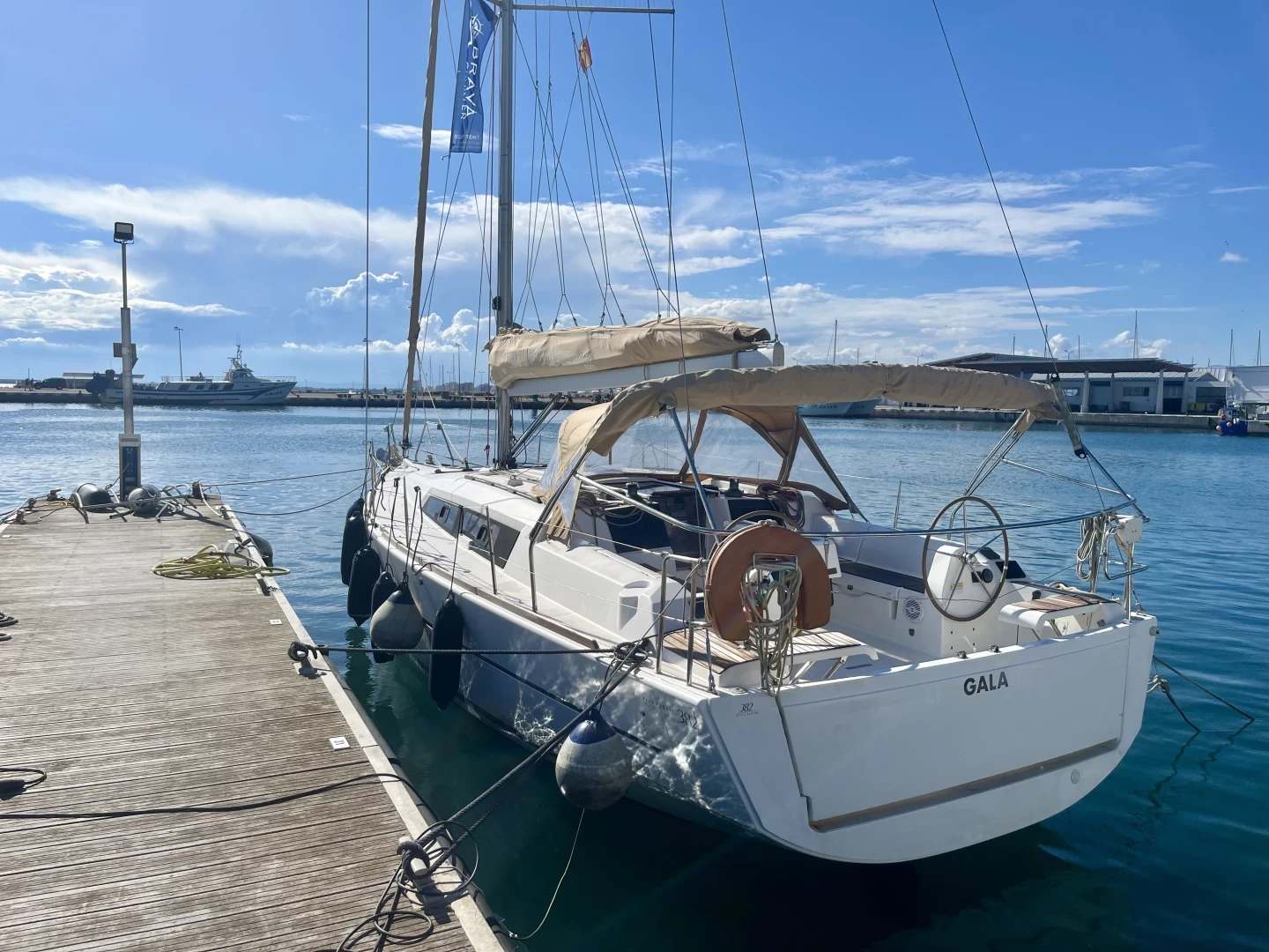 Bimini, Cockpit speakers, Dinghy, Battened mainsail, Outside shower, Furling genoa, Sprayhood, Cockpit cushions, Bilge pump, Bathing platform, Gangway, Loudspeaker (outside), Shower on deck.