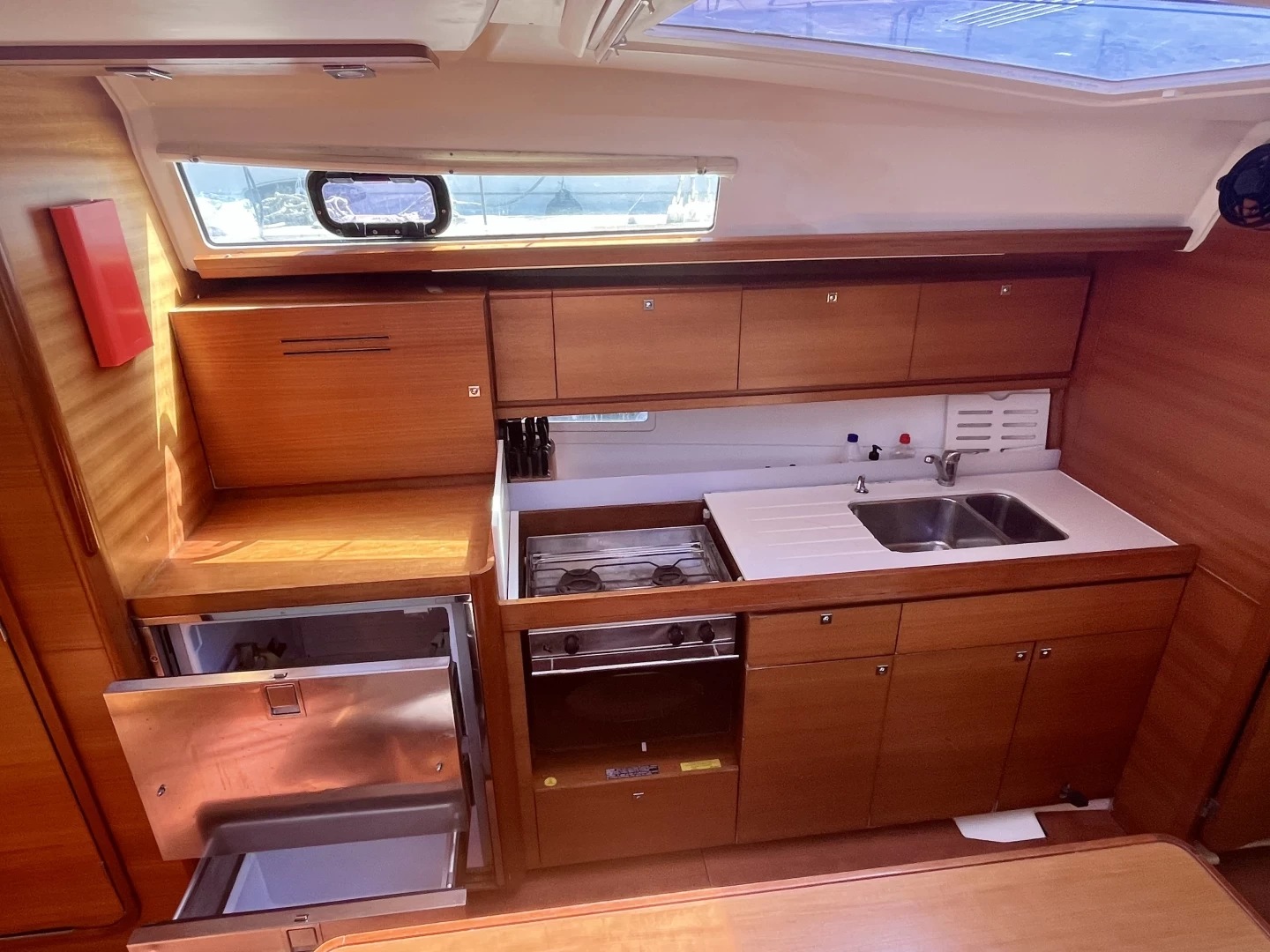 Autopilot, Binoculars, Electronic wind instruments, Gps, Plotter, Depth sounder, Vhf radio, Speedometer, Anchor box, First aid kit, Inflatable life raft, Navigation lights.