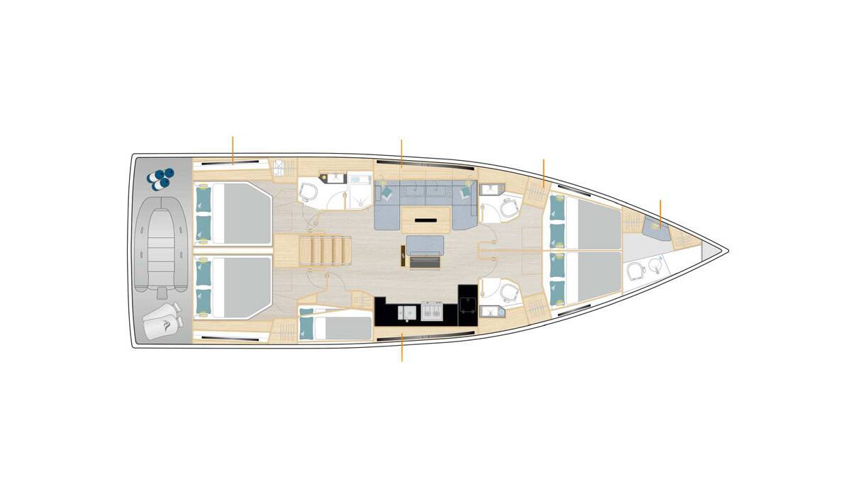 The Hanse 510 "Balance" can accommodate up to 12 people in 5 double cabins plus 1 additional cabin for the crew, and has 3 full bathrooms plus 1 additional bathroom with shower. Each space has been designed to offer comfort, privacy and style, both when sailing and at anchor.
