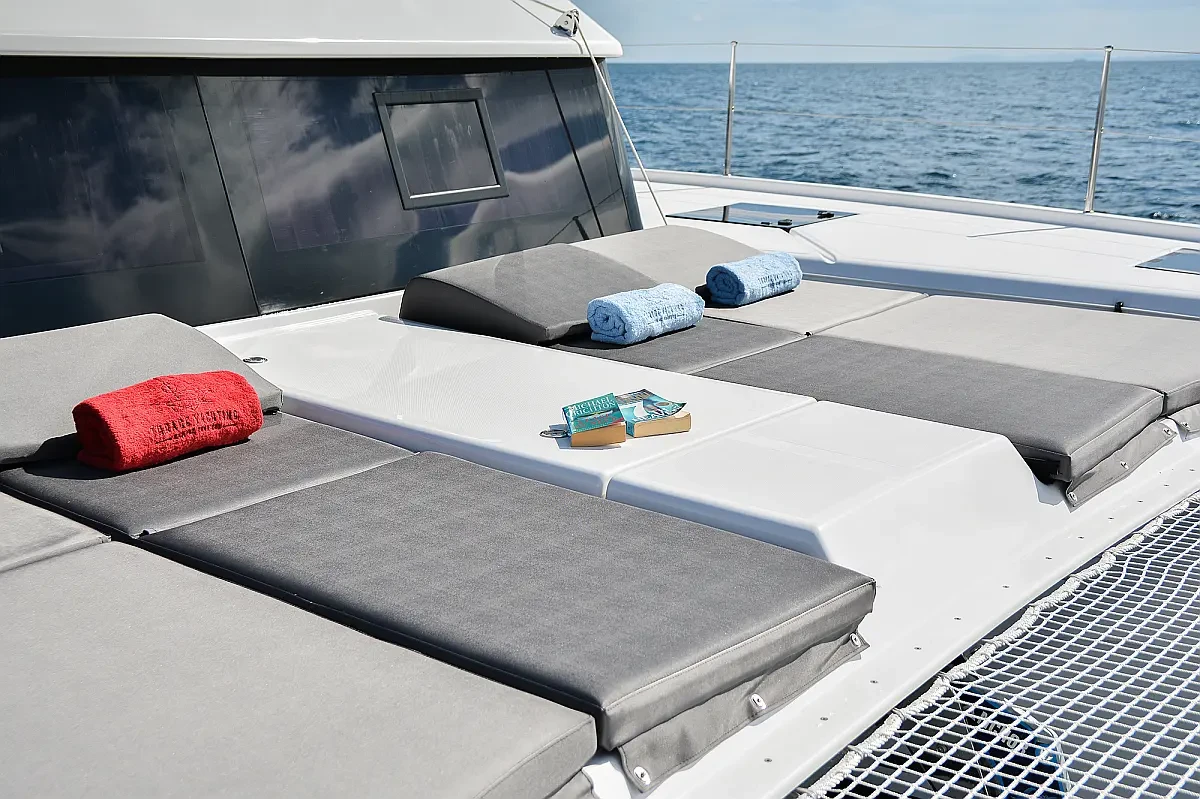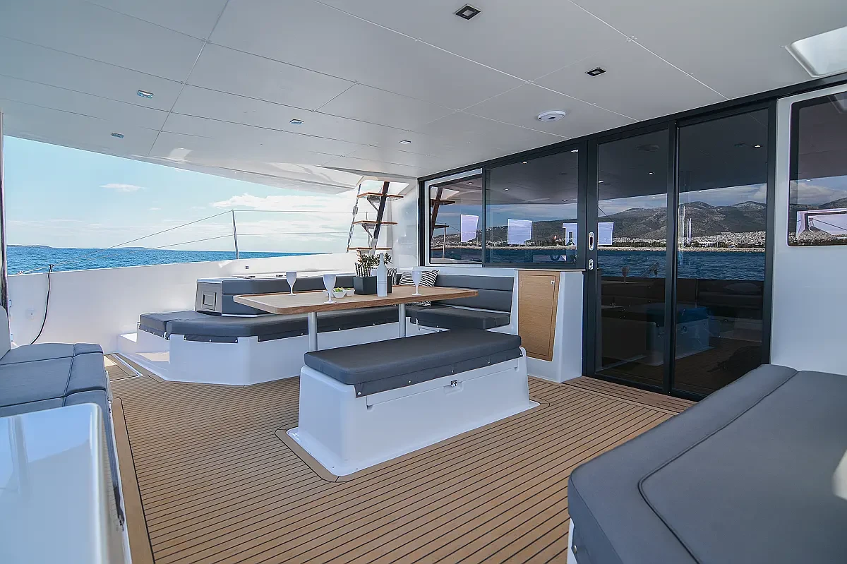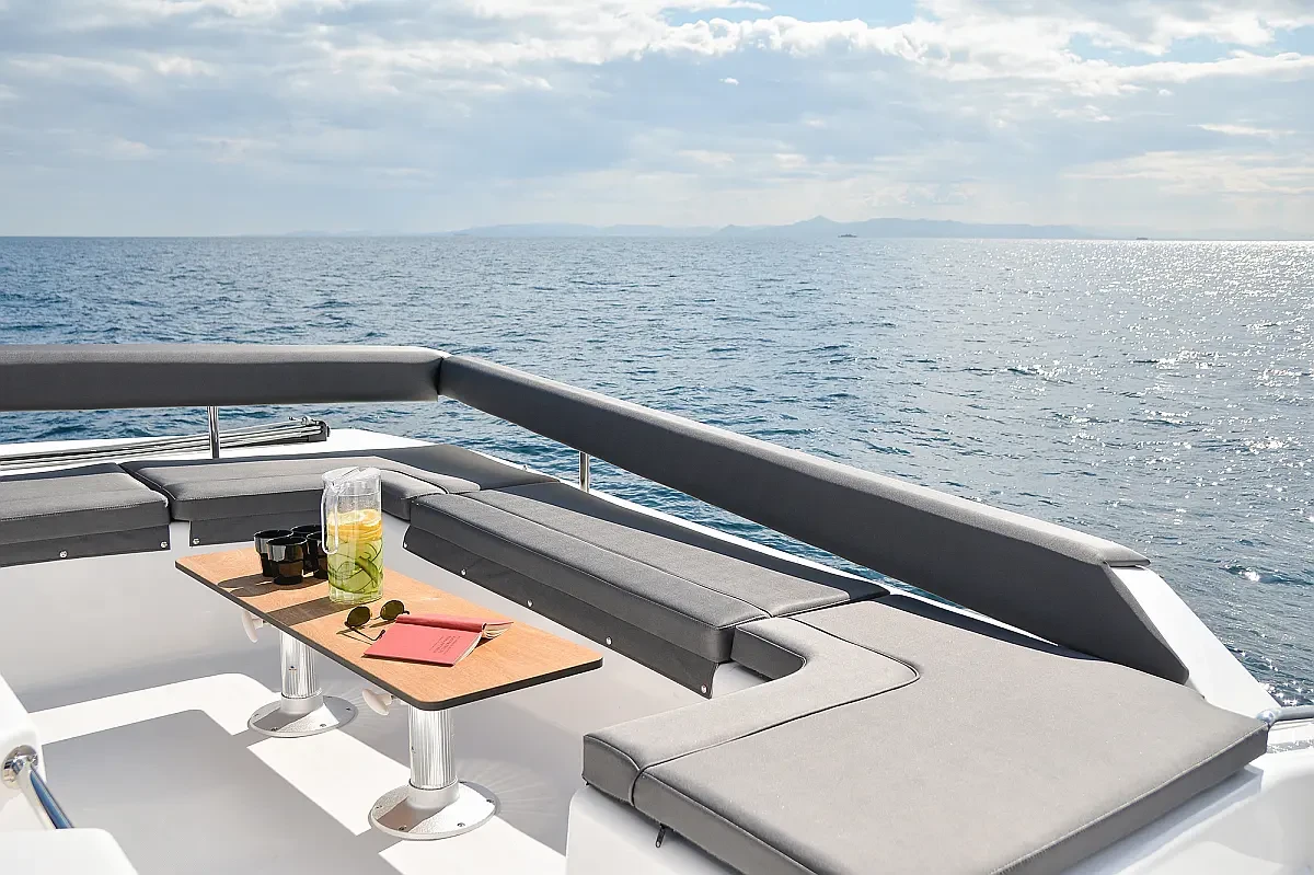 Con cinco áreas diferenciadas, todo el mundo podrá encontrar su propio lugar para relajarse y disfrutar. Un amplio Flybridge con una gran zona de asientos y mesa de bebidas, tumbonas bajo las velas, el comedor interior y exterior de planta abierta y una espaciosa cubierta para tomar el sol