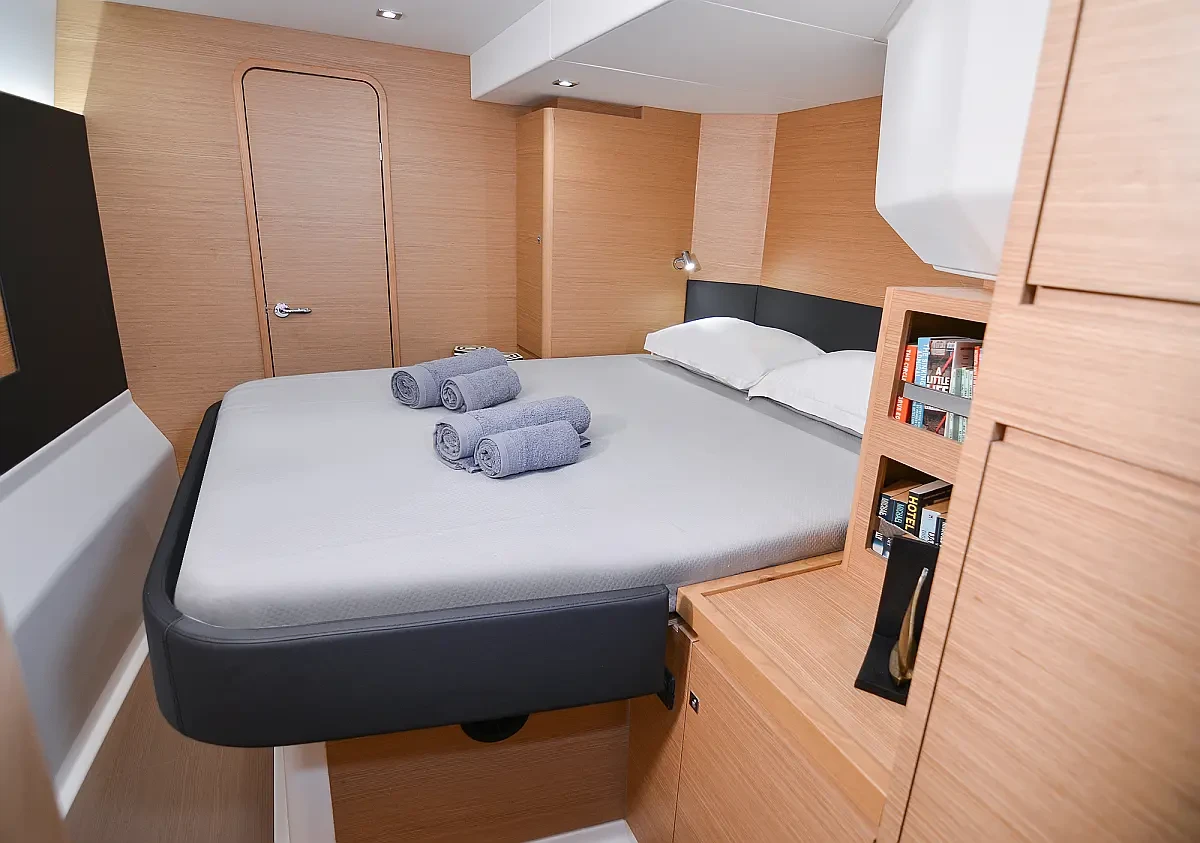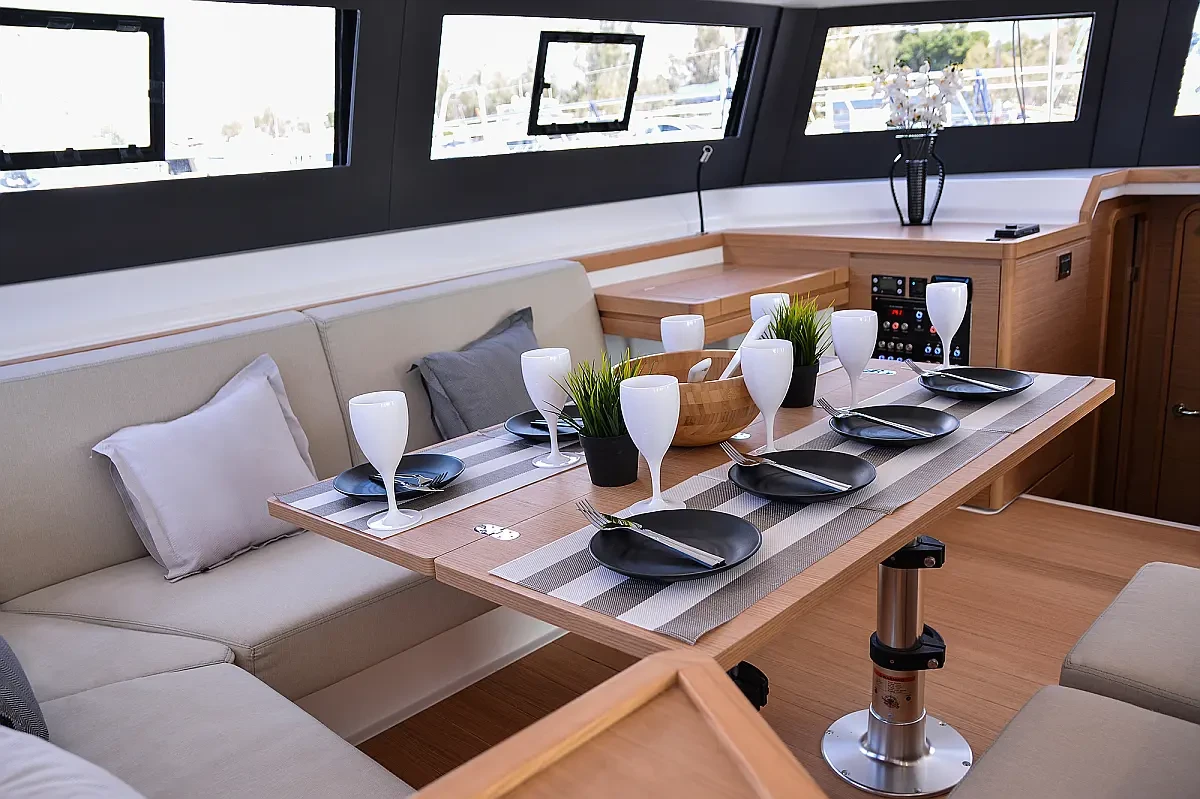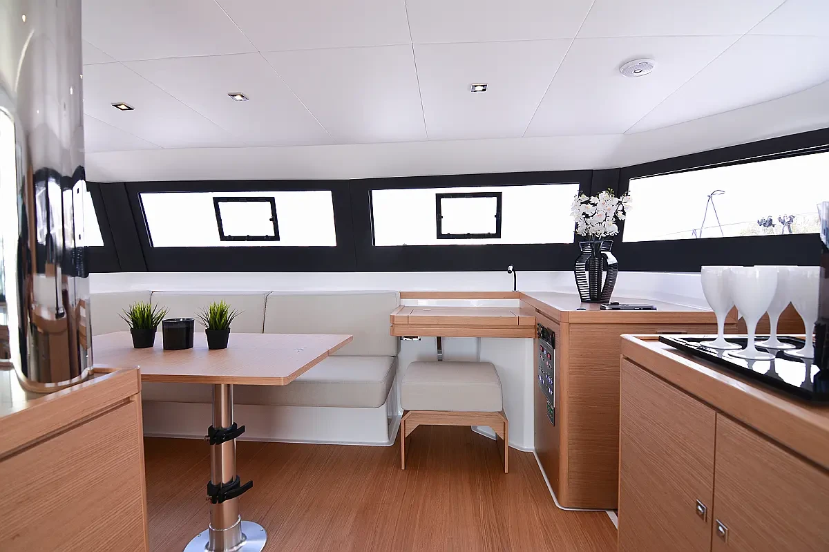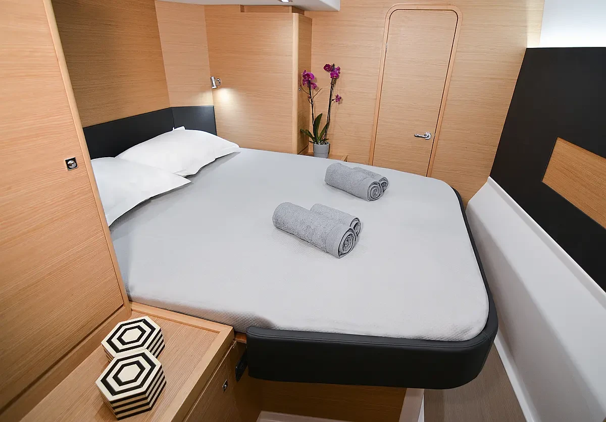 Hermosos interiores que aportan un toque de elegancia a su entorno. Cuatro camarotes dobles cada uno con su baño privado con artículos de tocador de lujo. Ilimitado de agua dulce (desalinizador), electricidad (generador) y aire acondicionado.