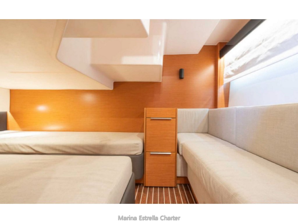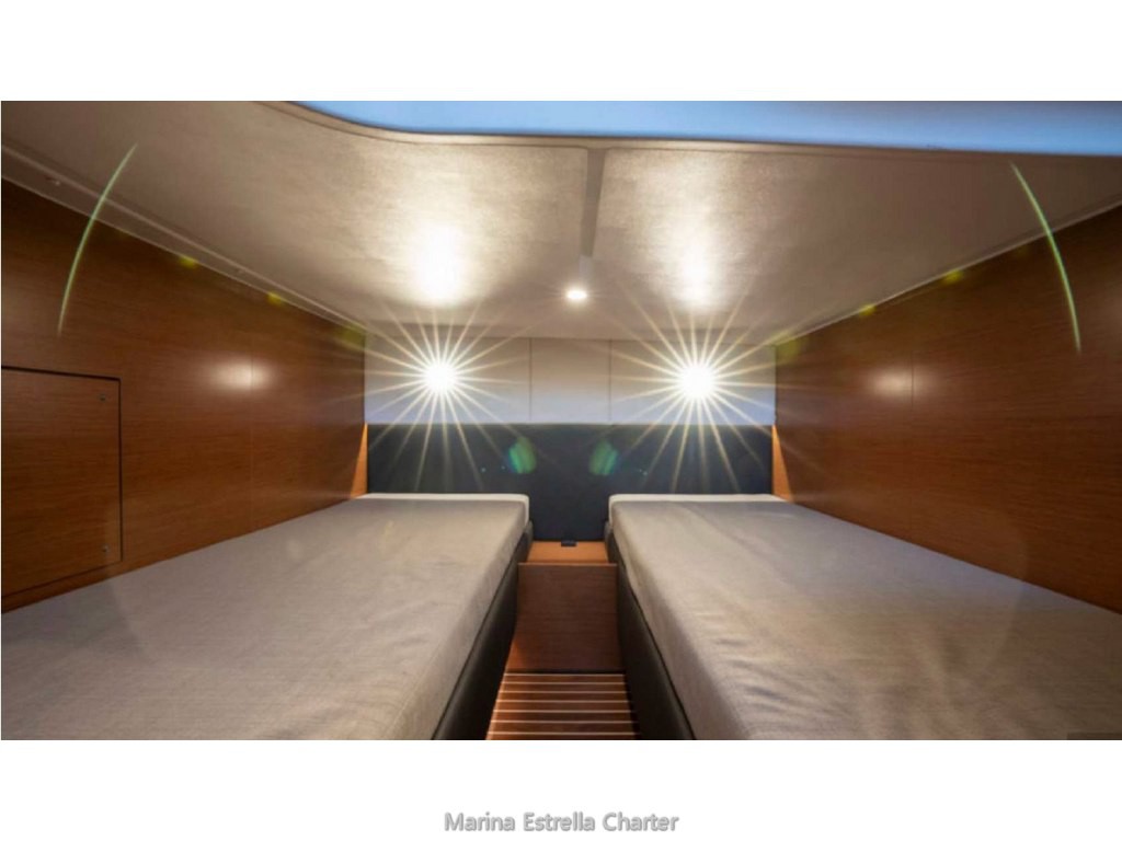 Dos cabinas luminosas: principal con cama doble (2,00 × 1,80 m) y cabina twin con dos camas individuales (2,00 × 0,90 m).