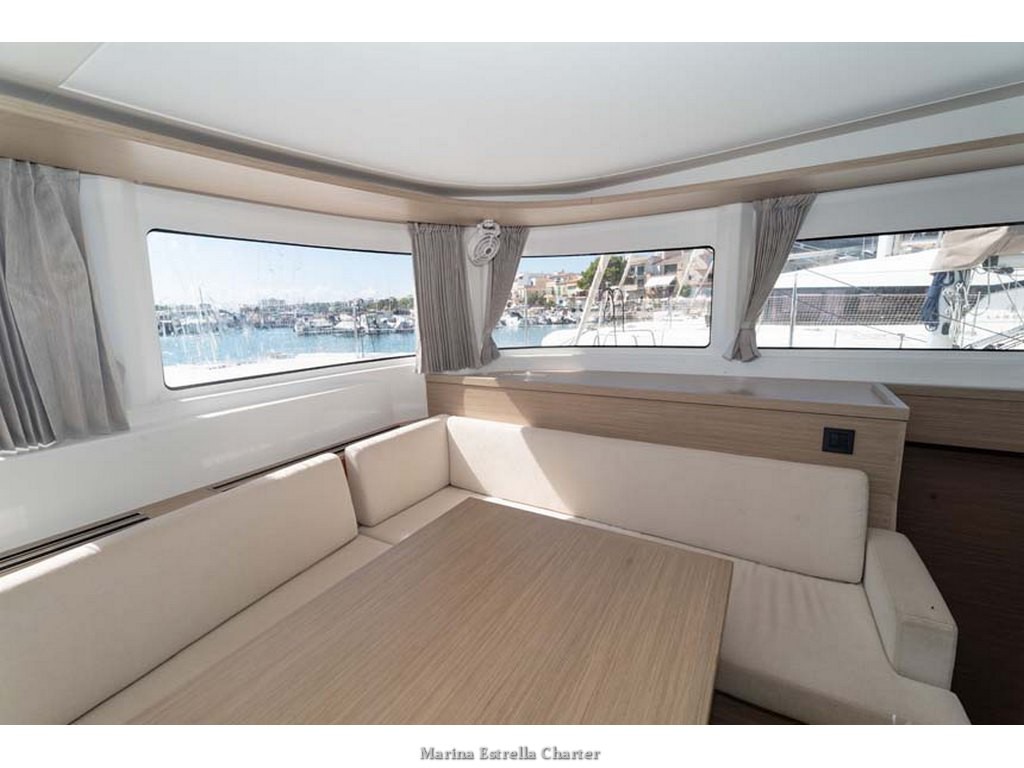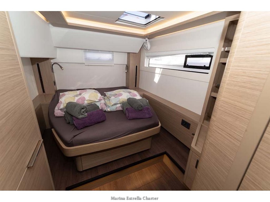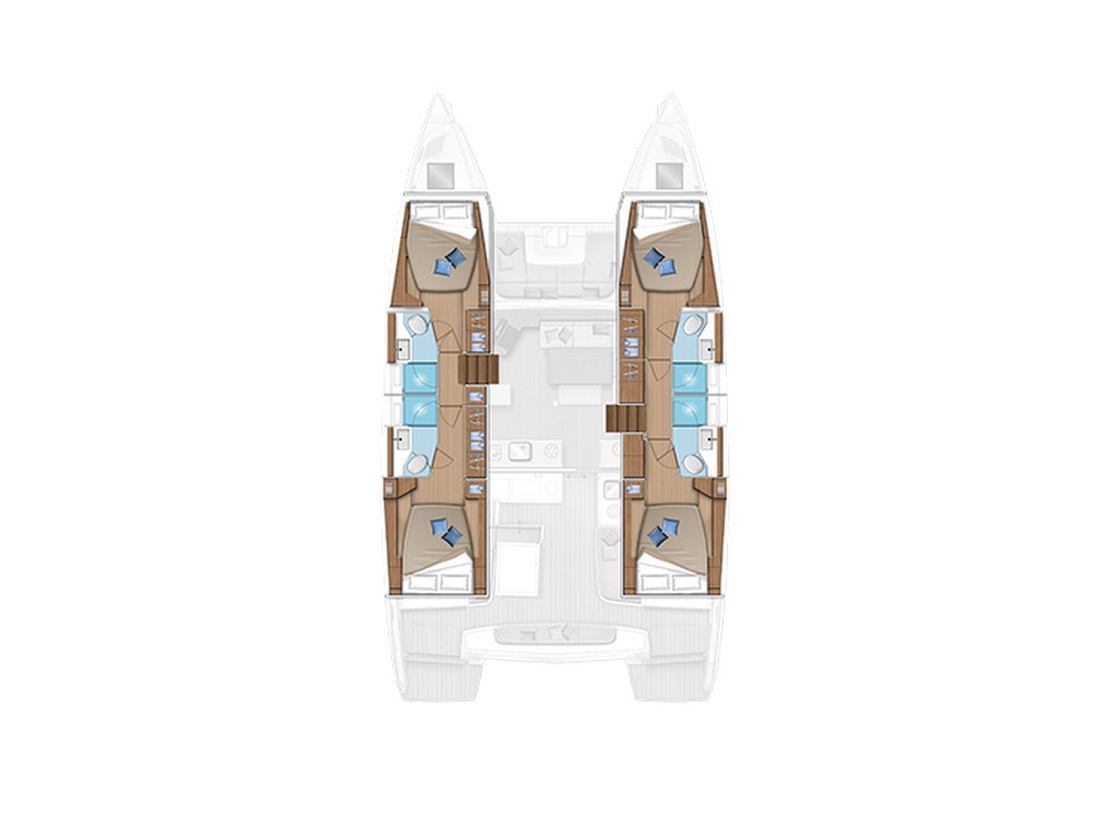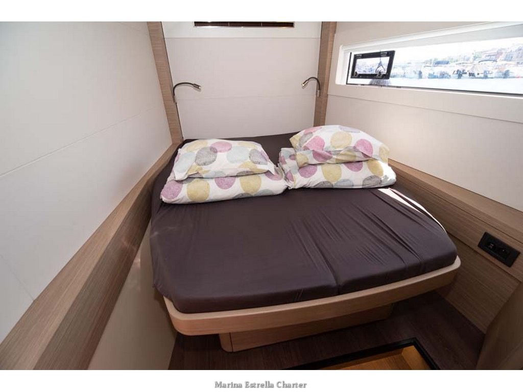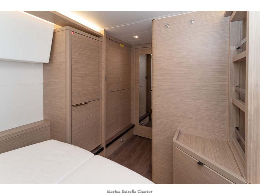 Su distribución permite alojar hasta 12 personas en pernocta, gracias a 4 cabinas dobles, salón convertible y 2 cabinas individuales en proa, que pueden ser utilizadas por la tripulación profesional en caso de contratar patrón o por parte de los invitados en alquileres sin patrón.
