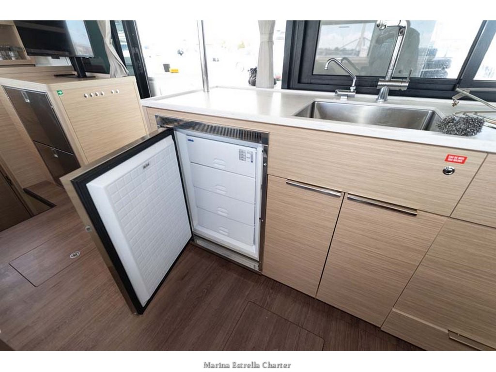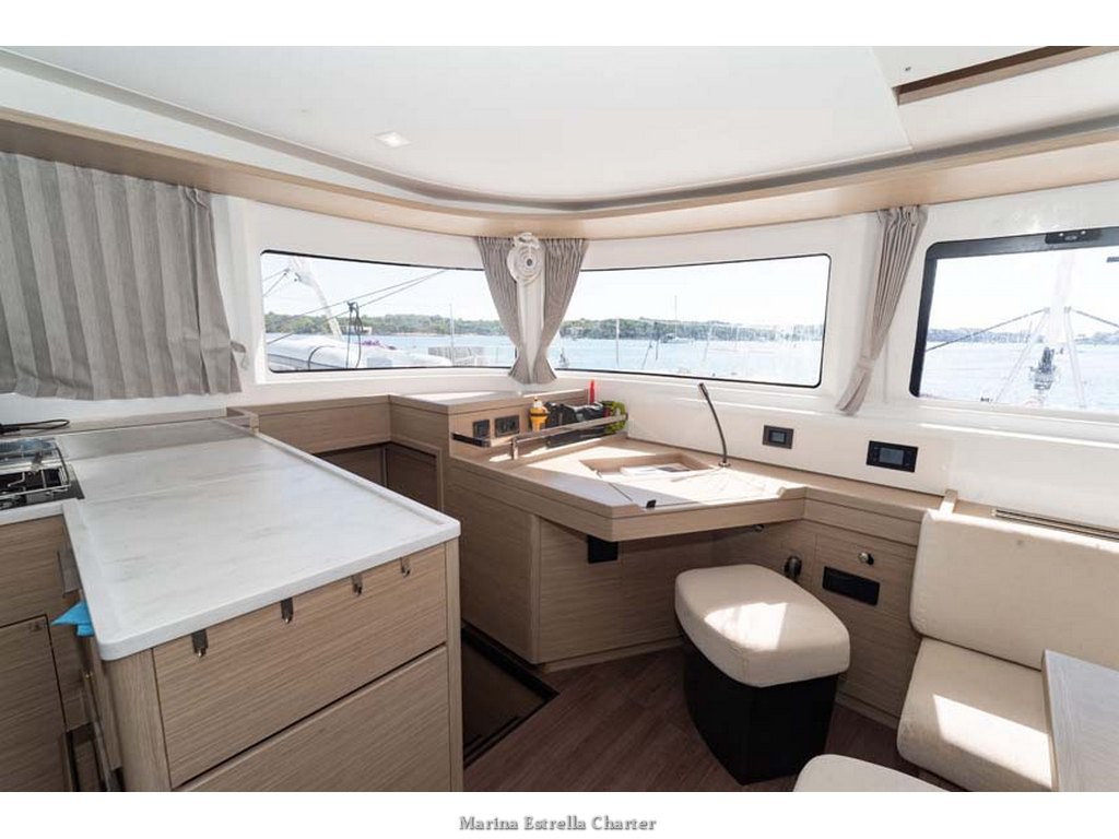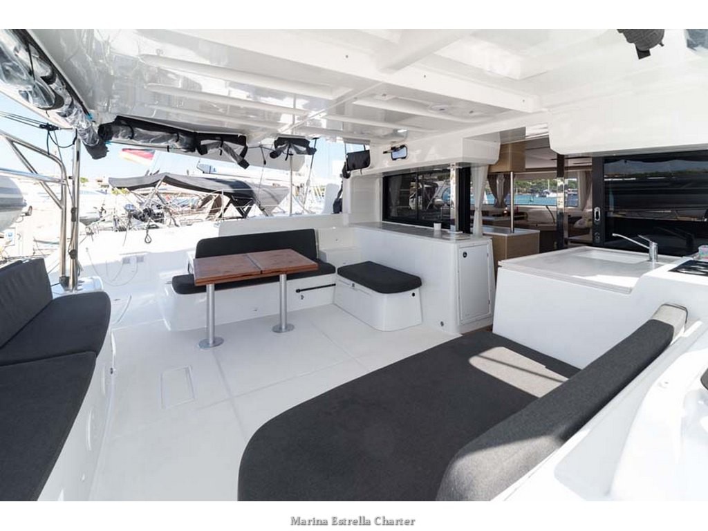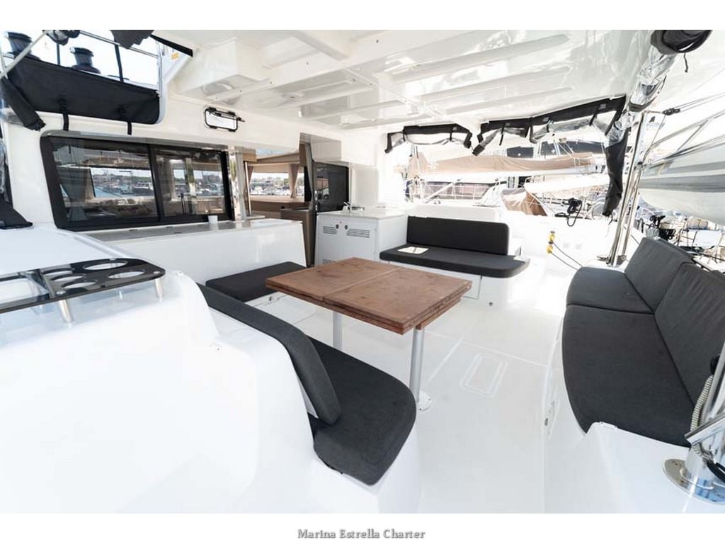 El Lagoon 46 destaca por su amplitud y estabilidad, con una bañera protegida, zona de comedor exterior y flybridge elevado que ofrece excelentes vistas durante la navegación. El interior es luminoso y funcional, con una cocina completamente equipada y un salón amplio que conecta perfectamente con el exterior.