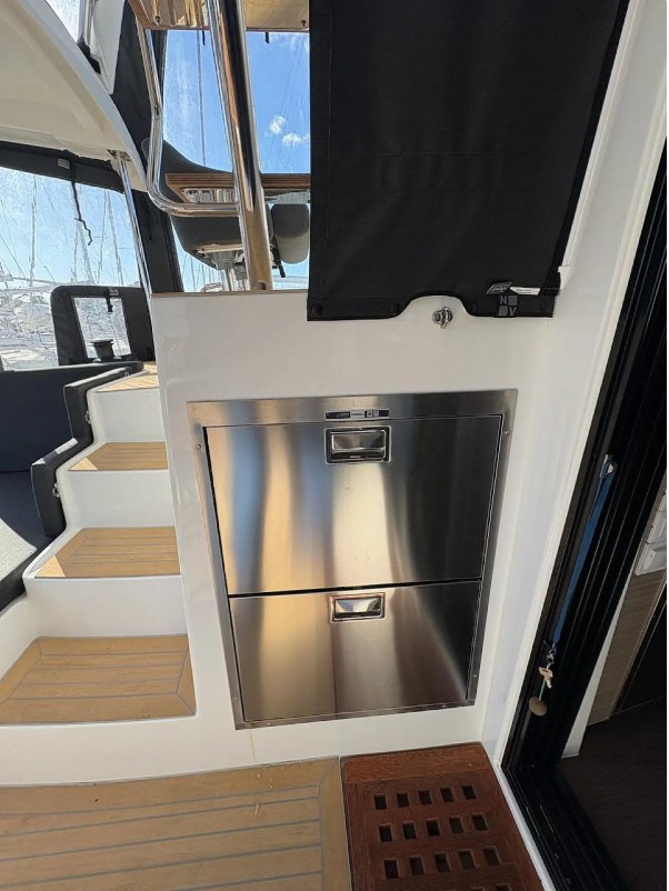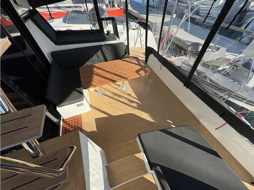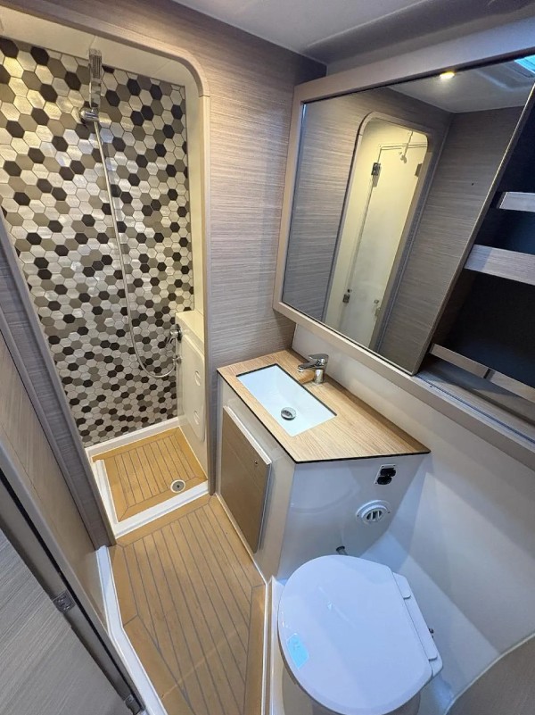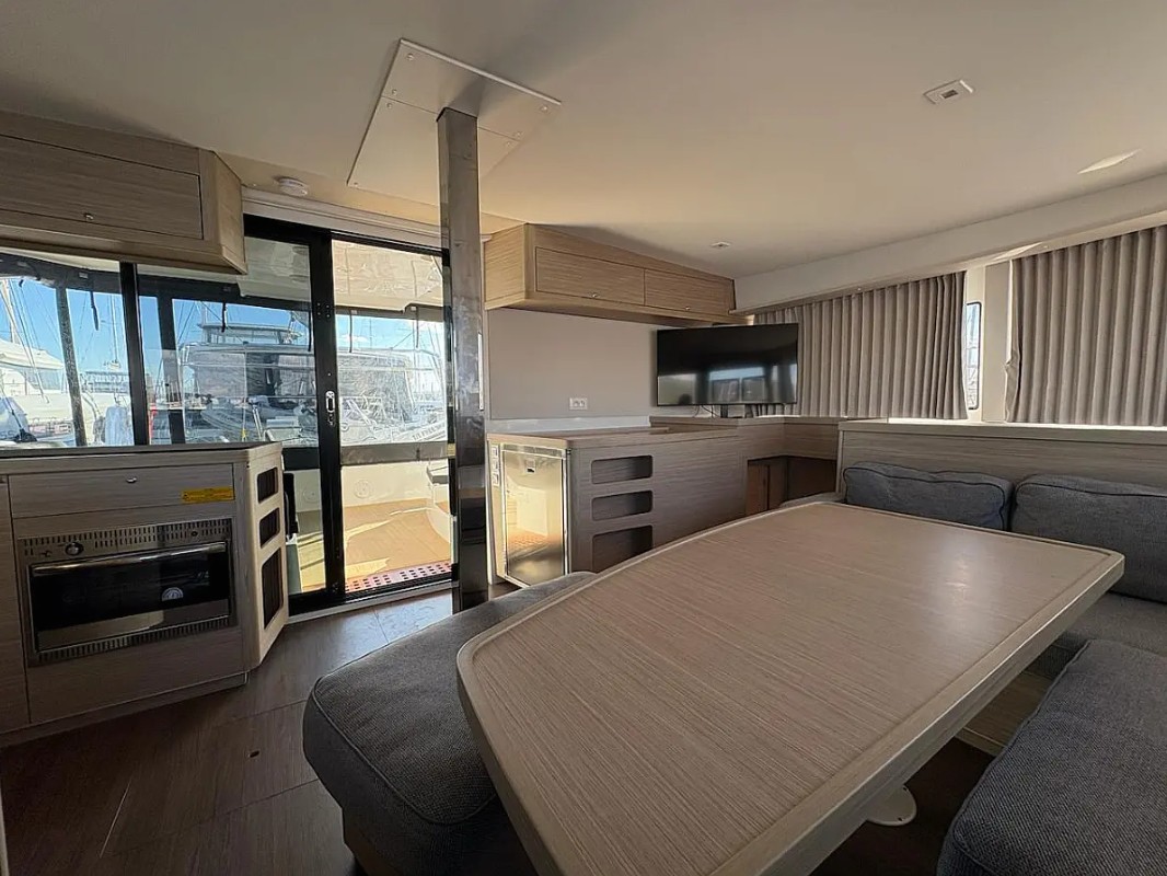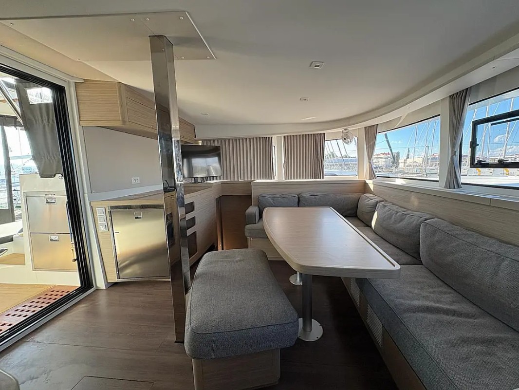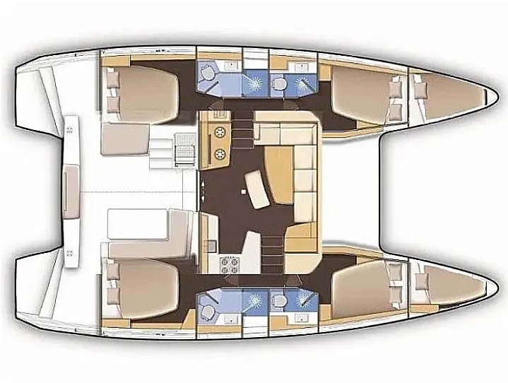 Ofrece 4 cabinas dobles con baño privado, más 2 plazas adicionales en el salón convertible, lo que permite alojar cómodamente hasta 10 personas en navegación. En el exterior, destaca su bañera amplia con colchonetas, zona de comedor y acceso directo al mar.