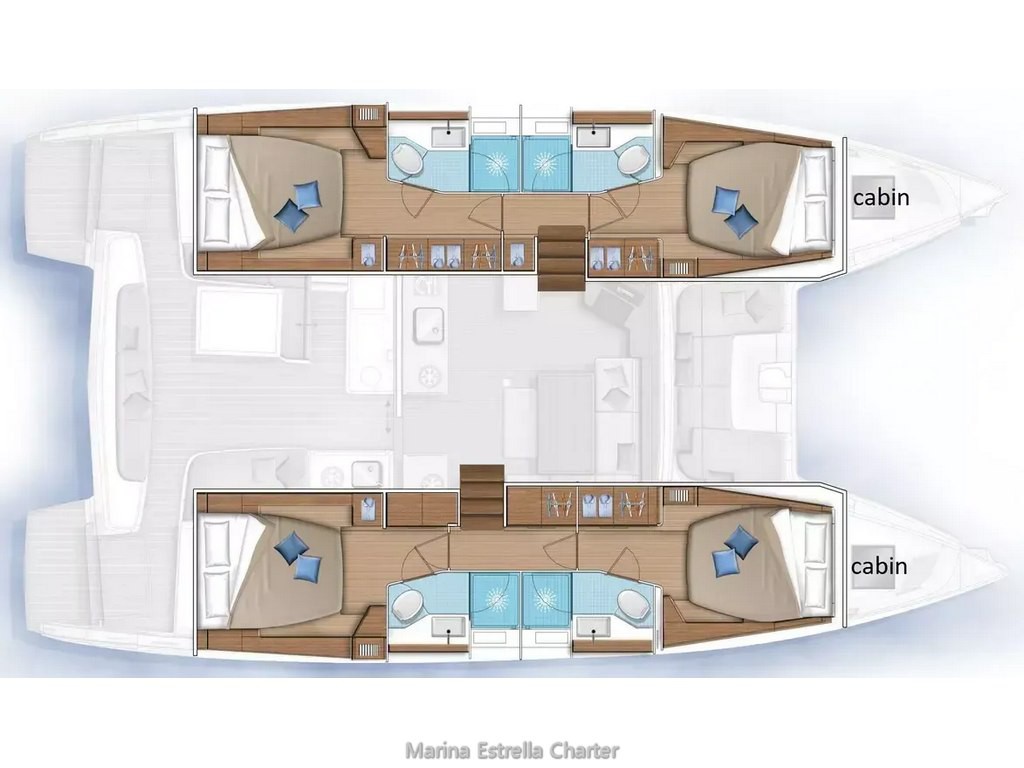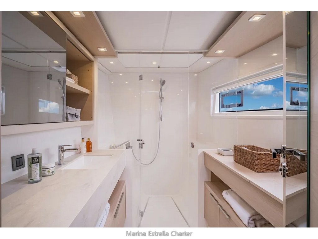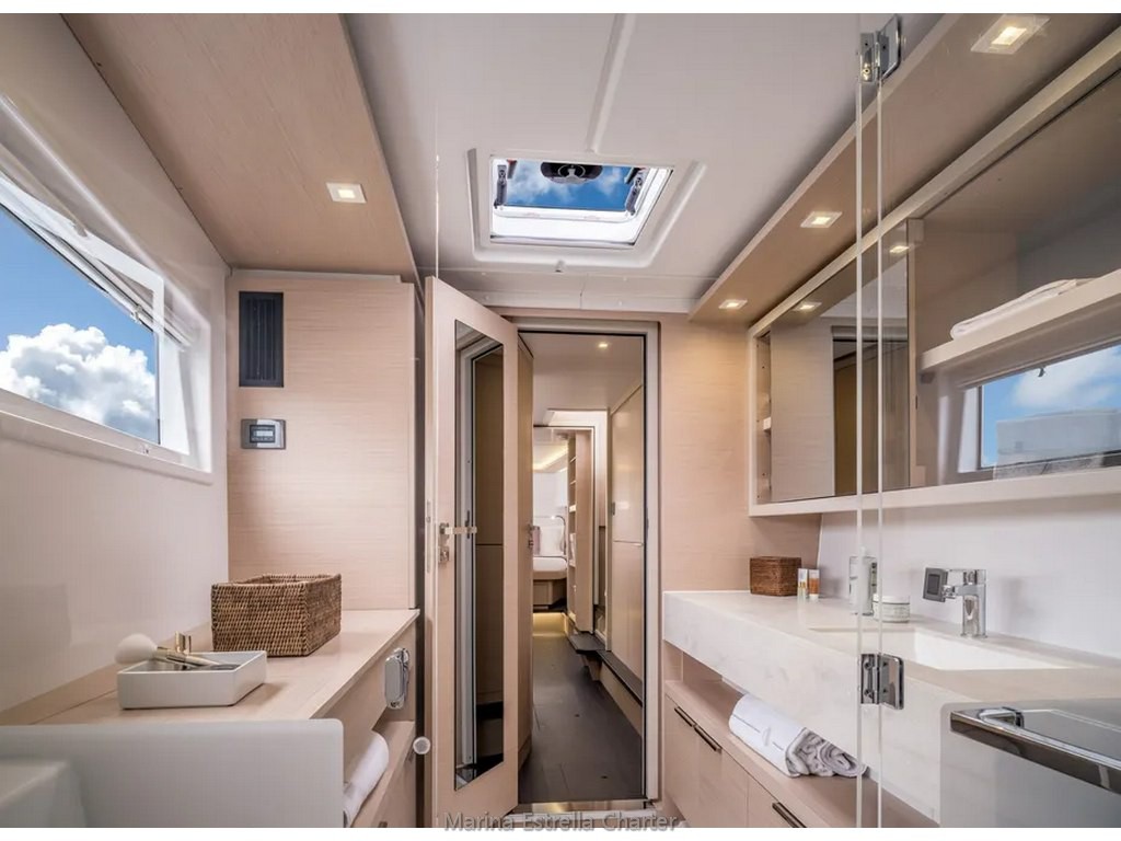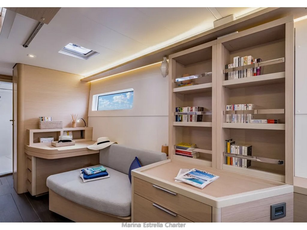 Ofrece una distribución interior muy confortable, con 4 cabinas dobles con baño privado, todas ellas con WC eléctricos, además de 2 cabinas adicionales para tripulación y un salón convertible, permitiendo acoger hasta 12 personas a bordo.