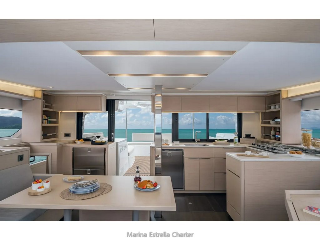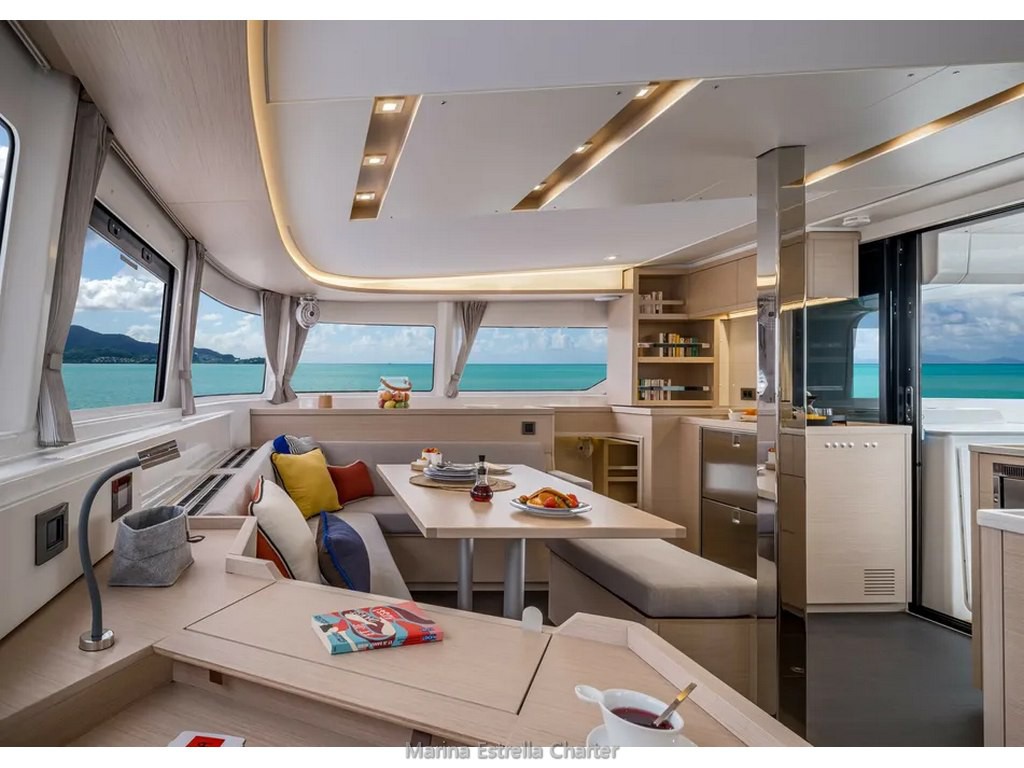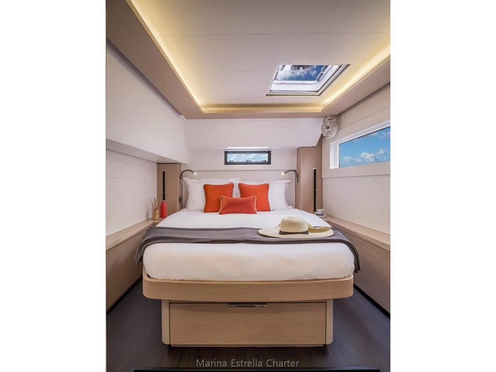 Este modelo incorpora todos los extras de confort más demandados: aire acondicionado en todas las cabinas, generador silencioso, potabilizadora, wifi a bordo, neveras, congelador, horno, cafetera Nespresso, sistema de sonido FUSION y una plataforma de popa amplia para disfrutar del mar.