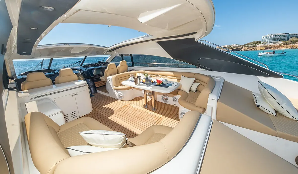 El "Creta" ha sido concebido para exprimir cada hora de una jornada en el mar. La bañera de popa es amplia y excepcionalmente cómoda, con sofás tapizados en beige dispuestos en forma de herradura alrededor de una mesa central, perfecta para los almuerzos a bordo, los aperitivos o simplemente para disfrutar de la navegación con el viento en la cara. El techo corredero —una de las señas de identidad del modelo— permite abrir o cerrar la cubierta en función del sol y el viento, creando un espacio de bañera único que combina la sensación de un barco abierto con la comodidad de uno cubierto. En proa, un amplio solarium con grandes cojines tapizados invita al descanso y al baño de sol frente al horizonte. En popa, la plataforma de baño con escalera facilita el acceso directo al agua para el baño y los juguetes acuáticos.