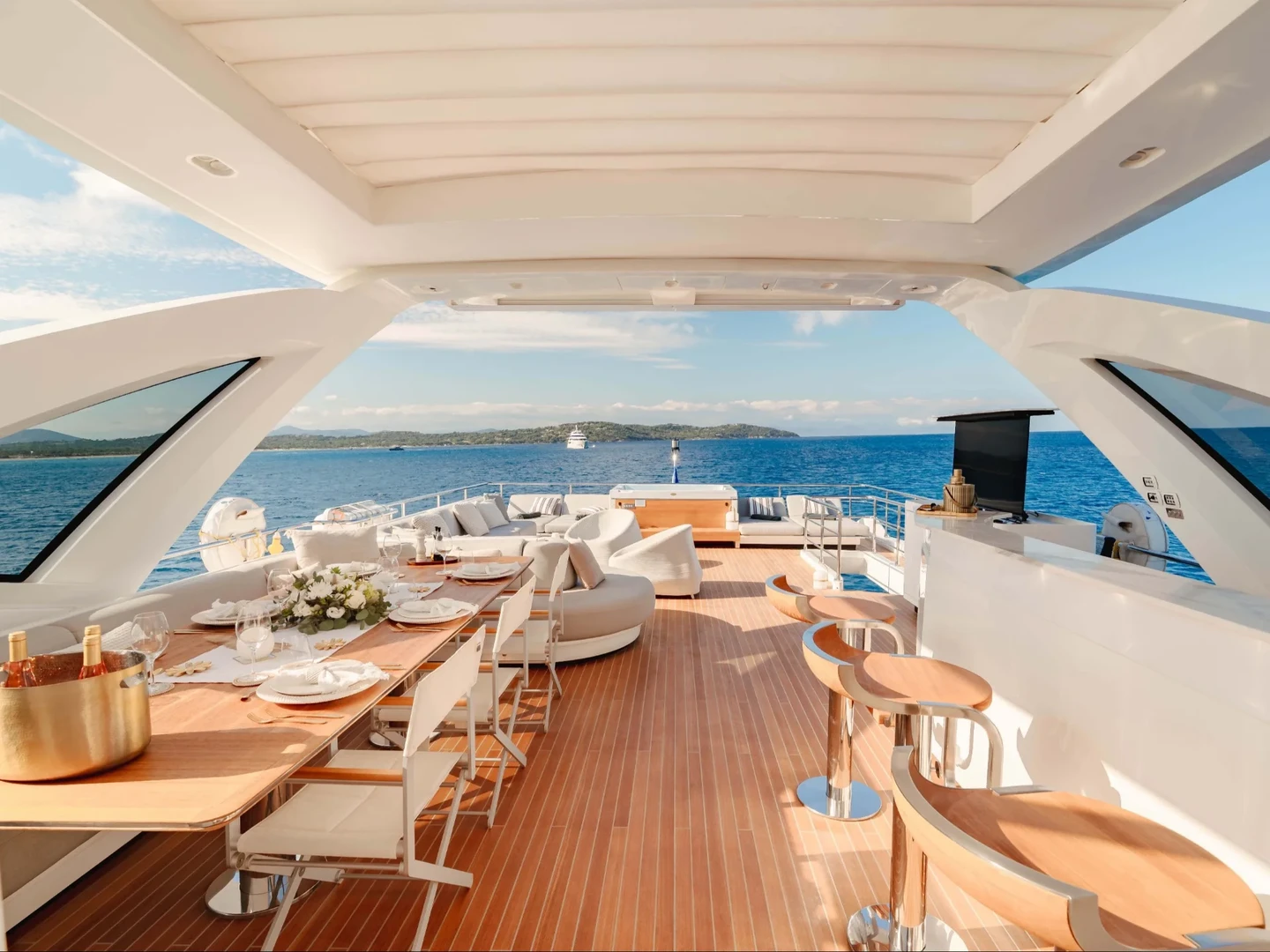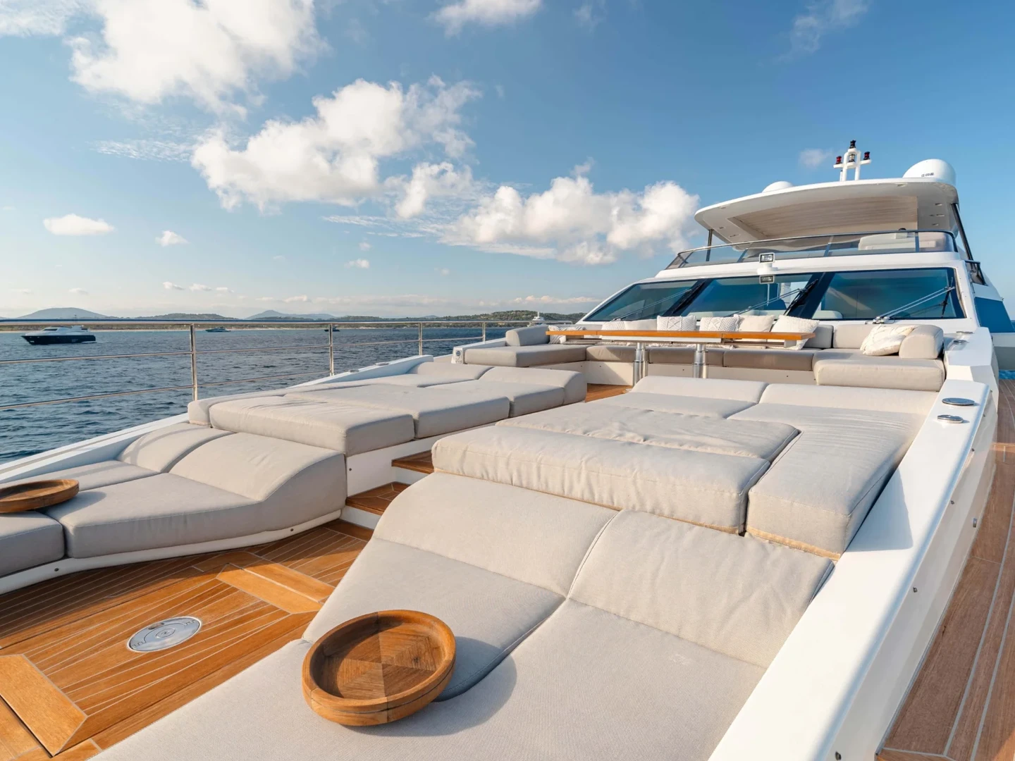 Los espacios exteriores del NEMESIS están pensados para disfrutar del mar al máximo: un flybridge con jacuzzi, zonas chill-out, comedor exterior y una amplia plataforma hidráulica de baño para acceder fácilmente al agua. Su diseño moderno y funcional crea el ambiente ideal tanto para el relax como para el entretenimiento.