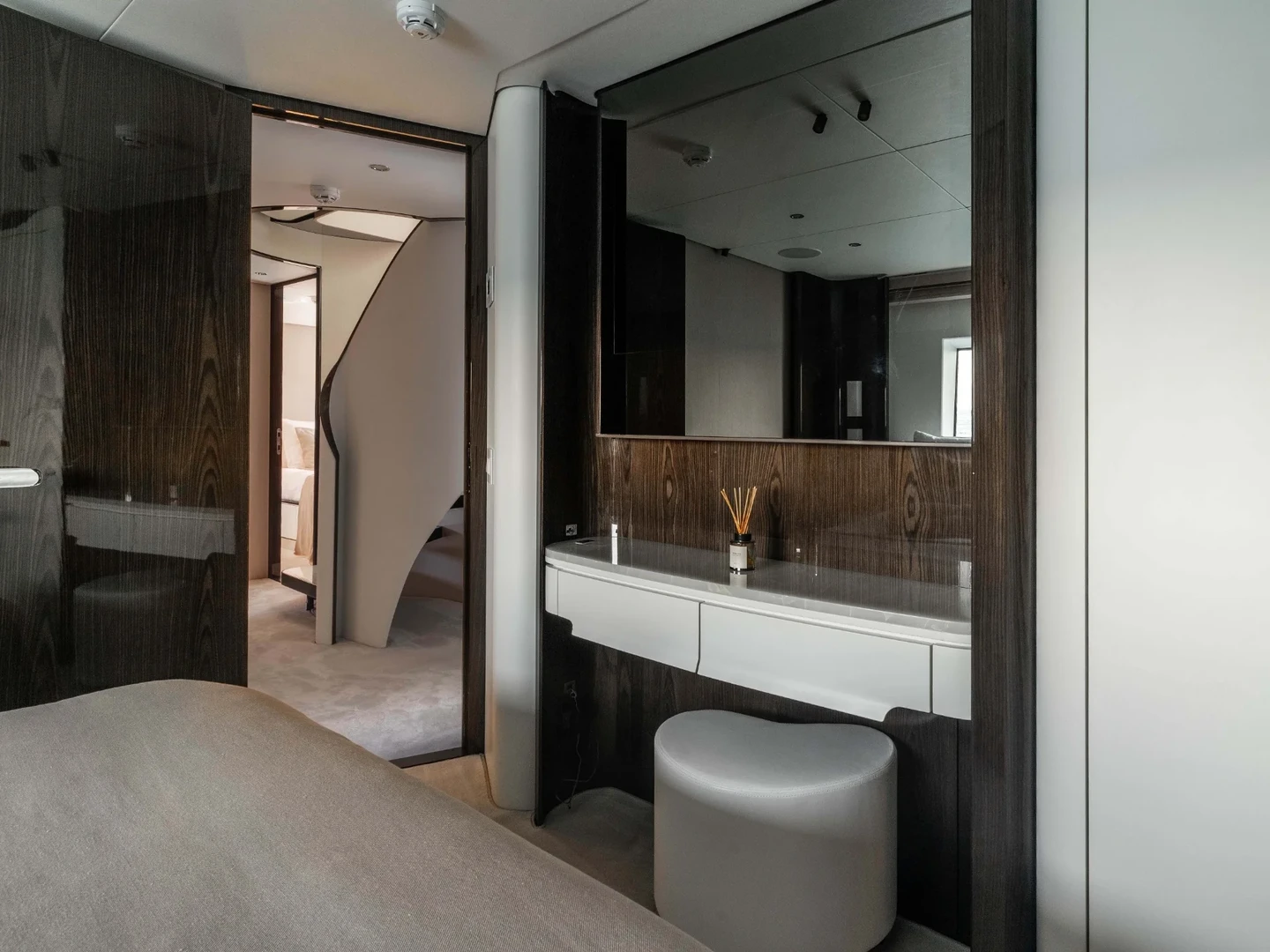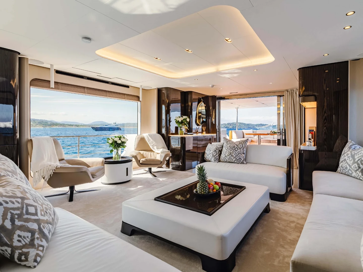 En su interior, el yate cuenta con un diseño sofisticado y acabados de alta gama. Ofrece 5 cabinas con baño privado, incluyendo una espectacular suite principal y espaciosas cabinas para los demás invitados. Hasta 10 personas pueden pernoctar a bordo con el máximo nivel de comodidad.