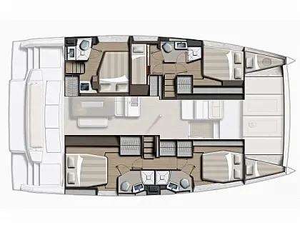 Tiene capacidad para hasta 10 personas, en 4 cabinas dobles y 1 cabina con literas, además de 5 baños completos con ducha, lo que garantiza confort y privacidad a bordo. Dispone además de 2 cabinas individuales para tripulación si se necesita