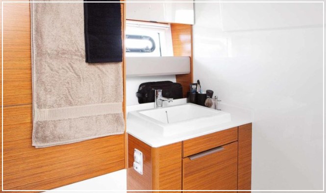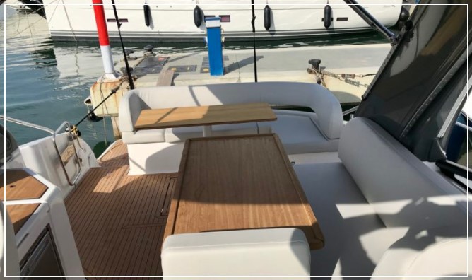 En el exterior, la bañera es uno de sus grandes puntos fuertes: amplia, cómoda y muy bien aprovechada, con bimini en proa y en bañera para crear zonas de sombra tanto durante la navegación como en el fondeo. La gran plataforma de baño, la escalera y la ducha en popa facilitan el acceso al mar y hacen que los momentos de baño sean parte esencial de la experiencia a bordo.