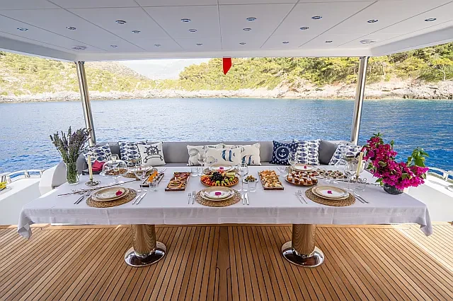 Con 27 metros de elegancia, 4 camarotes y espacio para 8 invitados, disfrutarás del mar con el máximo confort y una tripulación de 4 profesionales dedicada a tu bienestar.