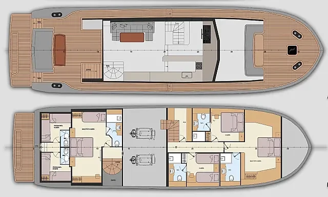| 1 cabina doble, 2 cabinas maestras, 1 cabina gemela, 1 cabina para la tripulación, | ||