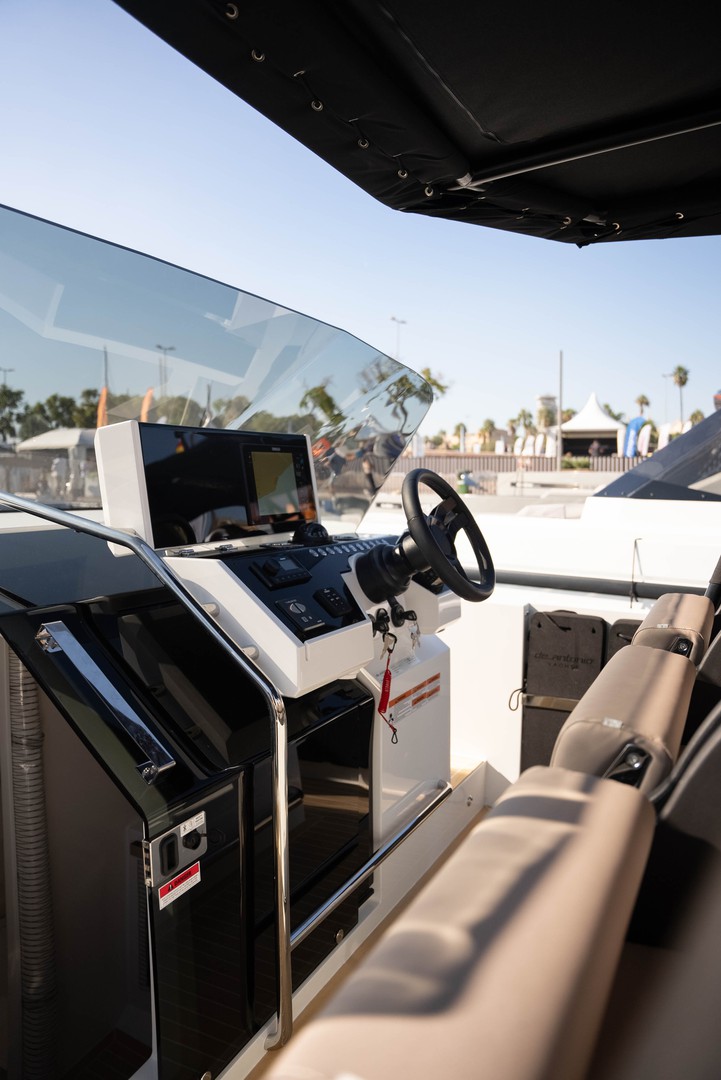 Su diseño abierto y funcional aprovecha al máximo el espacio exterior, con dos zonas de solárium, una en proa y otra en popa, donde descansar, charlar o disfrutar de un aperitivo frente al mar. La zona de comedor exterior con mesa y sofás, el toldo bimini, la plataforma de baño y la ducha en cubierta aseguran comodidad durante toda la jornada.