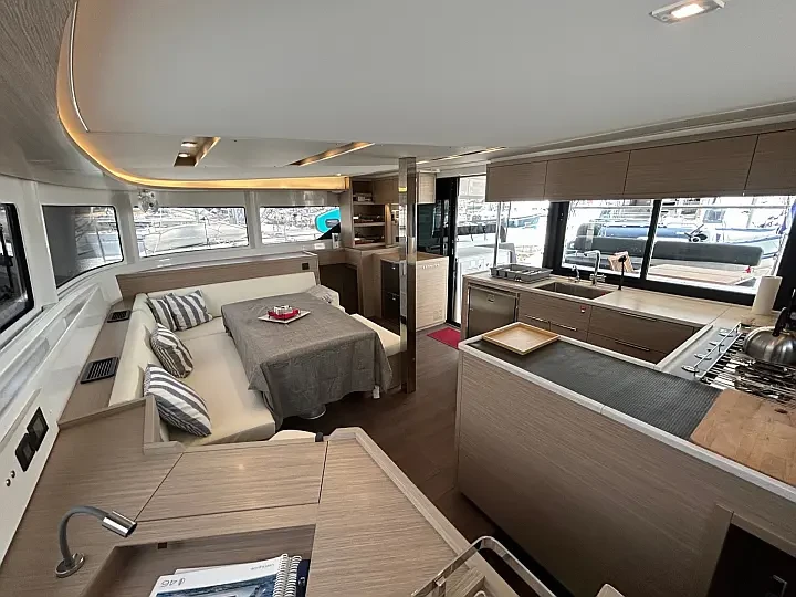 En el exterior, destaca una amplia zona de solárium en proa con cómodas colchonetas integradas, perfecta para relajarse al fondeo o durante la navegación. El flybridge tipo lounge ofrece un segundo espacio de descanso con otra zona de solárium adicional, ideal para disfrutar de las vistas panorámicas mientras se navega. La bañera de popa, espaciosa y bien protegida, se conecta a través de puertas correderas con el salón interior, creando un entorno abierto y muy fluido entre interior y exterior.