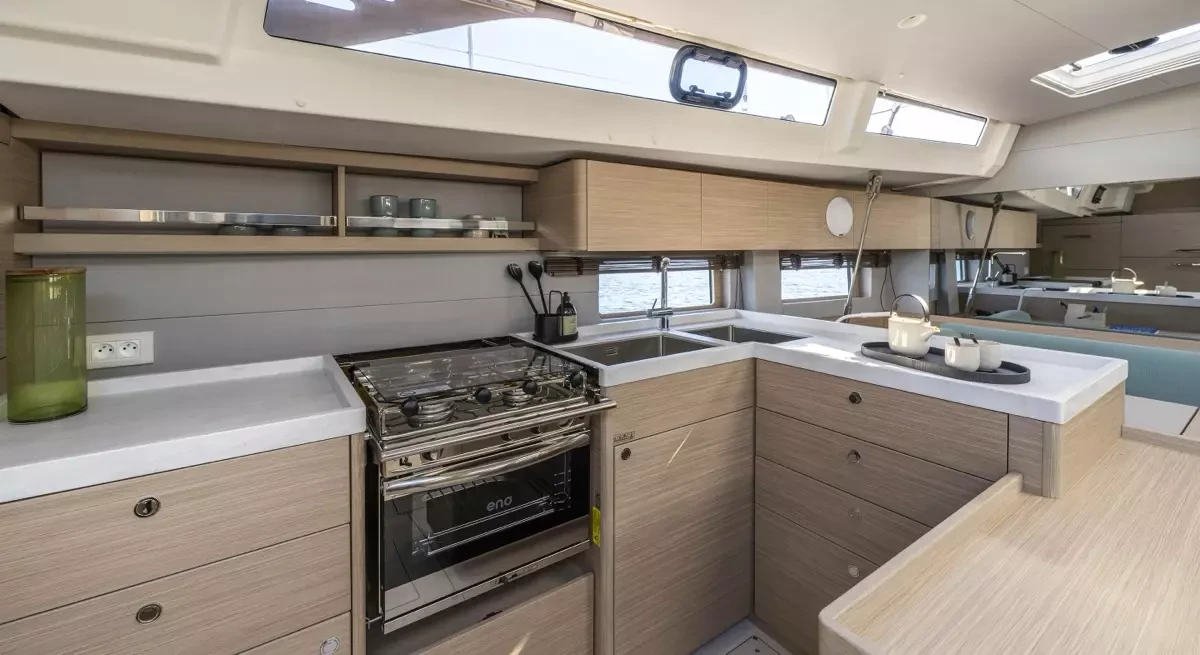 En el interior, cada detalle contribuye a crear un ambiente tranquilo y elegante. La característica del Oceanis 52 , da paso a un luminoso espacio de estar, donde se integra armoniosamente la cocina en forma de "C". Provisto de un frigorífico de altura completa