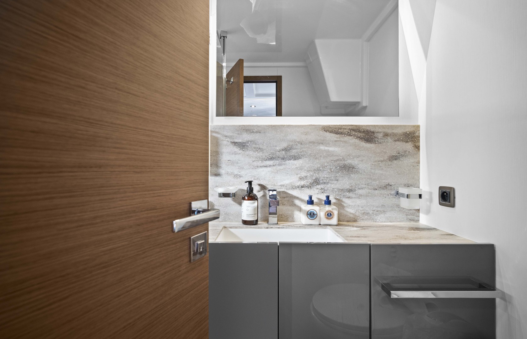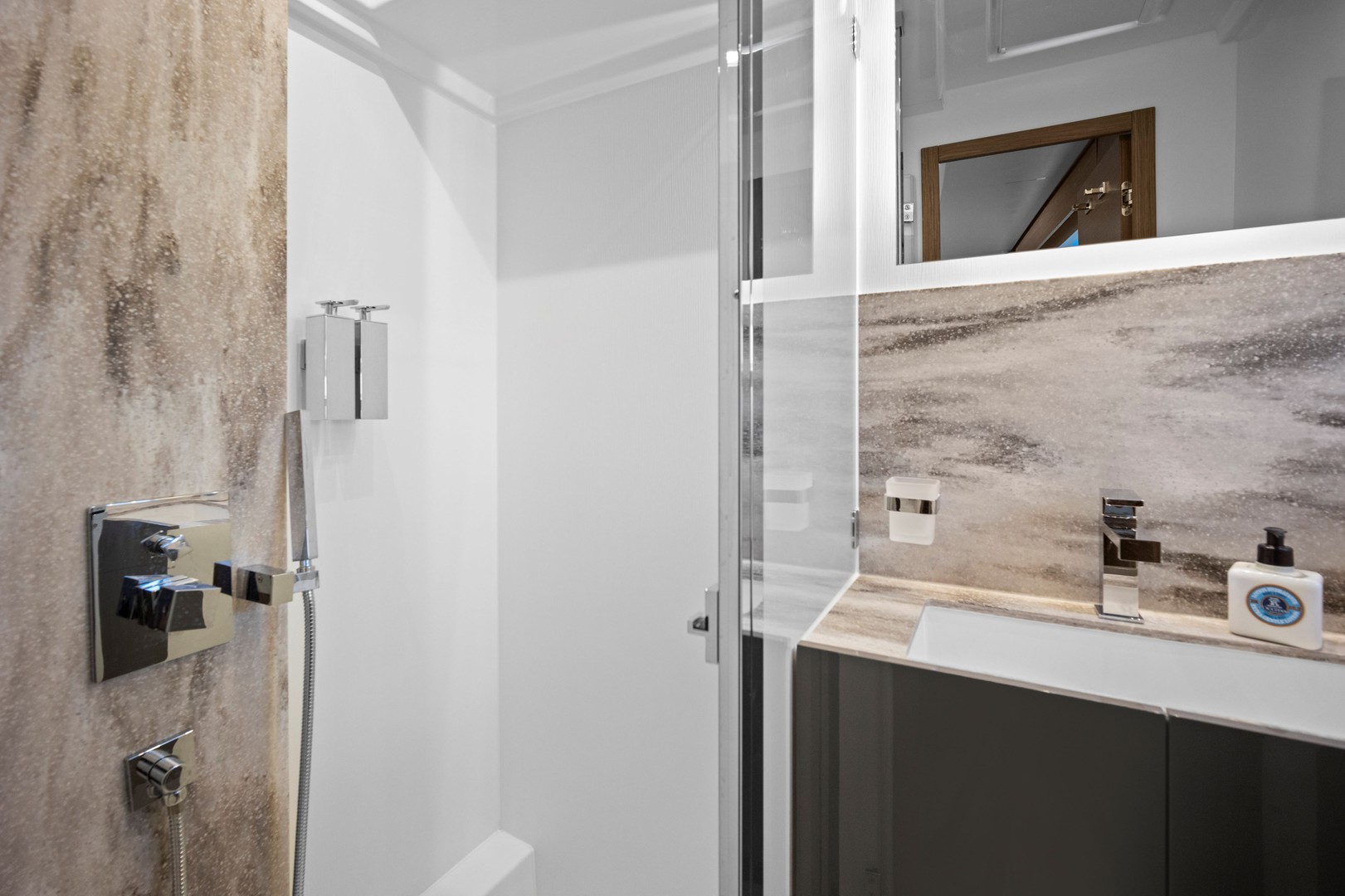 Cuenta con 3 cabinas dobles con baño privado, aire acondicionado y vistas al mar. La suite del armador incluye un sofá convertible. Dispone de cabina independiente del patrón