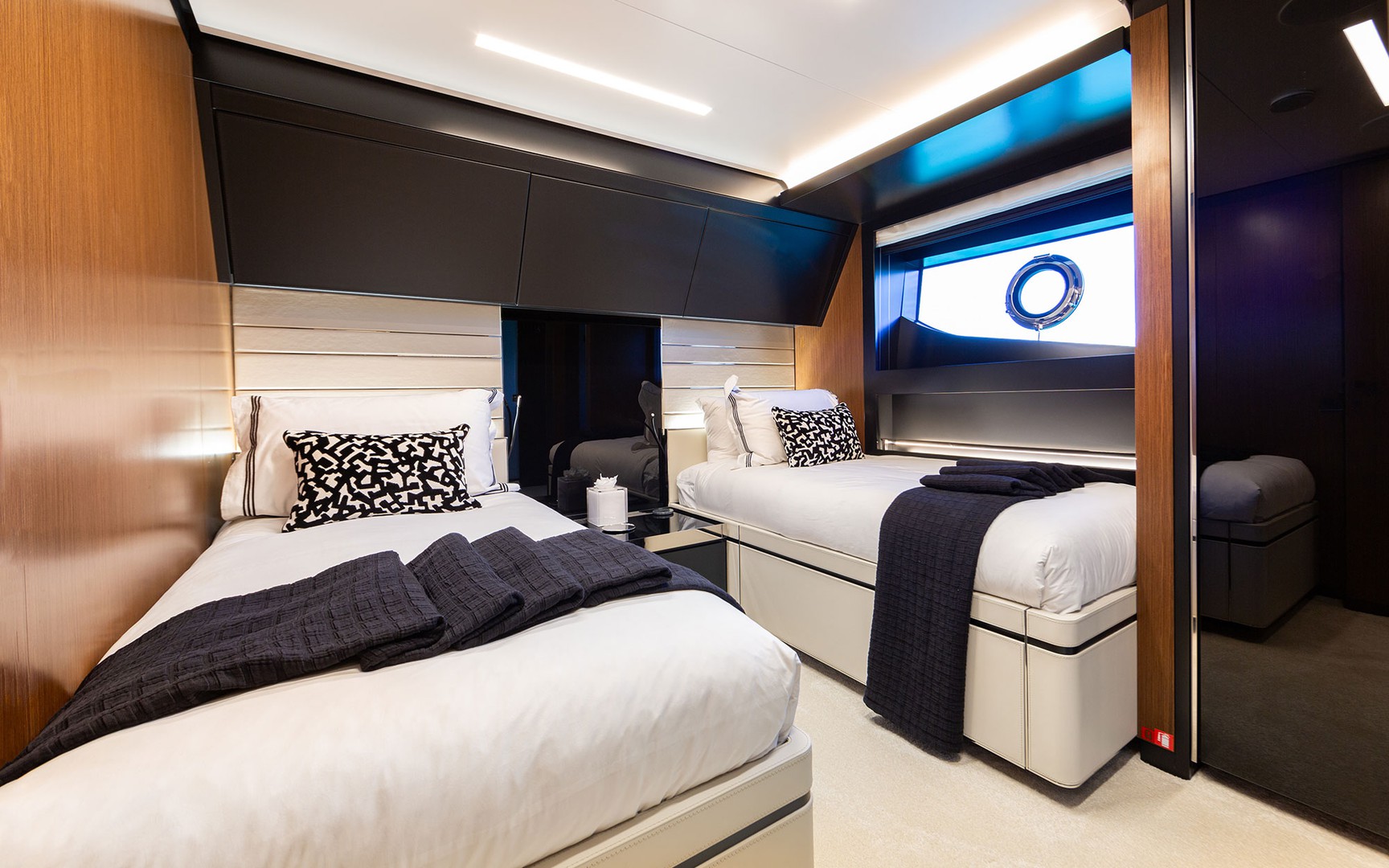 Este magnífico super yate ofrece alojamiento para hasta 10 huéspedes distribuidos en cinco suites de lujo: una impresionante suite principal en la cubierta principal, dos elegantes camarotes dobles y un camarote con dos camas individuales, además de una configuración convertible para una máxima versatilidad. A bordo, una tripulación profesional de hasta 5 personas garantiza una experiencia sin preocupaciones, donde cada detalle está cuidadosamente atendido.