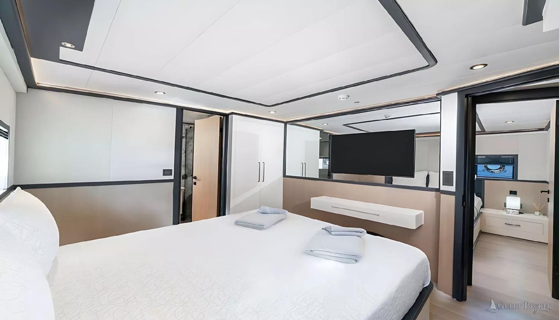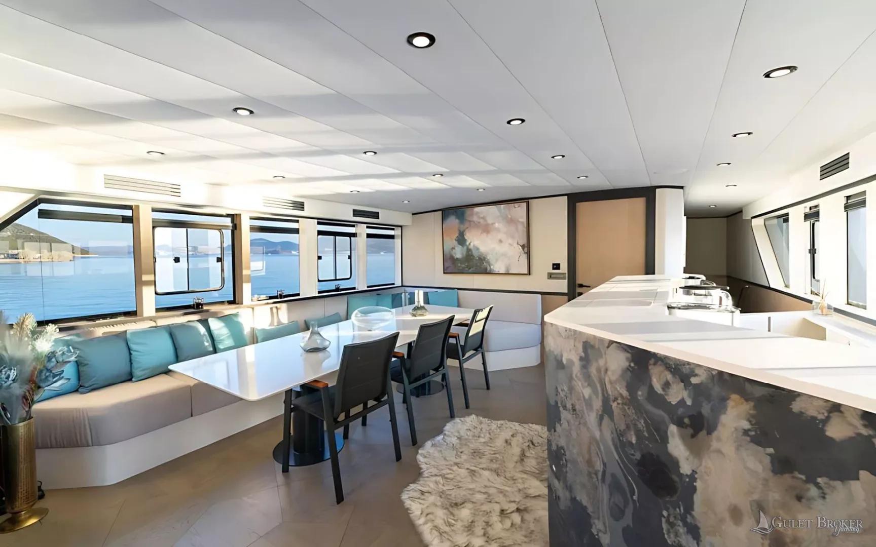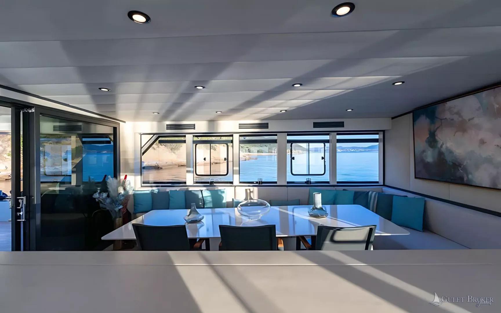 Relájate en el salón principal, con cómodos asientos y grandes ventanales que inundan de luz el espacio. El comedor elegante es perfecto para disfrutar de comidas memorables. Mantente conectado con Wi-Fi y disfruta de entretenimiento de última generación mientras navegas por aguas cristalinas.