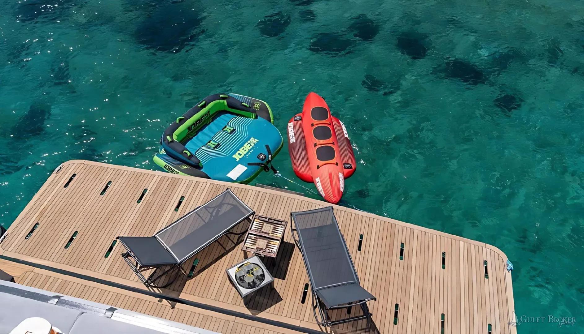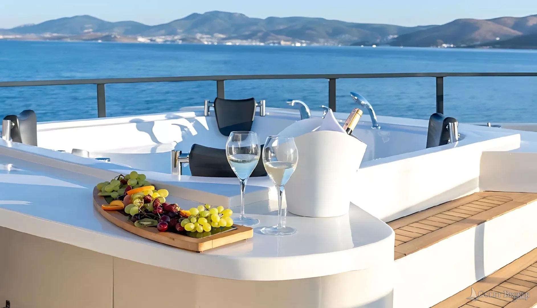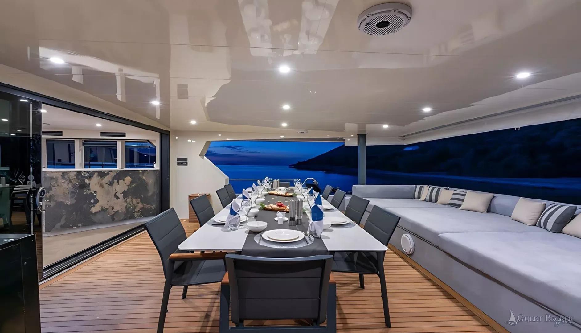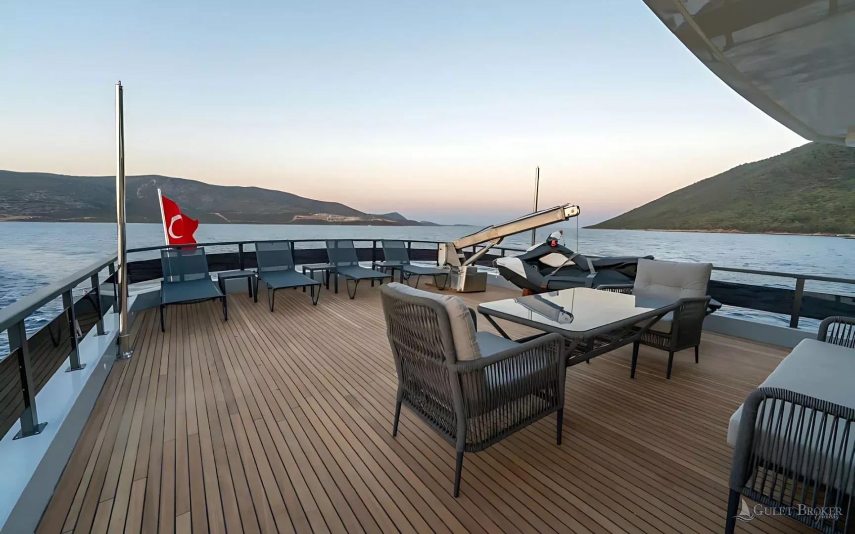 Disfruta del aire libre en el comedor exterior de popa, ideal para cenas bajo las estrellas, o toma el sol en las amplias tumbonas de la cubierta de proa. La cubierta ofrece espacios de relax y zonas de sombra, pensadas para que cada momento en el barco sea perfecto.
