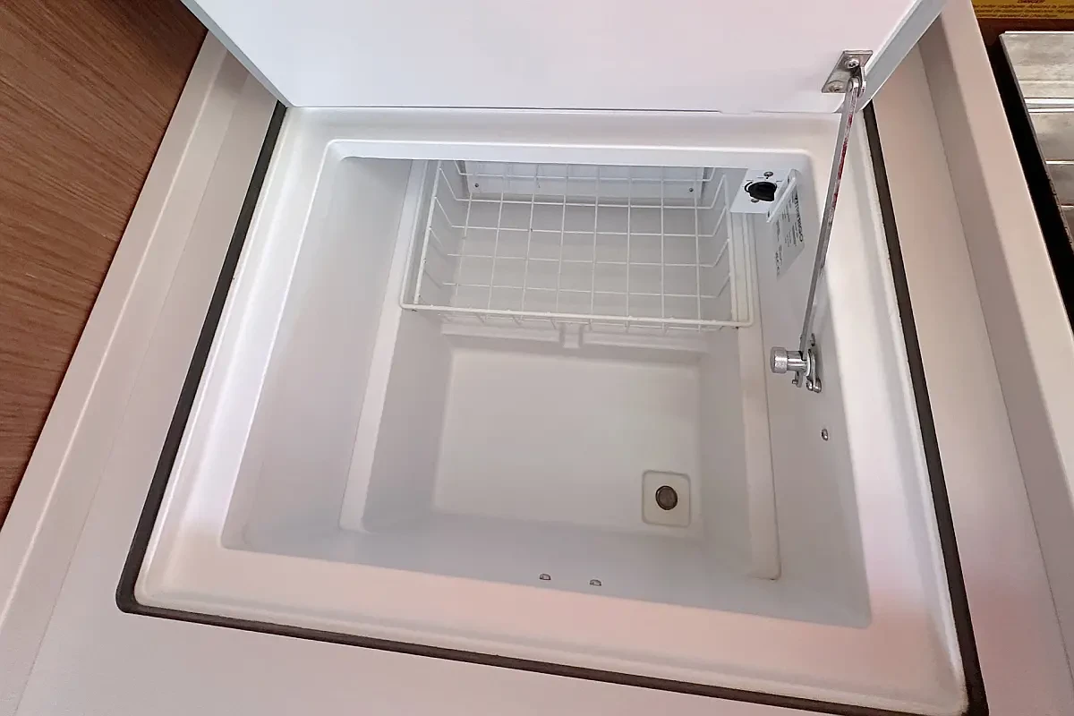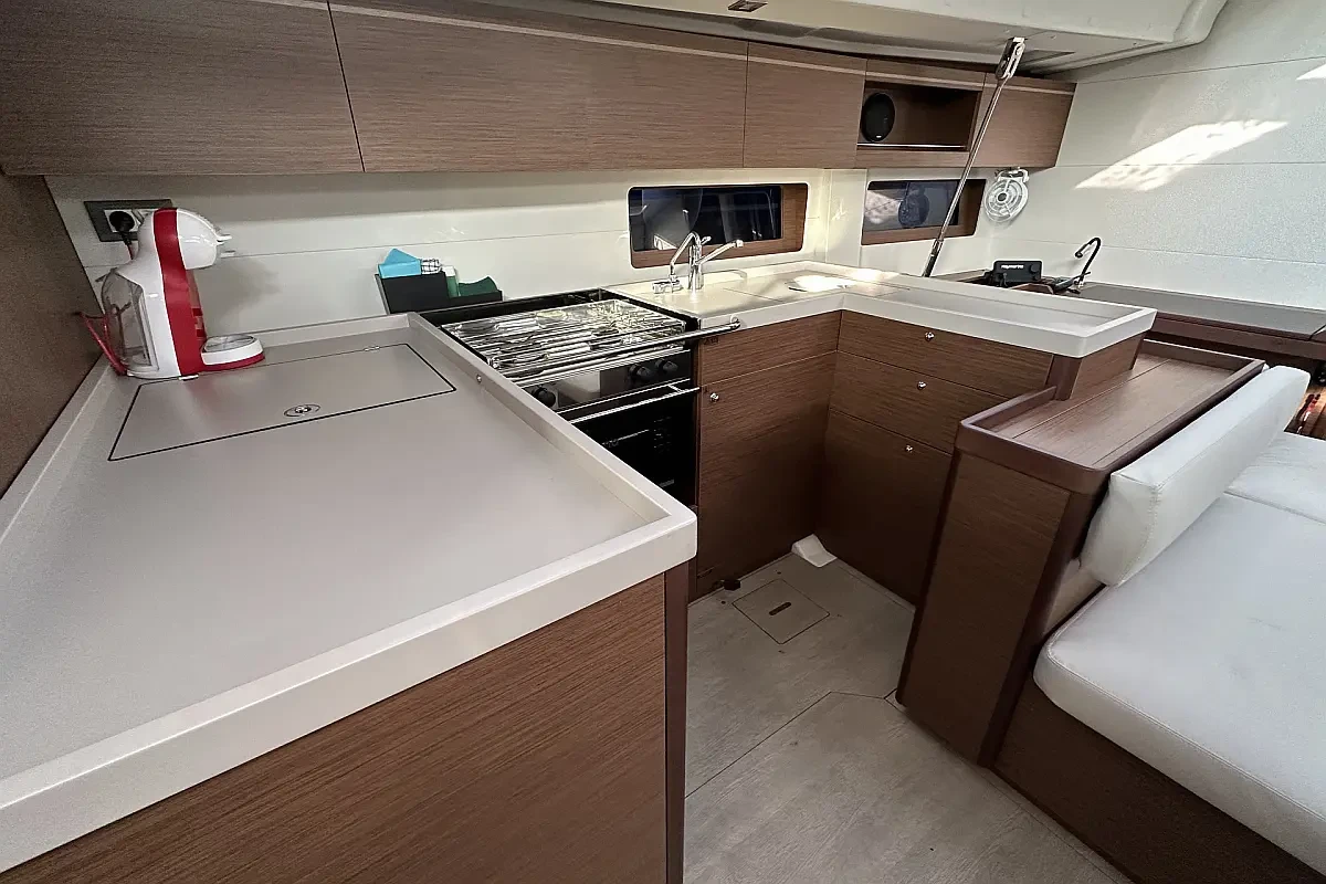 La cocina en U totalmente equipada, junto con la zona de salón, proporciona un espacio amplio para convivir cómodamente tanto durante la navegación como en fondeo.
