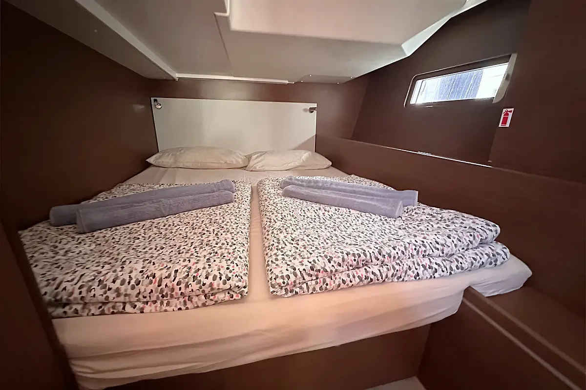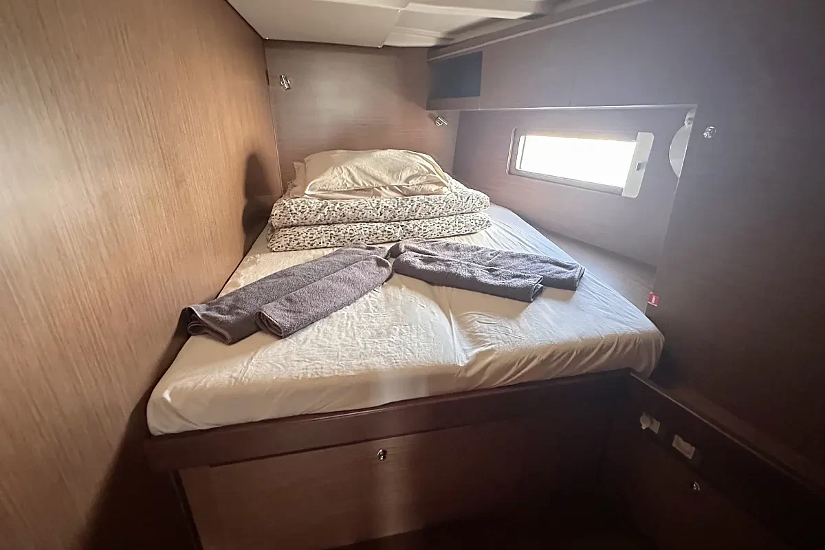 Con sus casi 16 metros de eslora, este velero se caracteriza por su amplitud, luminosidad y un diseño elegante y funcional. Su distribución interior incluye 5 cabinas dobles (una con literas) más salón convertible, lo que permite alojar cómodamente hasta 12 personas en pernocta. Cuenta con 3 baños completos, bien distribuidos para mayor comodidad a bordo.